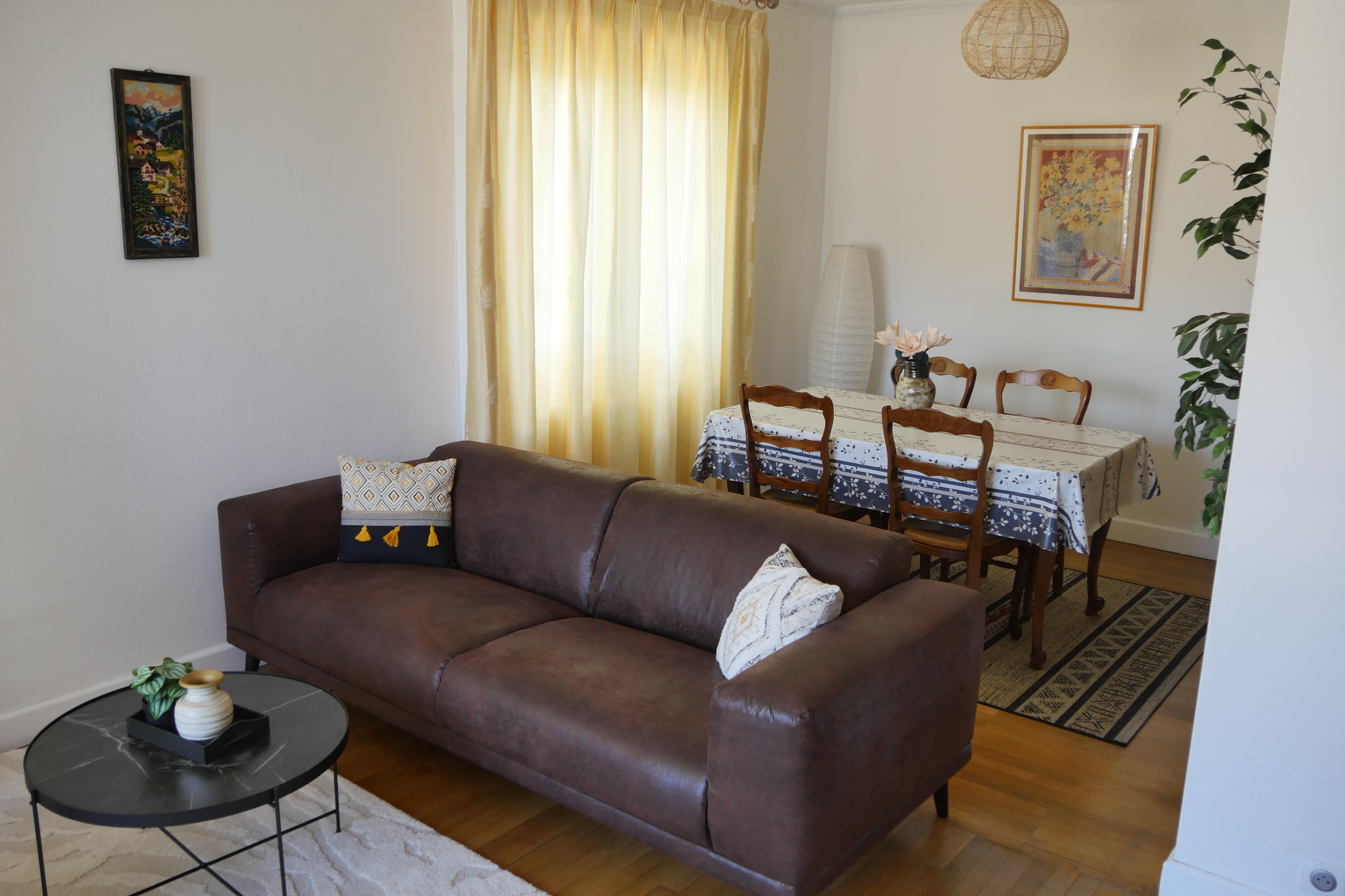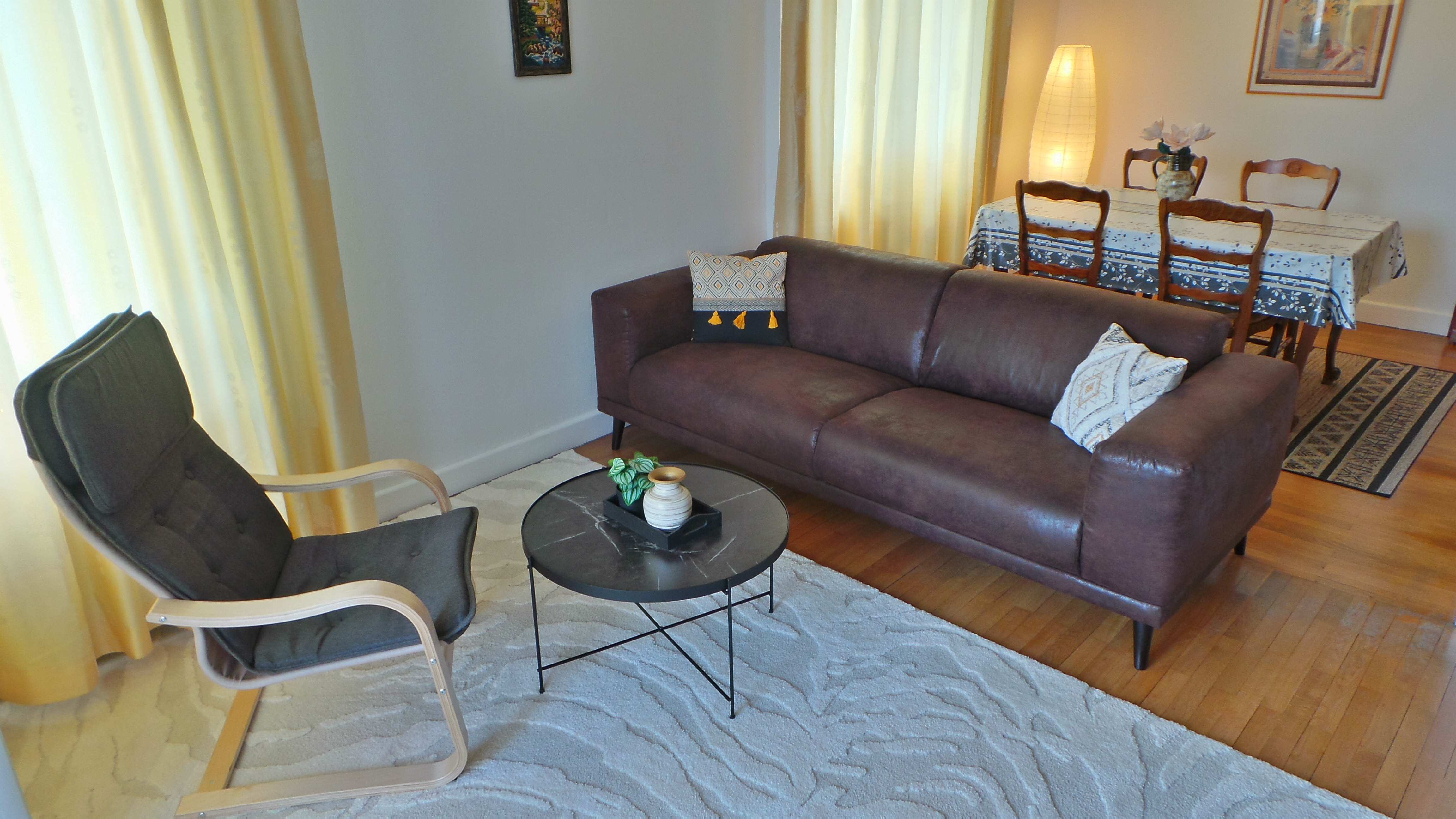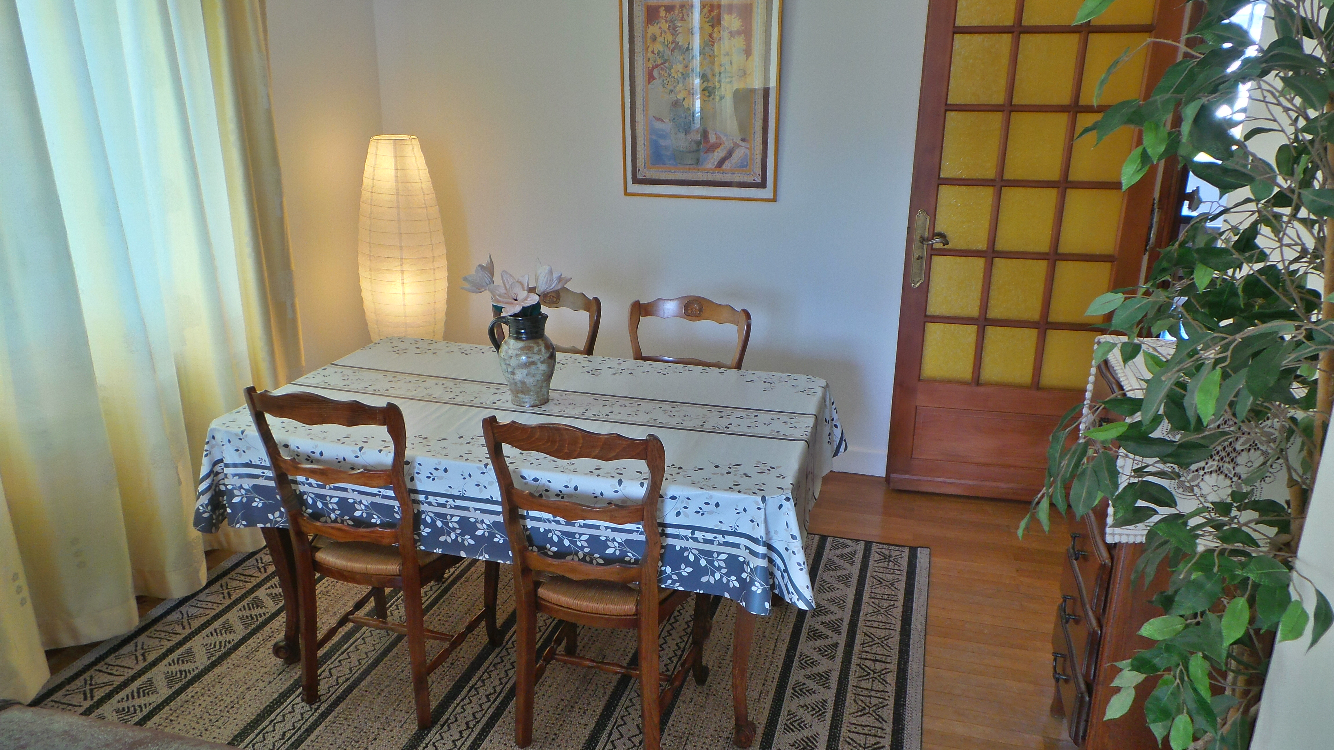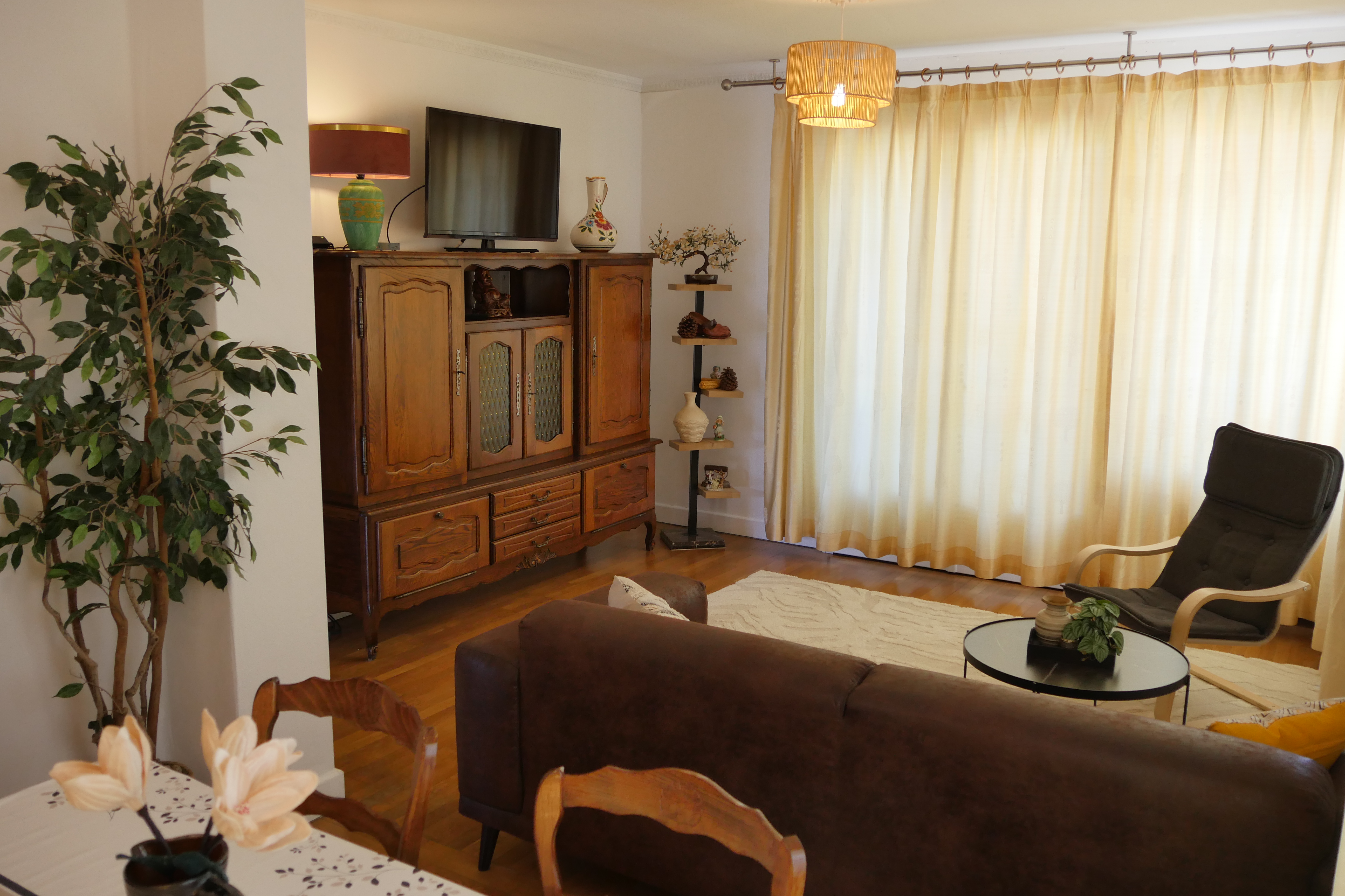 - séjour-salon (23 m2), table, 4 chaises, canapé, fauteuil, table basse, TV connectée 102 cm, internet fibre wifi, vaisselier, ouvert sur loggia orientée soleil levant-montagnes, table ronde, fauteuils en rotin