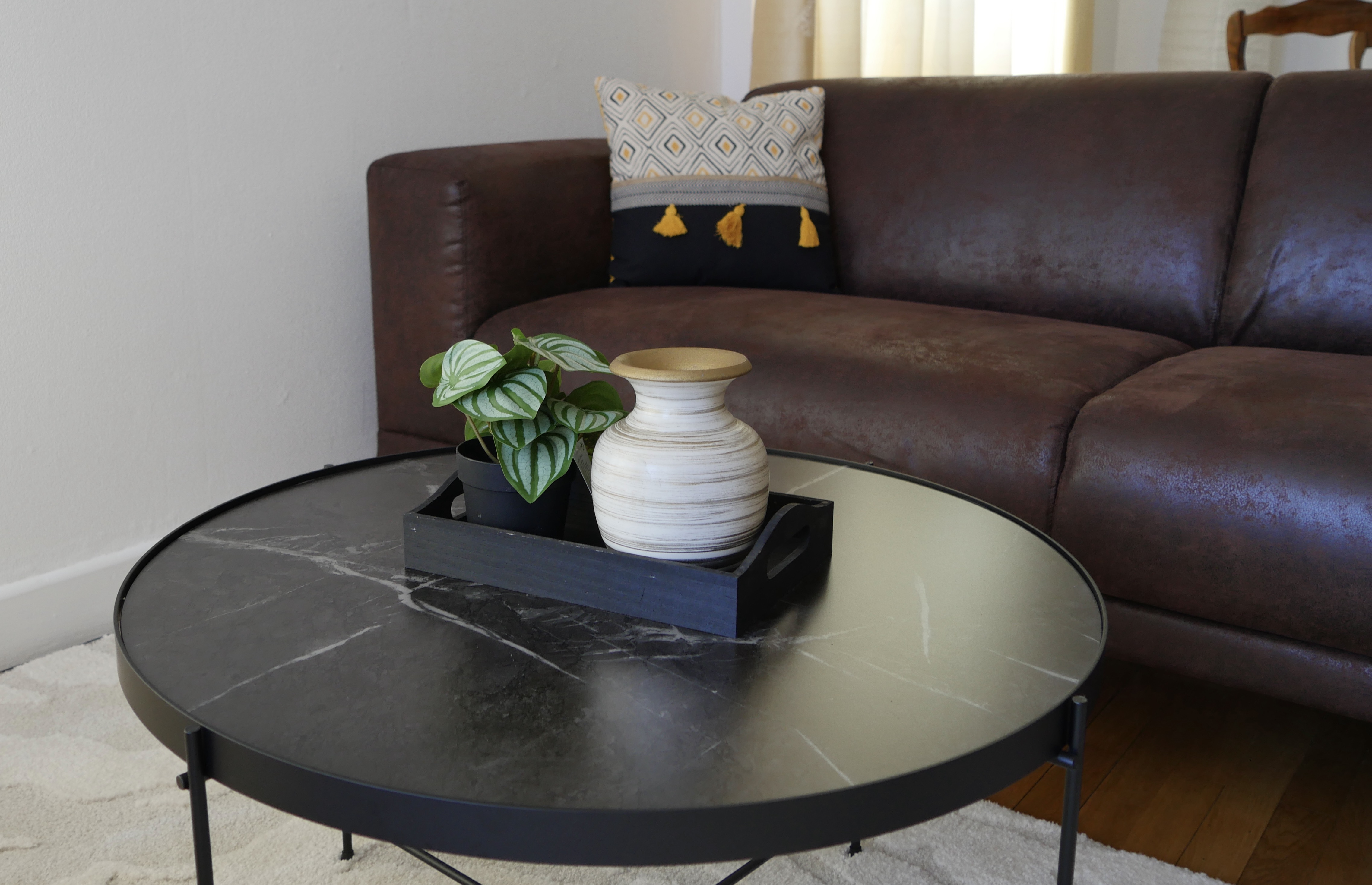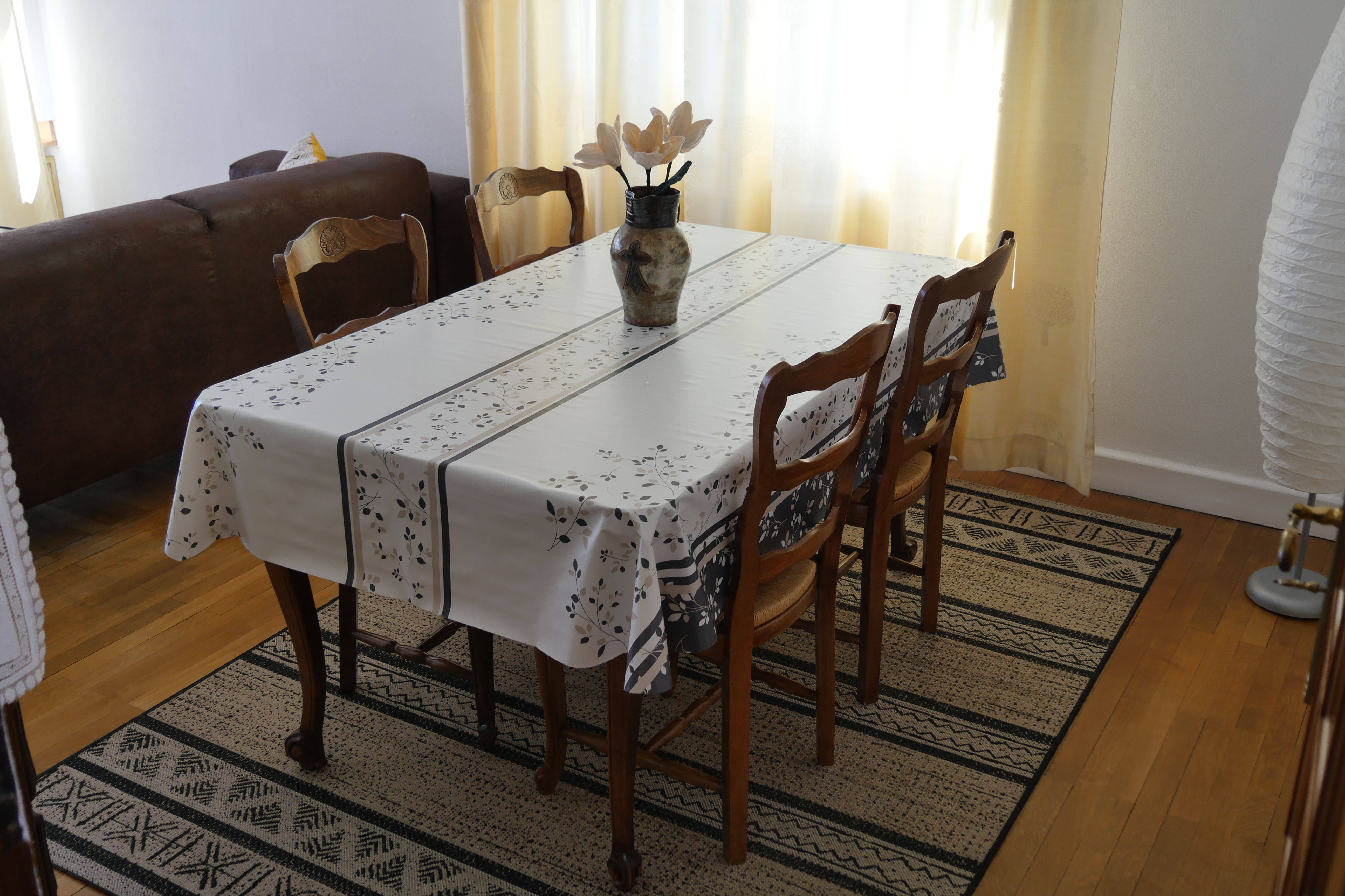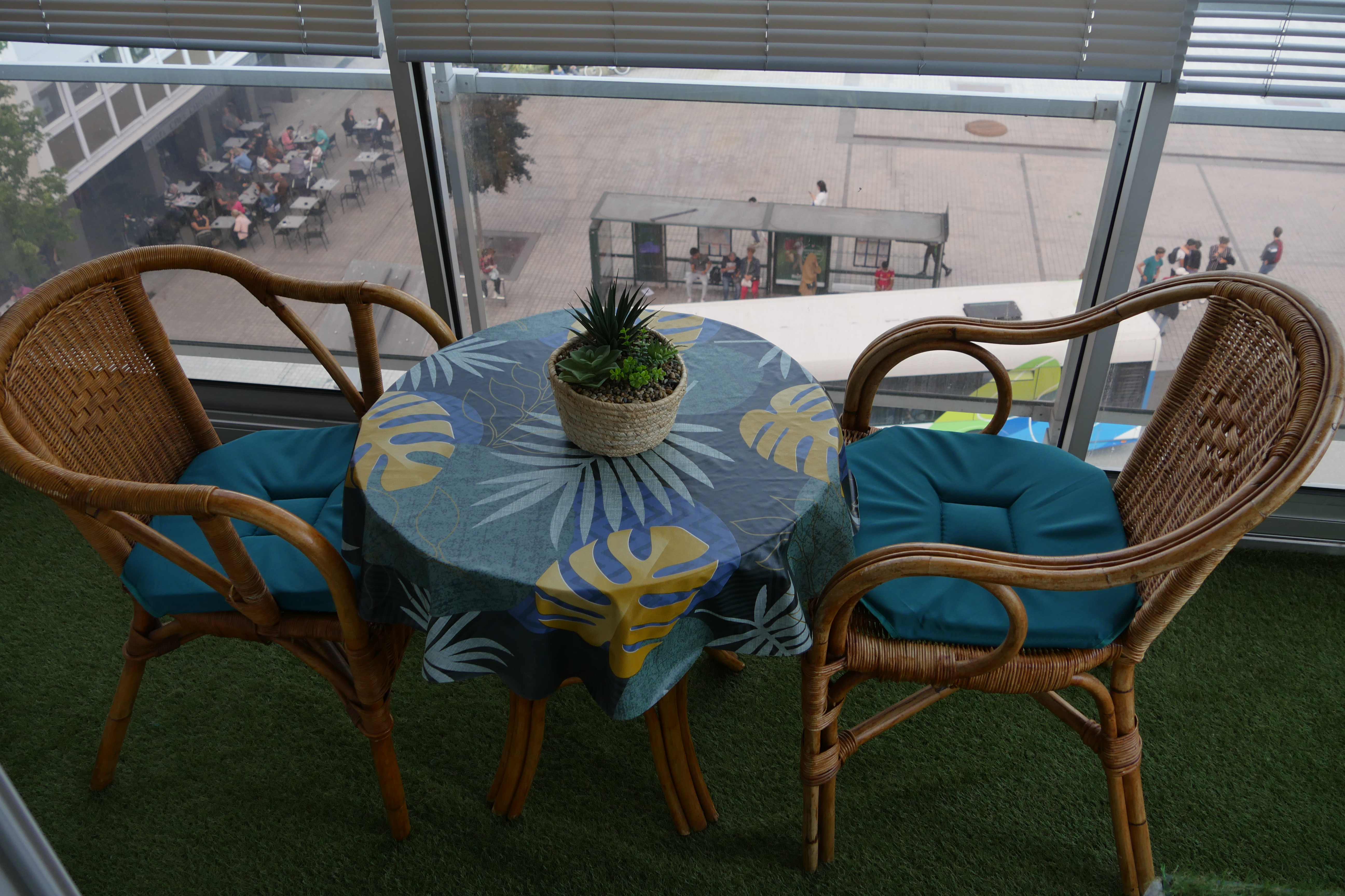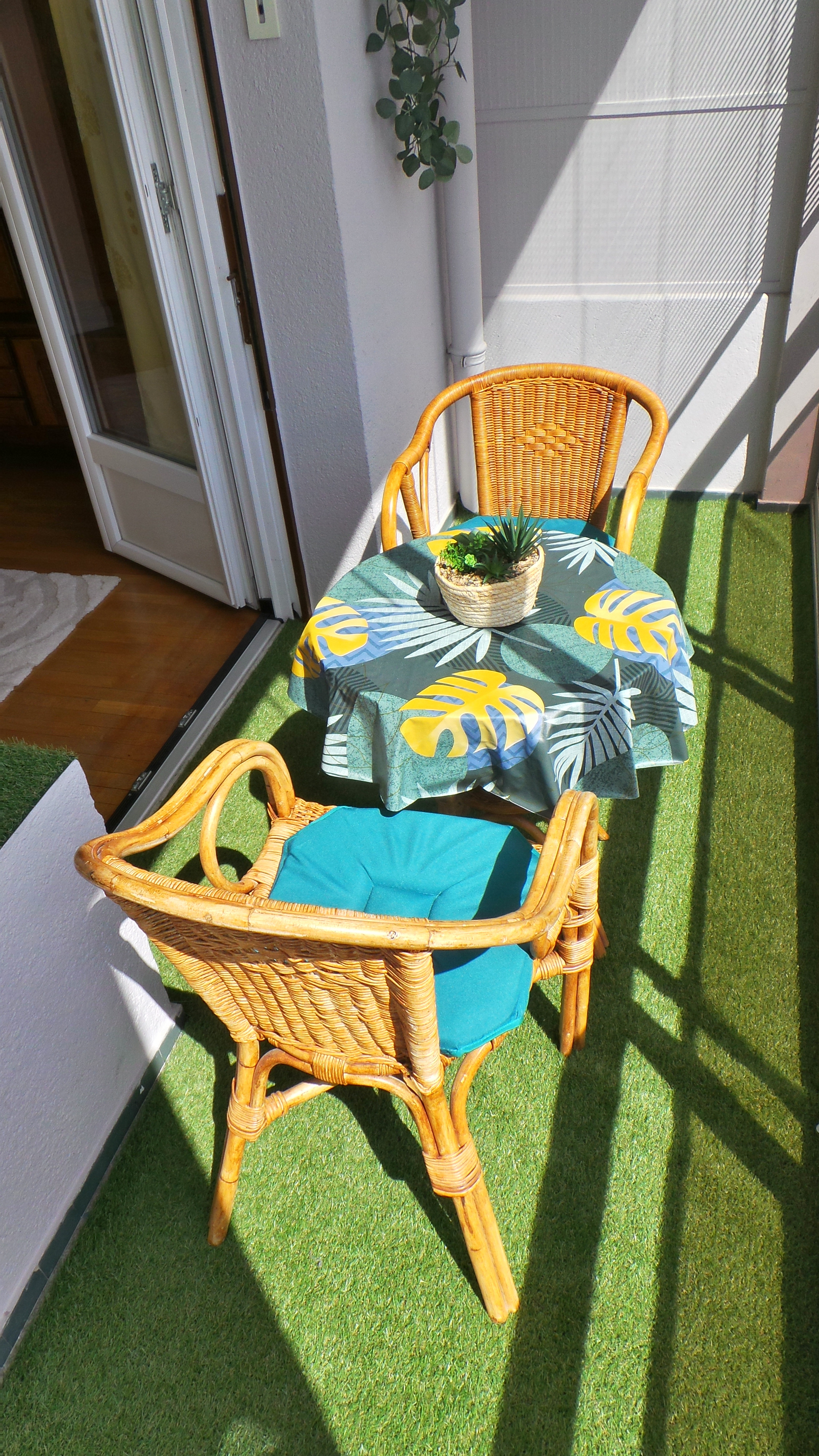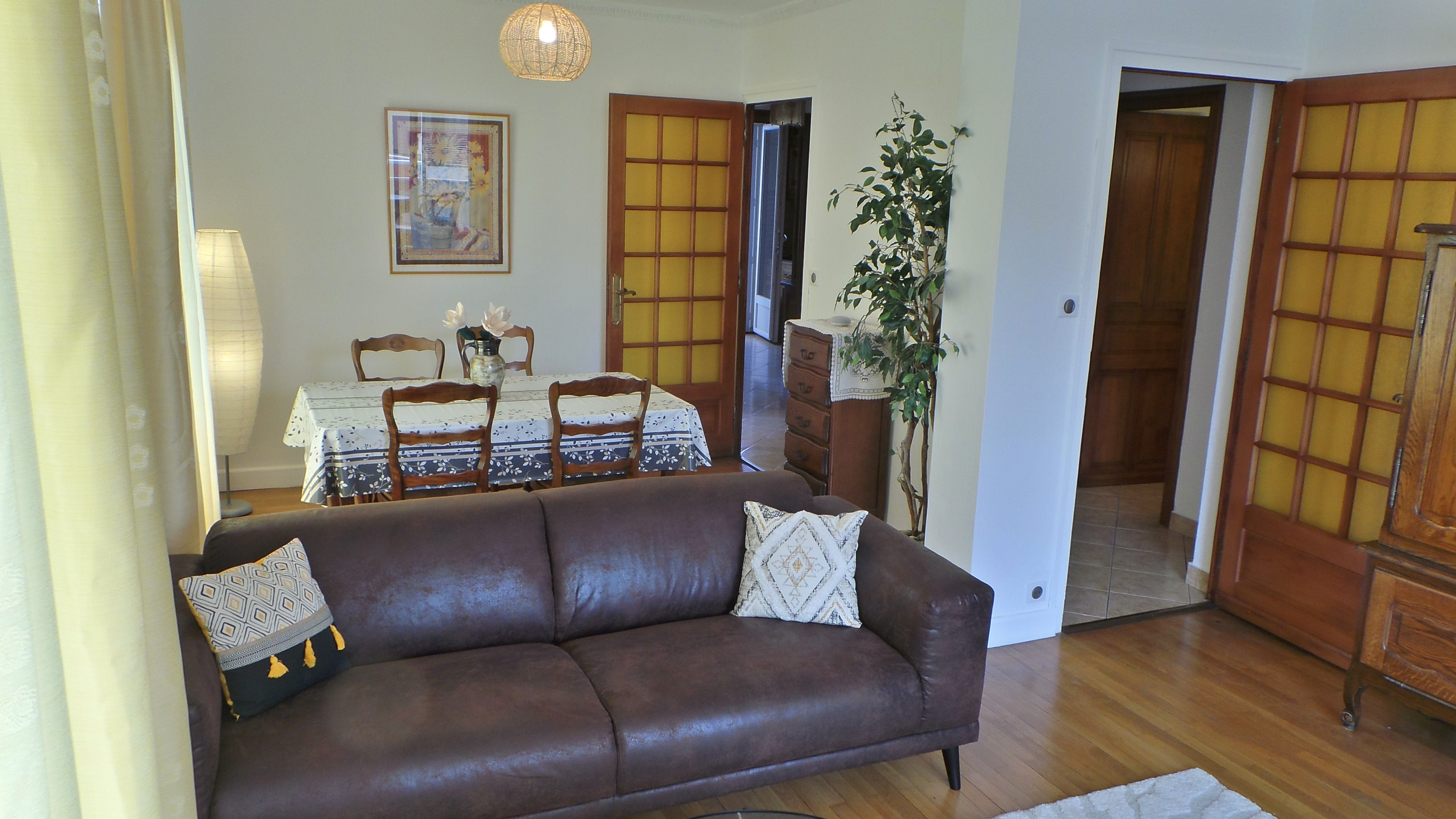 - séjour-salon (23 m2), table, 4 chaises, canapé, fauteuil, table basse, TV connectée 102 cm, internet fibre wifi, vaisselier, ouvert sur loggia orientée soleil levant-montagnes, table ronde, fauteuils en rotin