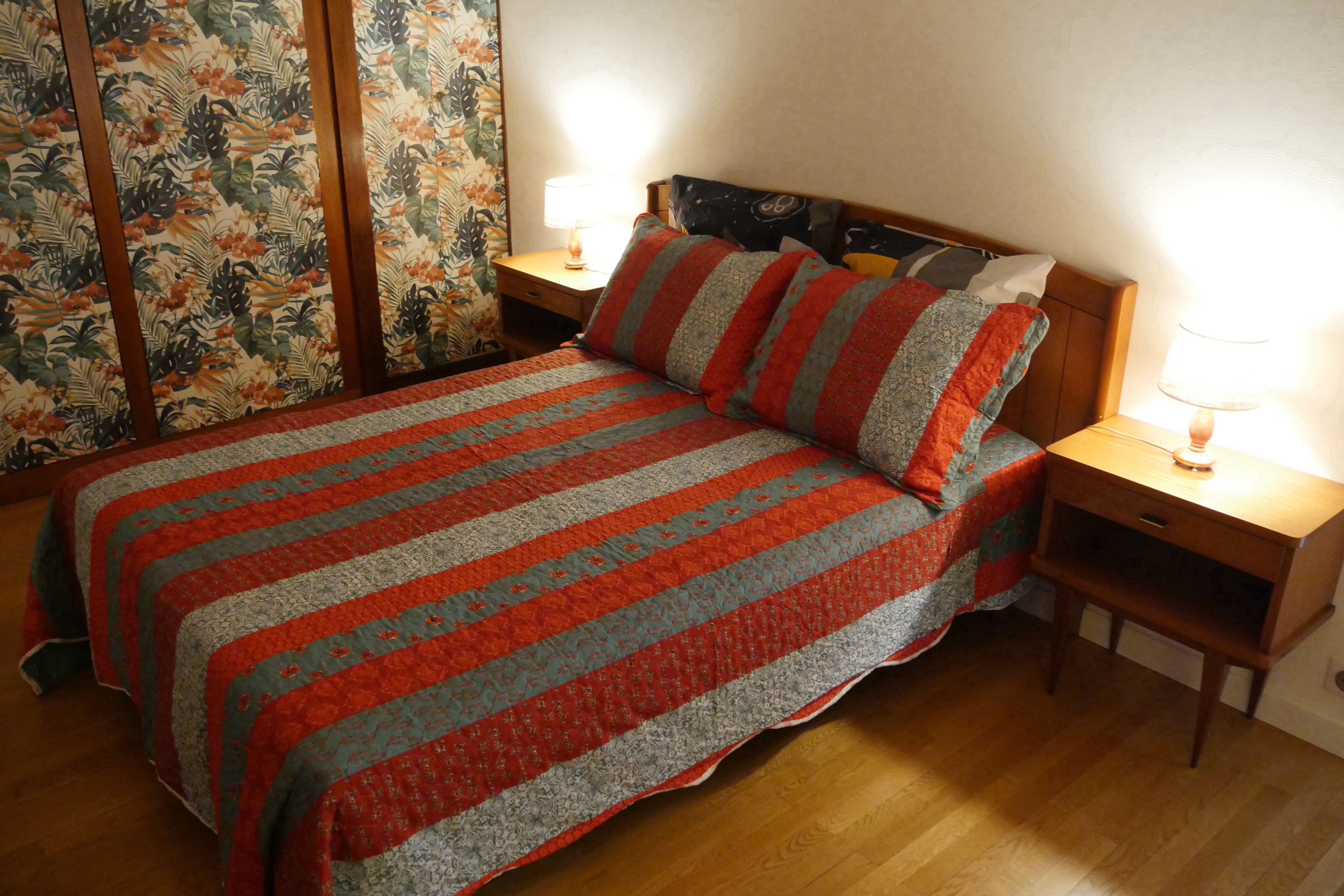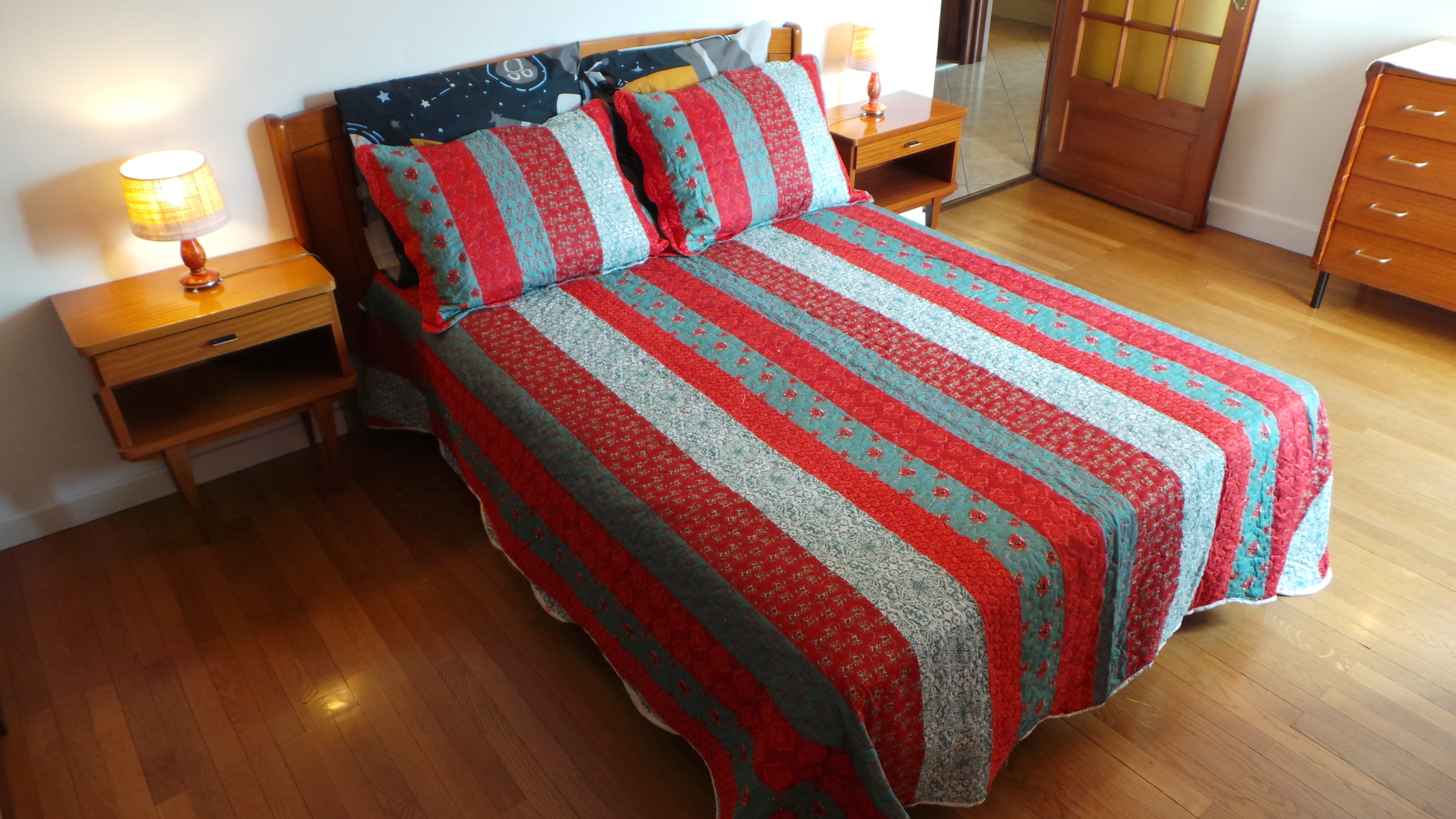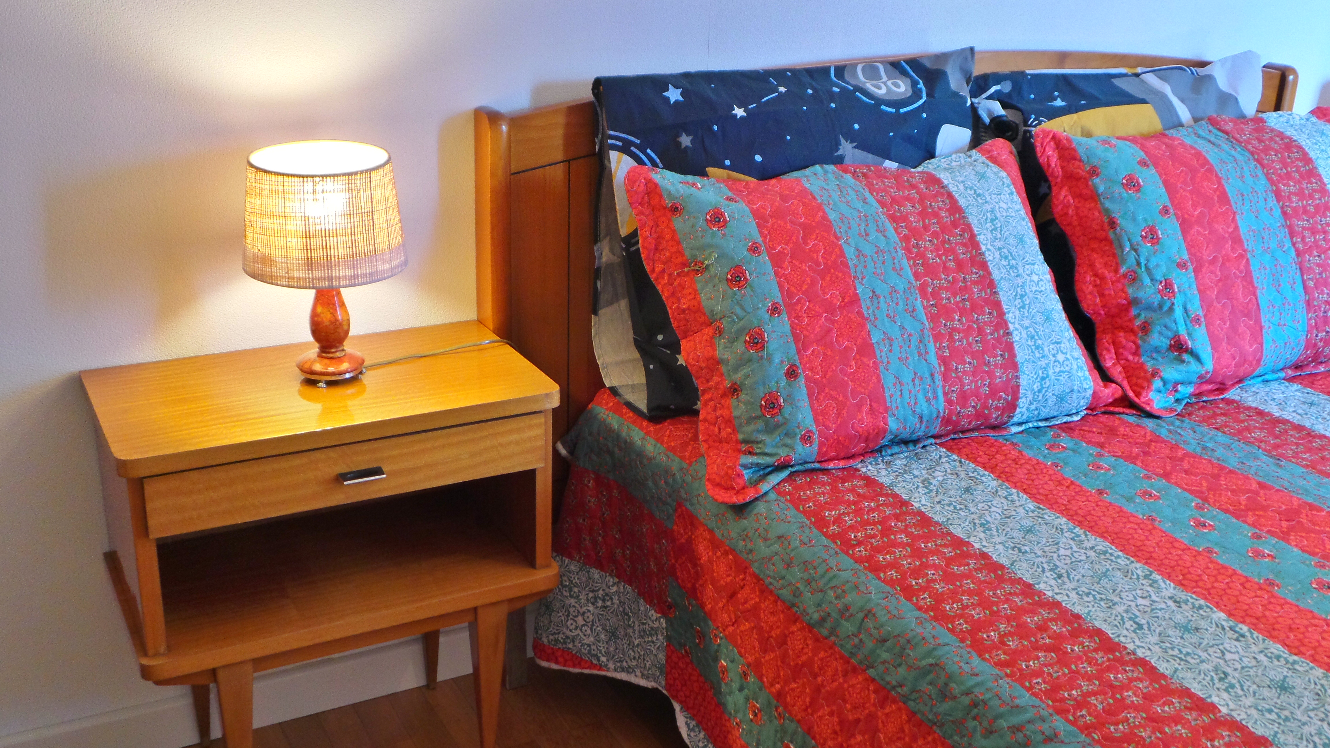 - chambre (15 m2), lit 140x190, 2 chevets, 2 lampes, commode à tiroirs, nombreux rangements, draps fournis, lit préparé