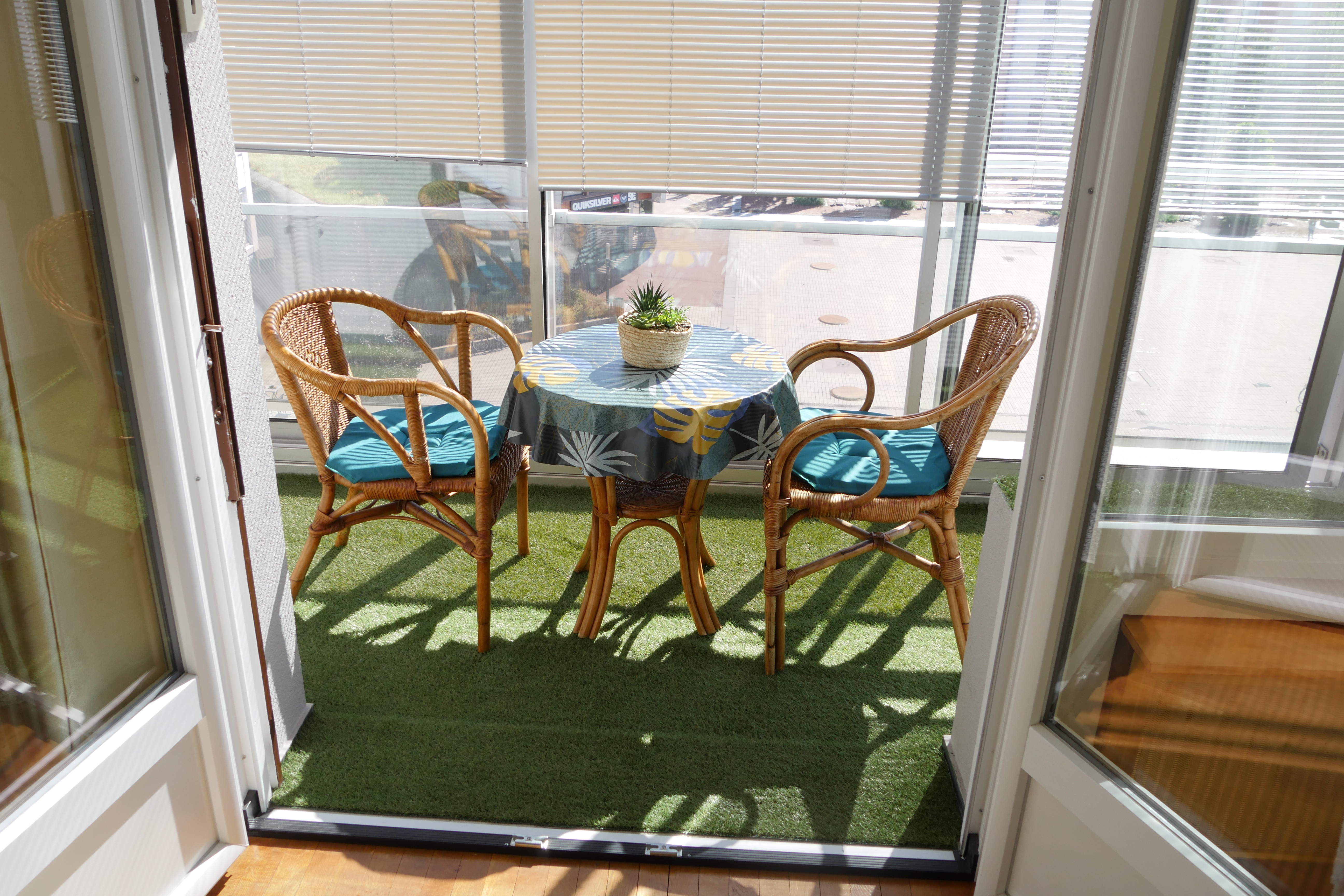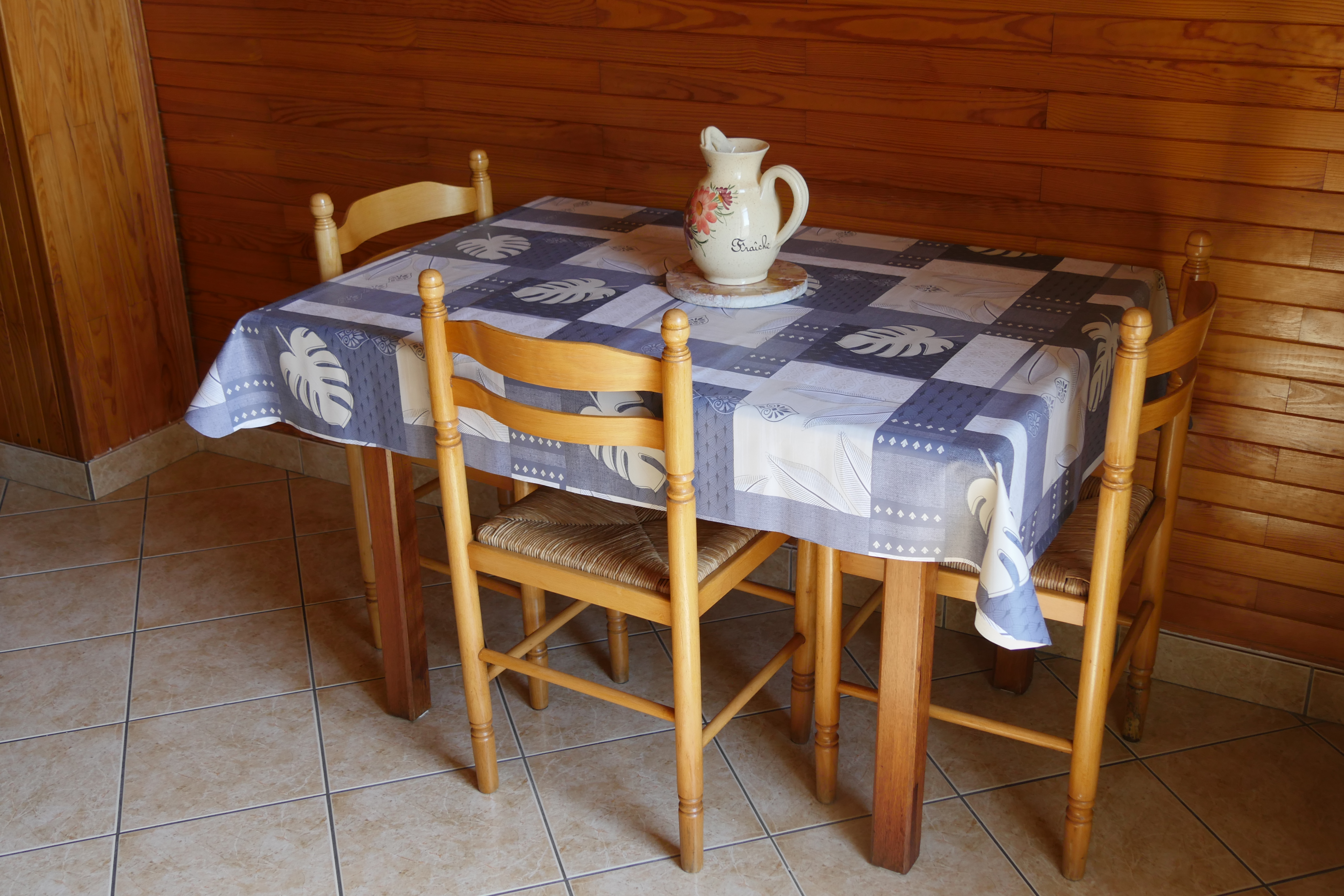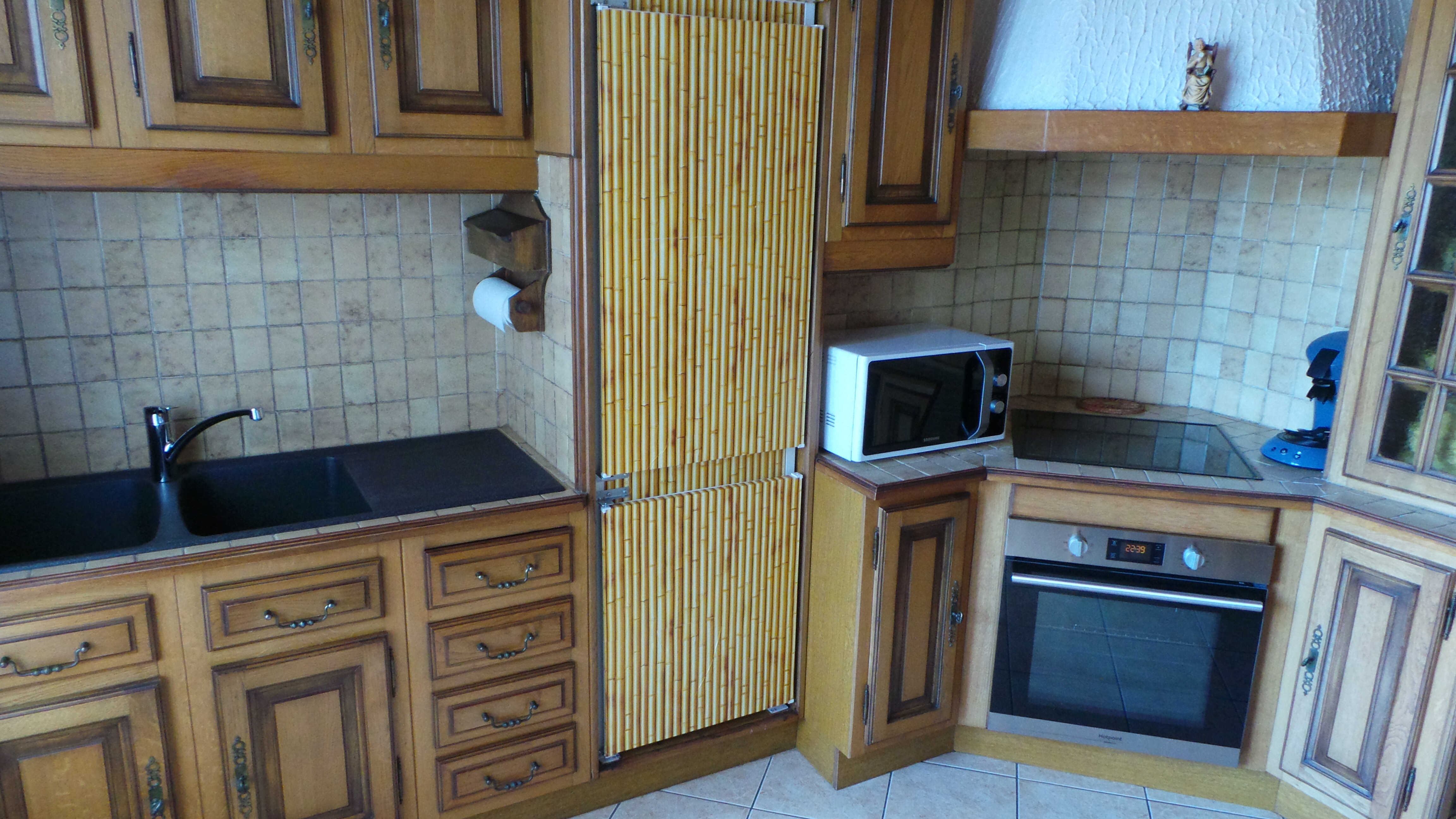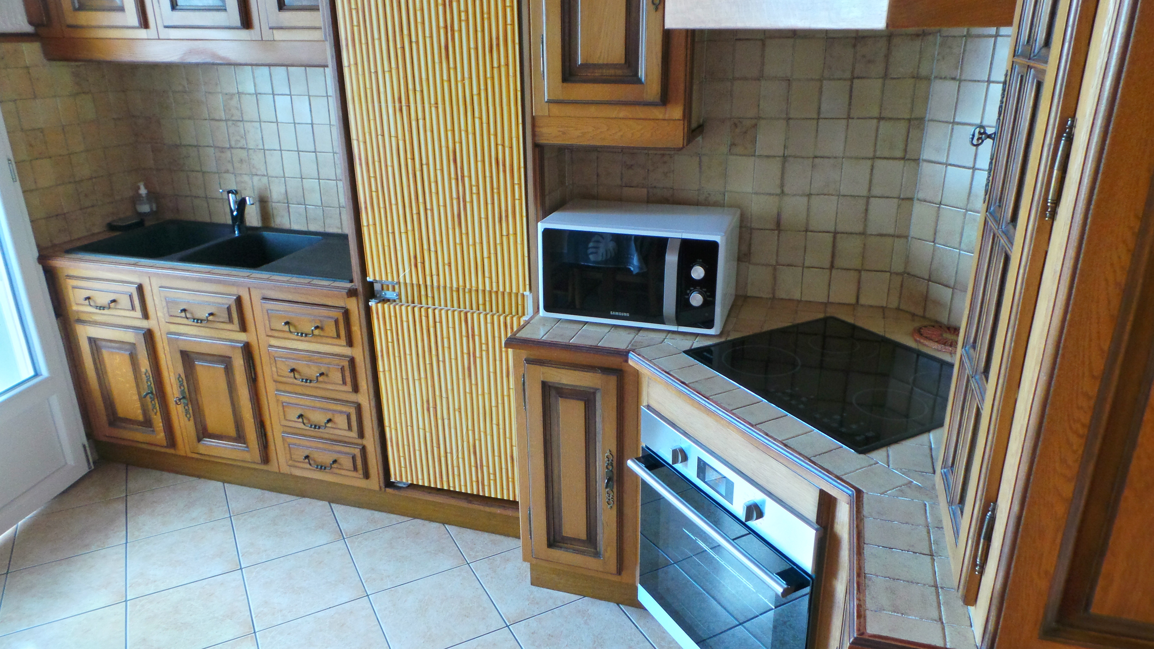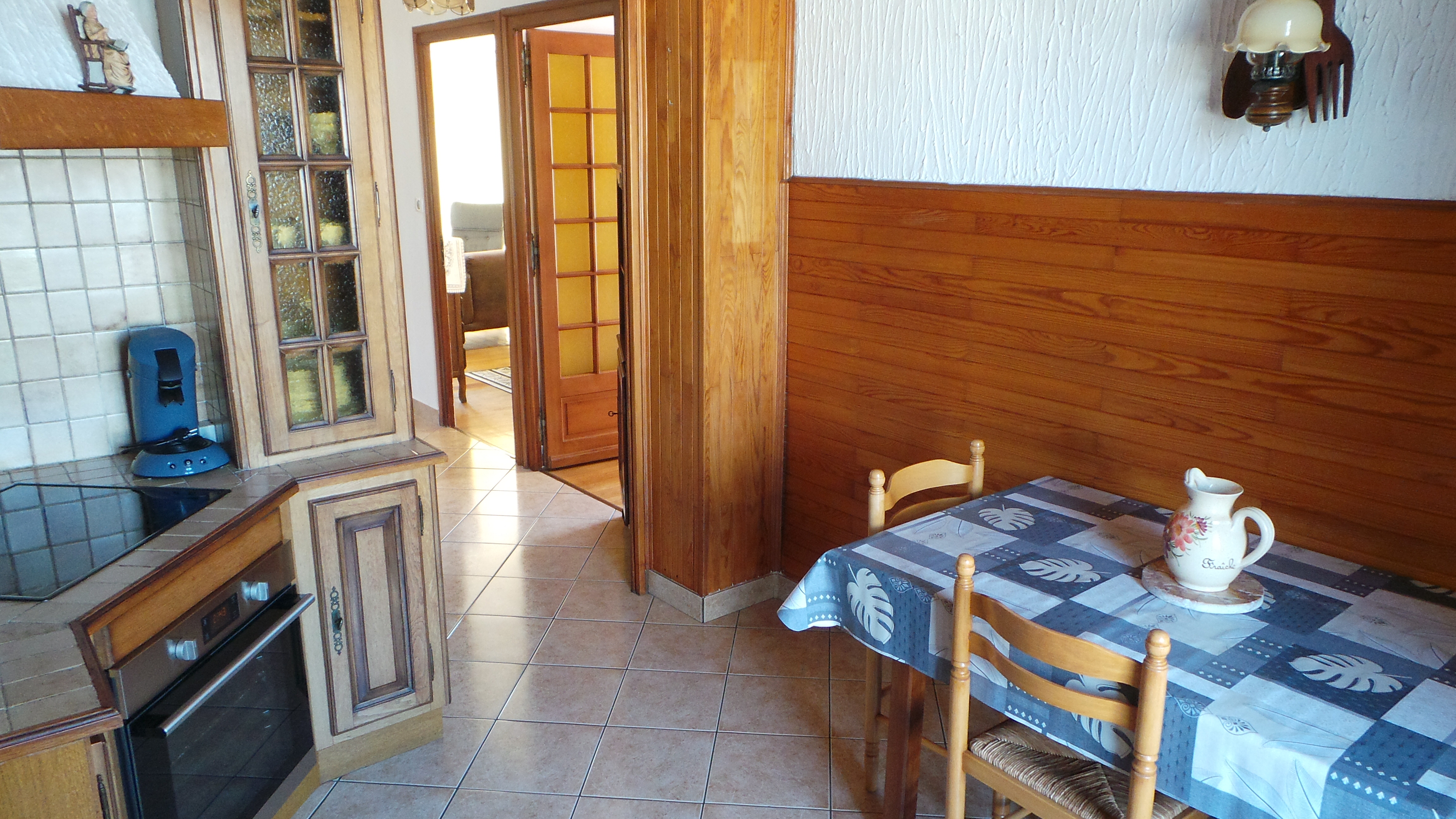- cuisine (8m2) entièrement équipée, table, 3 chaises, plaque 4 feux vitrocéramique, hotte aspirante, réfrigérateur congélateur, fours encastré et micro-onde, machines à café filtre et expresso, bouilloire, grille-pain, mixeur, ustensiles de cuisine, café, thé, tisanes pour les premiers petits déjeuners, balcon avec vide ordures, poubelle tri et étendoir