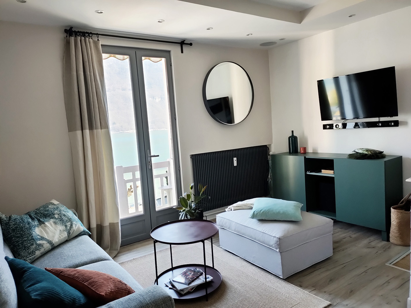 Appartement de 3 chambres à Doussard aux Sources du lac d'Annecy avec vue sur le lac et décoration contemporaine. Le lac est à moins de 30m, la plage est à une centaine de mètres. Le Duplex Lac Noisettes est idéal pour un weekend ou pour des vacances.