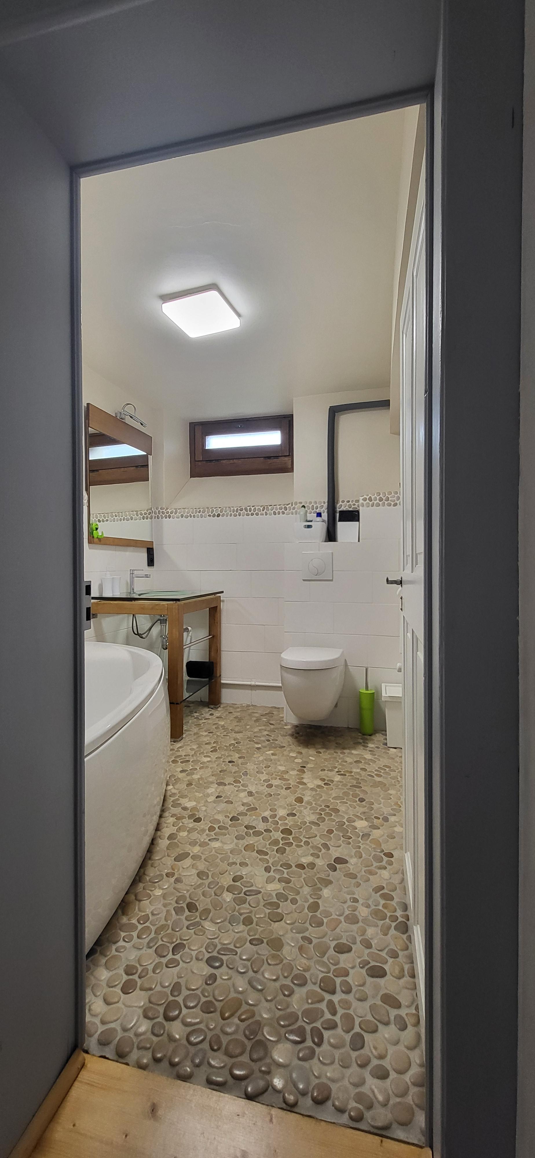 Salle d’eau (avec baignoire), WC. Sèche-cheveux et sèche-serviettes.
