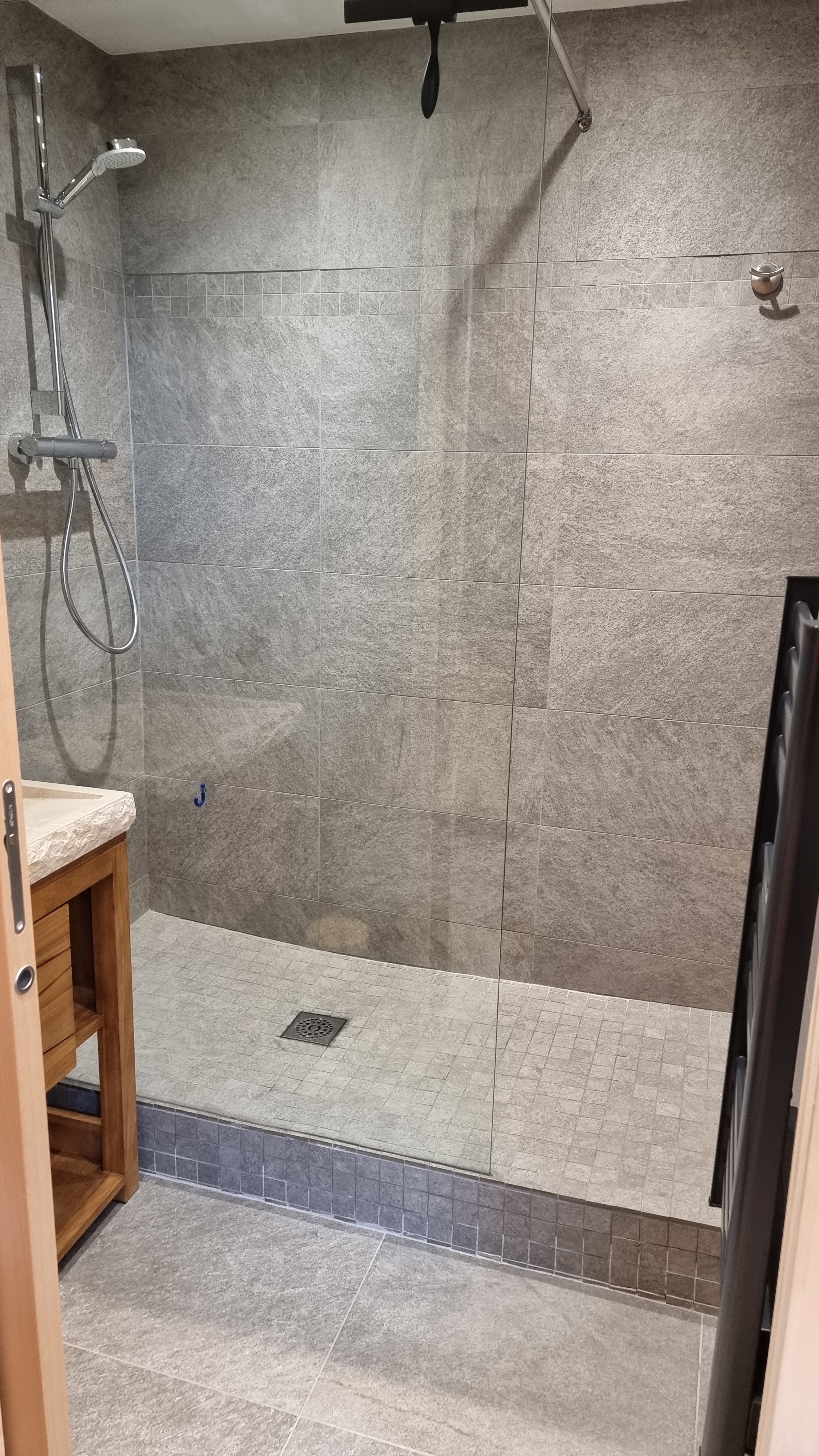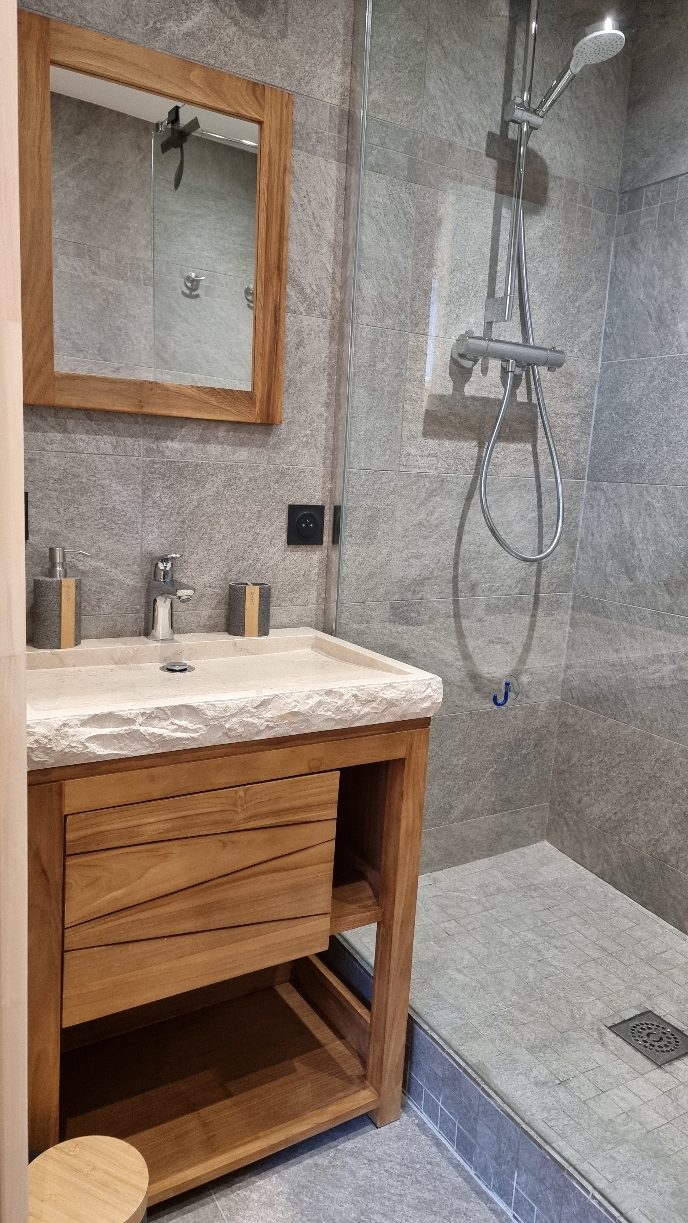 - 1 salle de douche avec douche à l'italienne, meuble vasque et sèche serviette