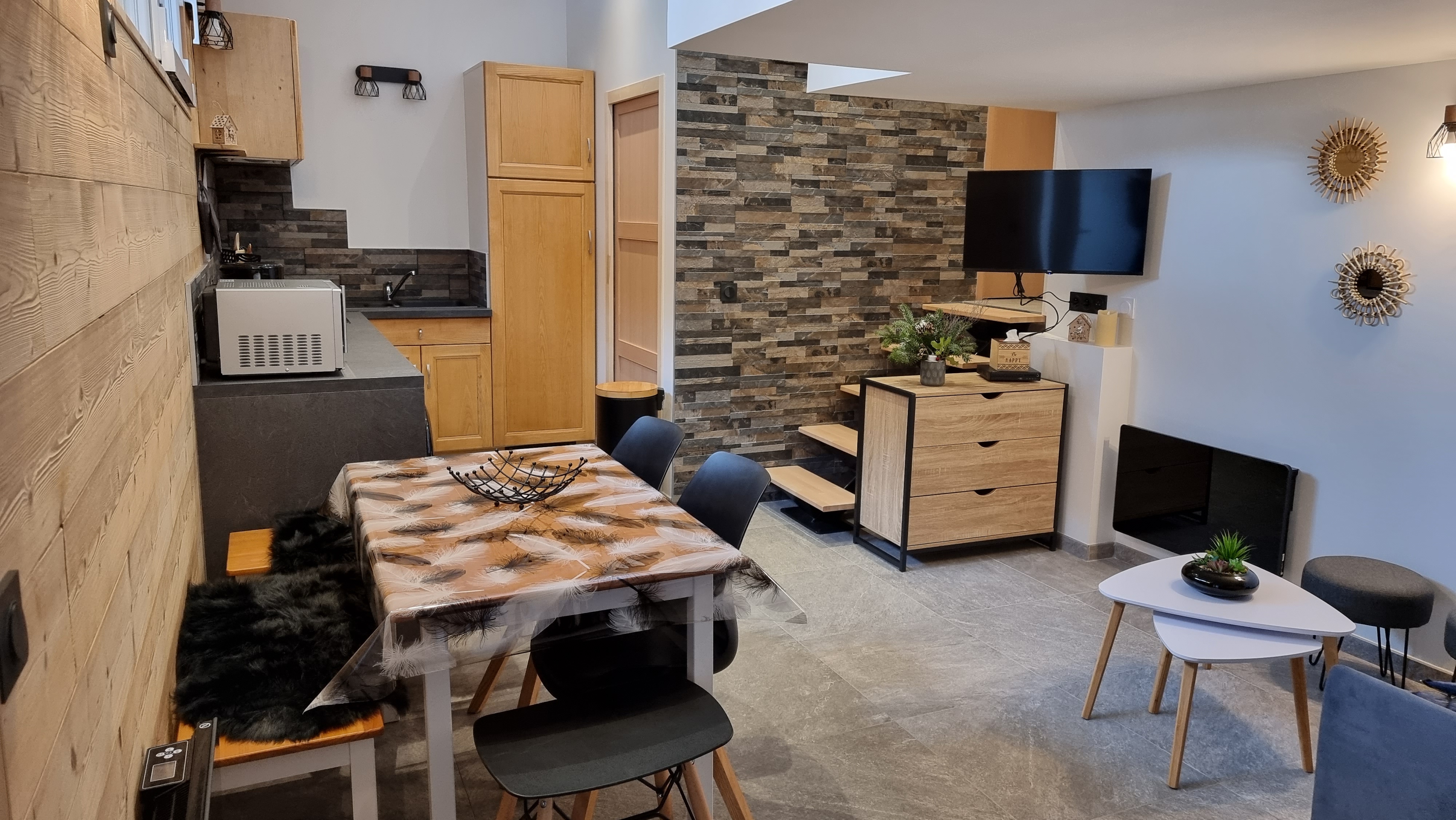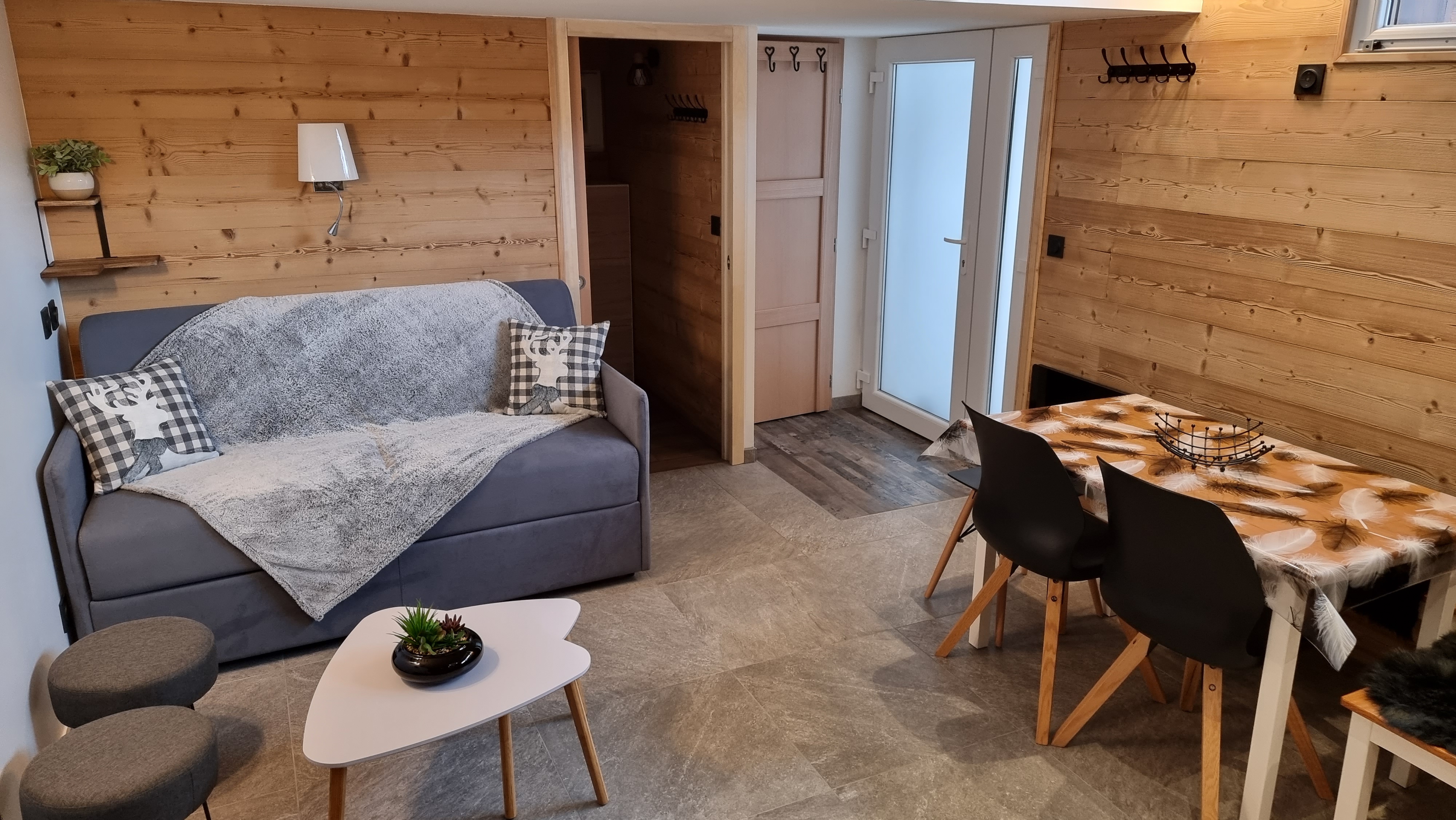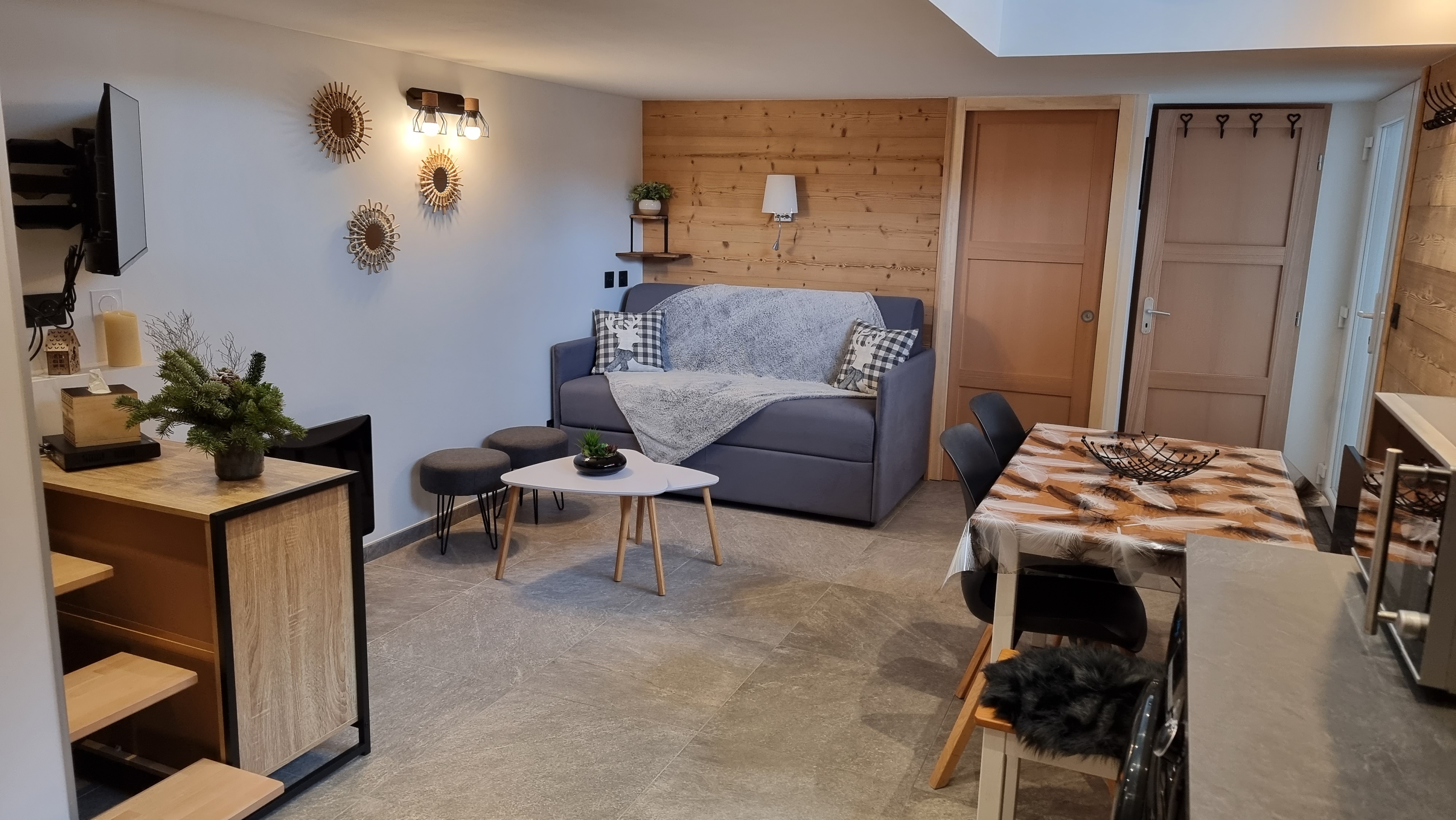A la croisée des domaines skiables du Grand Massif et des Portes du Soleil, gite de 45m2 aménagé de plain pied dans une maison comprenant également 4 autres gites.