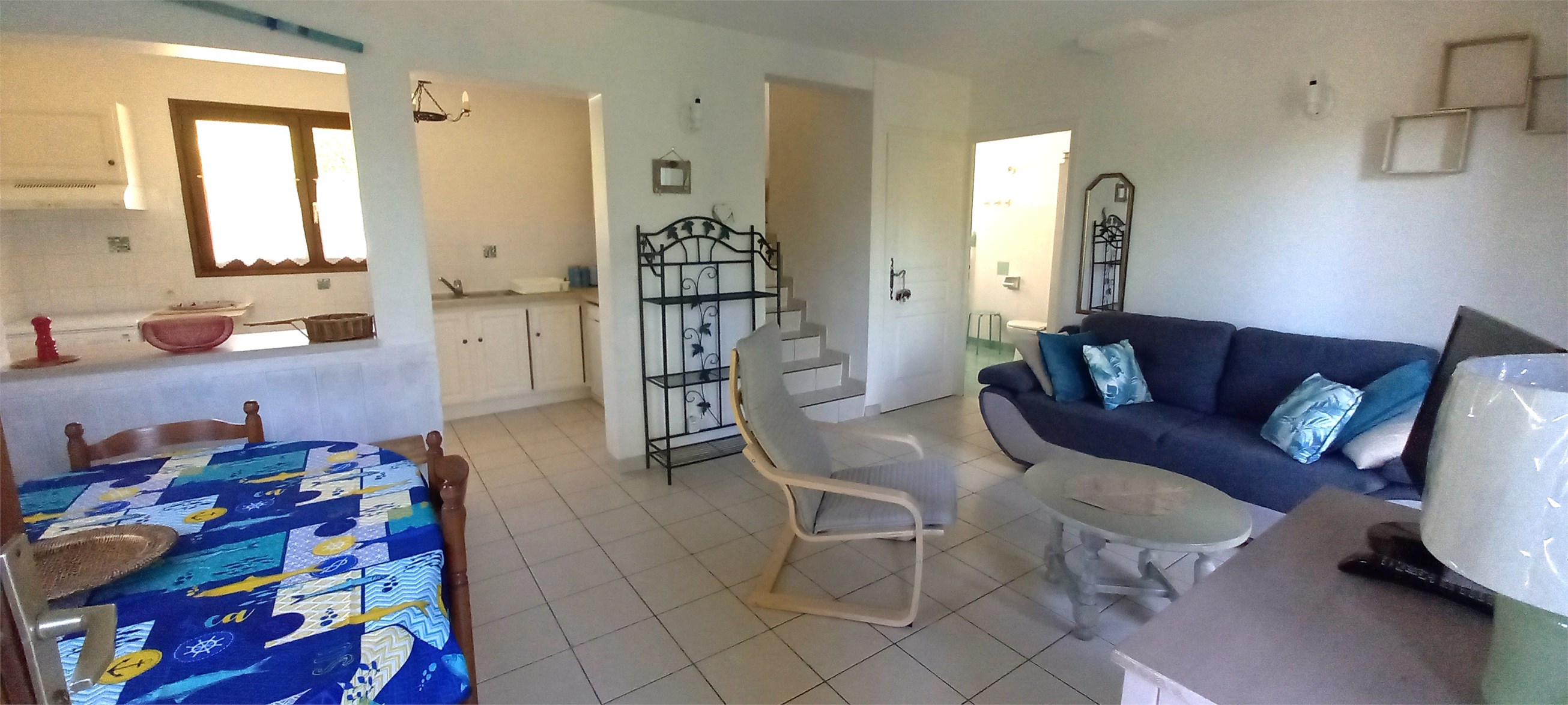 Séjour avec coin salon canapé, fauteuil, TV et coin salle à manger, cuisine américaine (Cafetière, bouilloire, grille-pain, micro-ondes, Réfrigérateur, cuisinière avec four et hotte, vaisselle), lave-vaisselle.