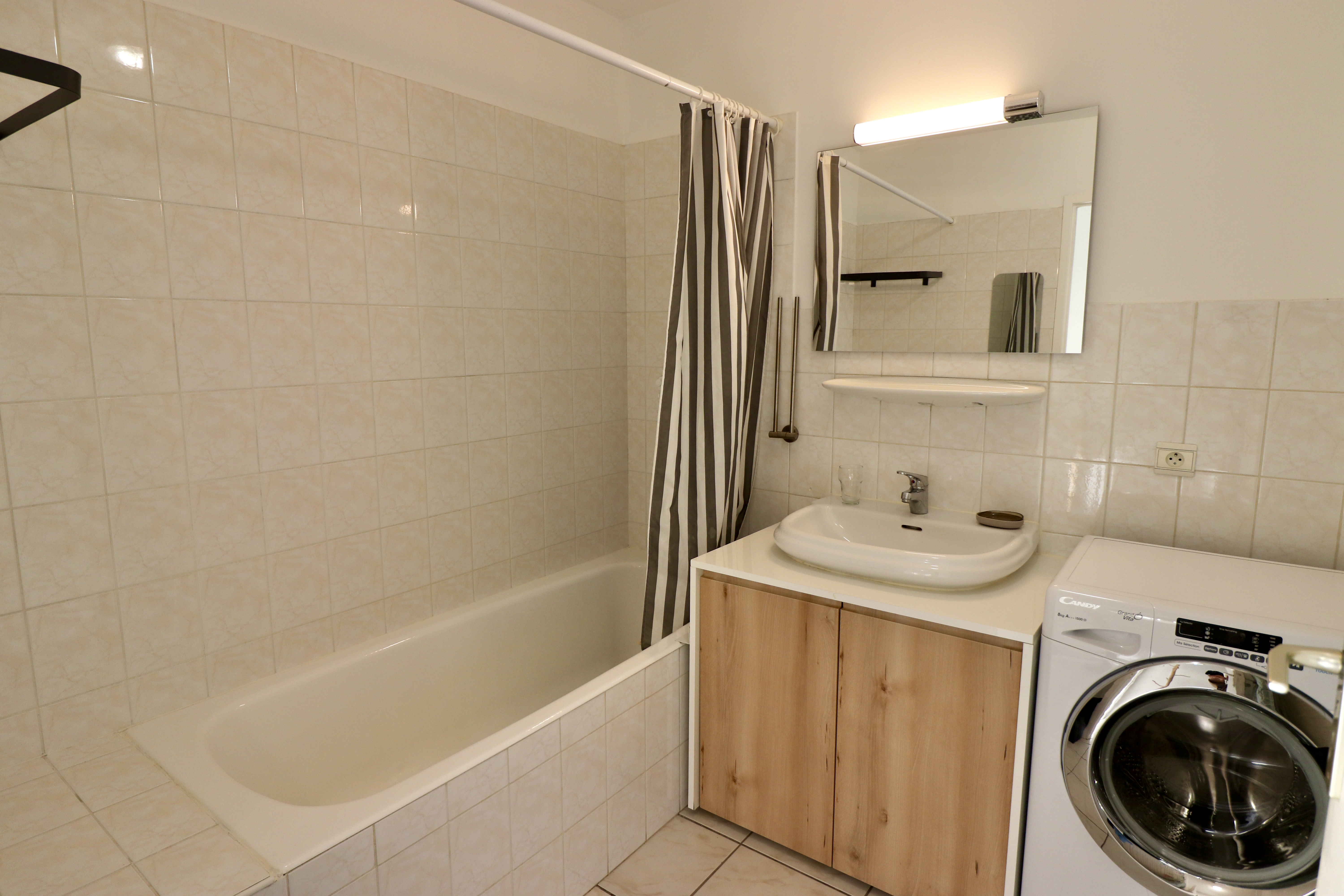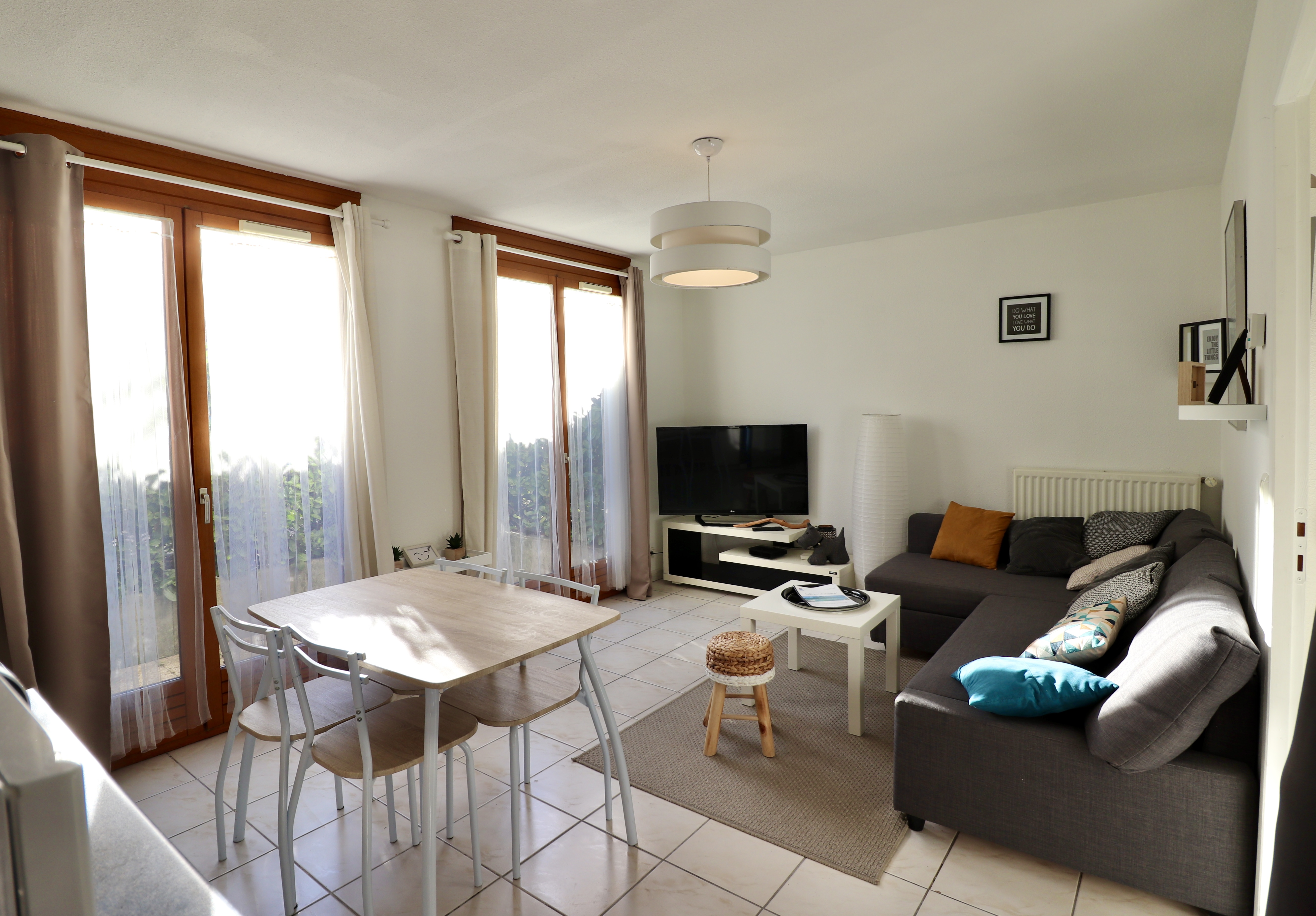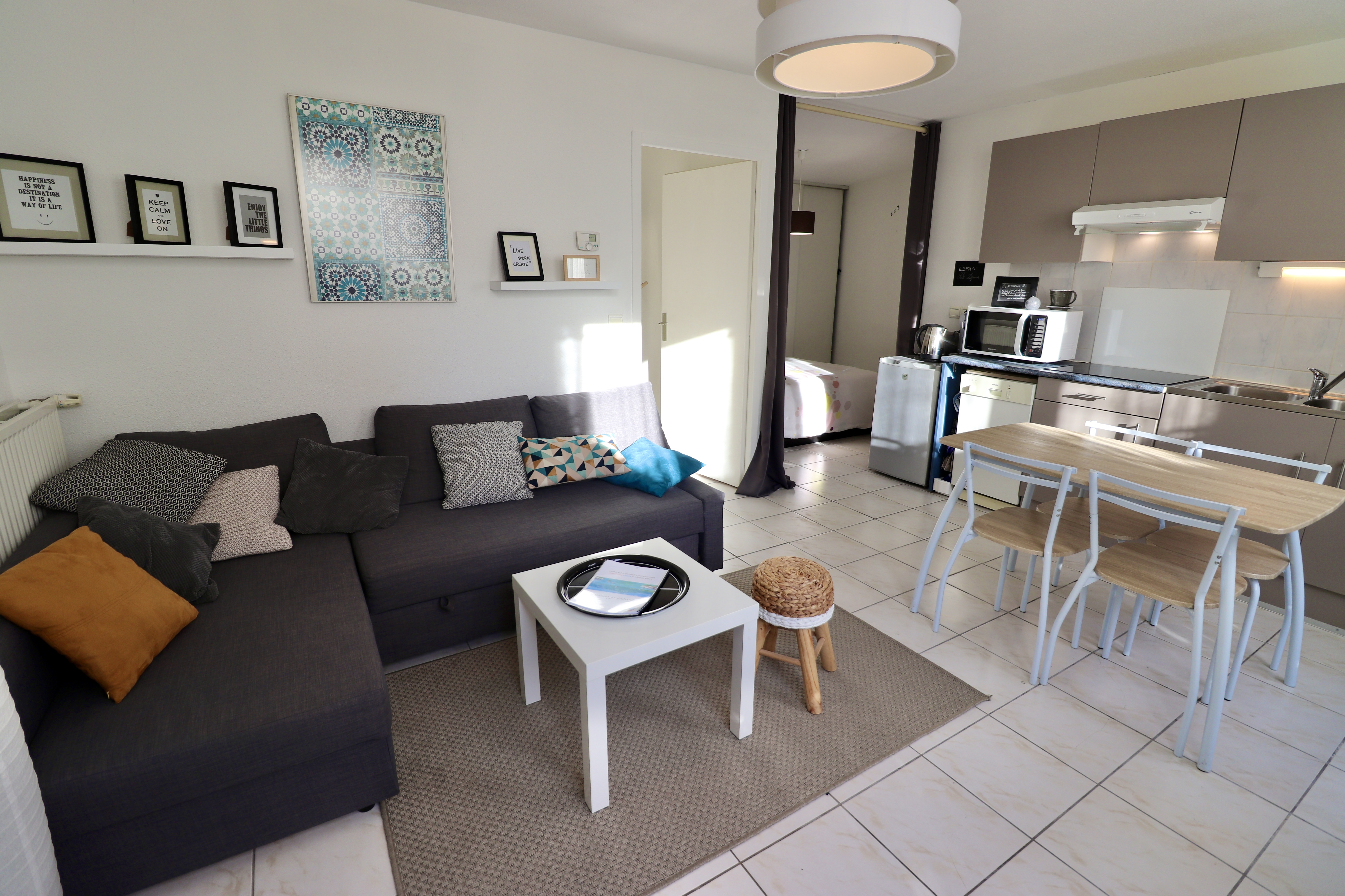 Equipements : plaque de cuisson ; réfrigérateur Top ; cafetière Moulinex et Senseo ; lave-vaisselle ; micro-onde ; lave-linge ; TV ; WIFI.