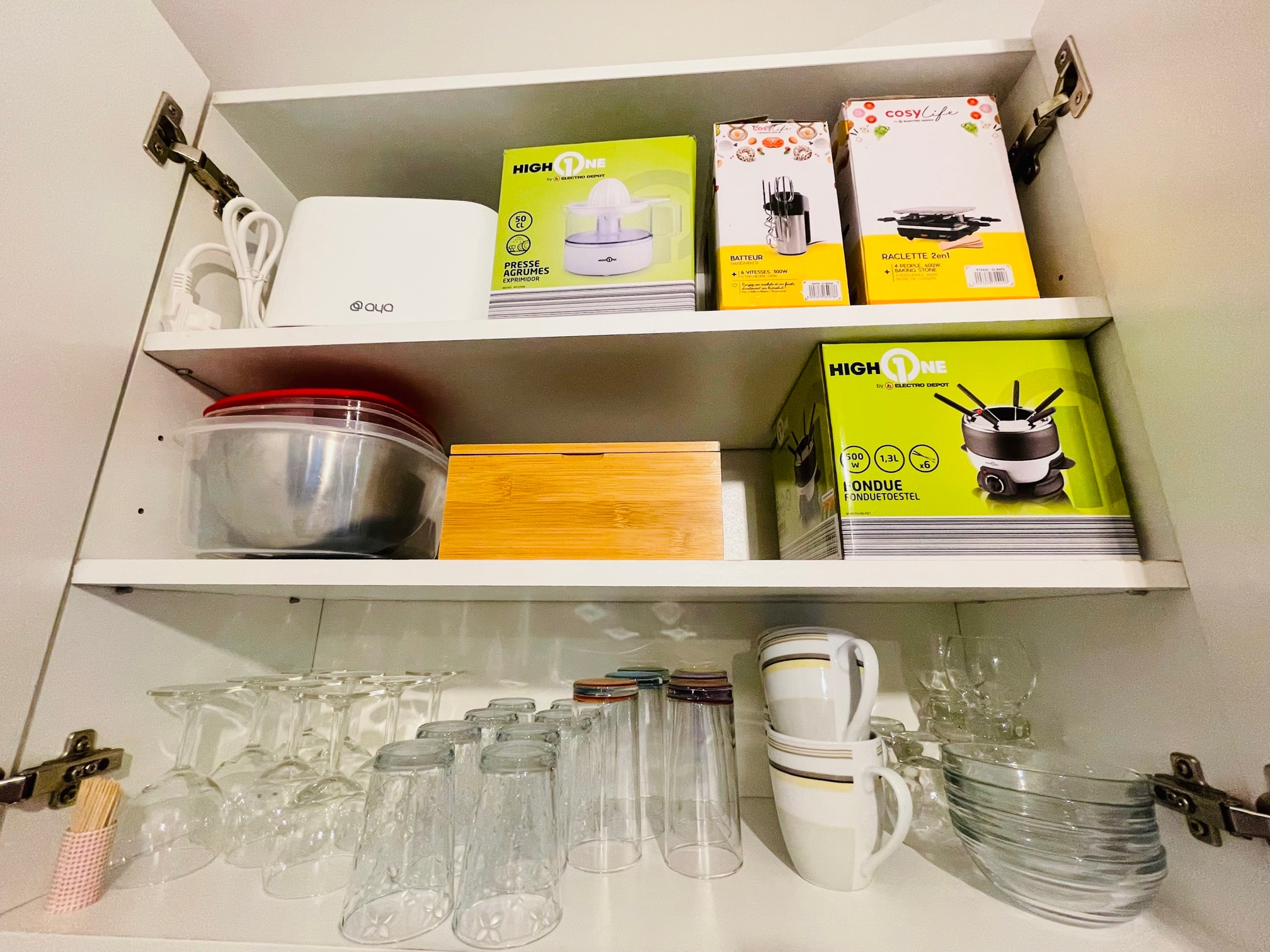 Tous les ustensiles de cuisine sont également fournies : poêles, casseroles, couverts, verres à eau, verres à vin, verres à champagne, tasses à thé, tasses à café, plat four, planche à découpé, ouvre bouteilles...