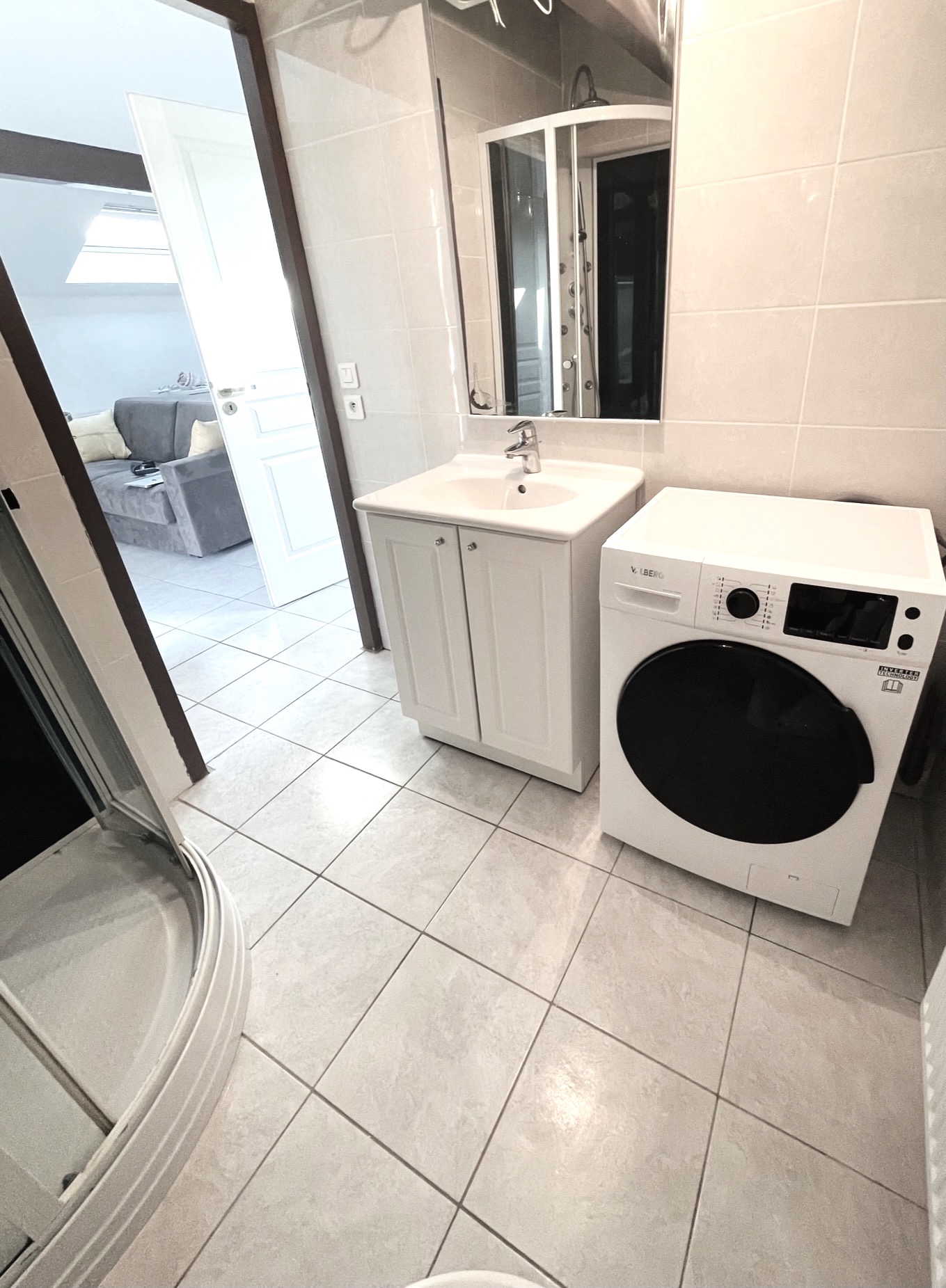 La salle de bains comprend une douche, un toilette, un meuble vasque avec miroir ainsi qu'un lave linge séchant idéal pour laver vos serviettes en été et chaussettes en hiver. Vous y trouverez également un sèche cheveux, un fer à repassé et étendoir à linge puis d'autres accessoires utiles pour votre séjour.