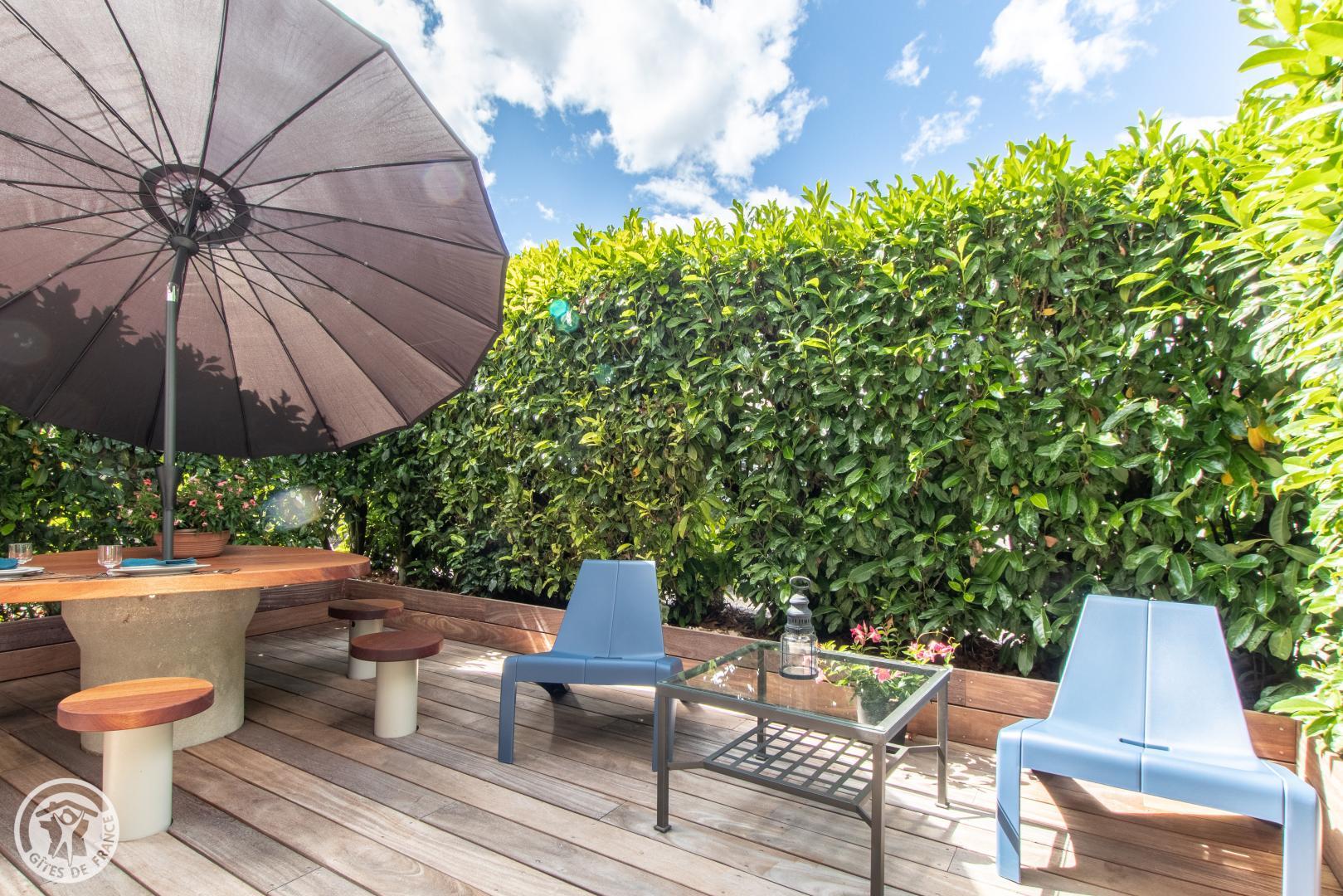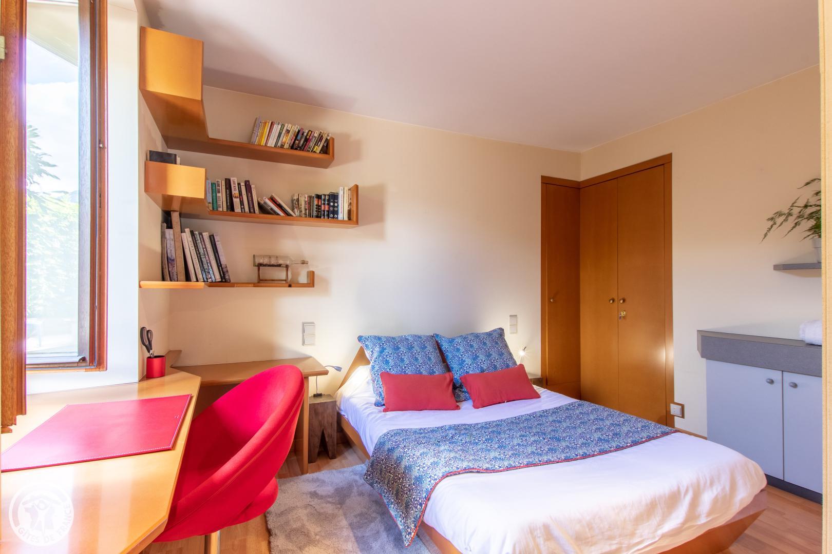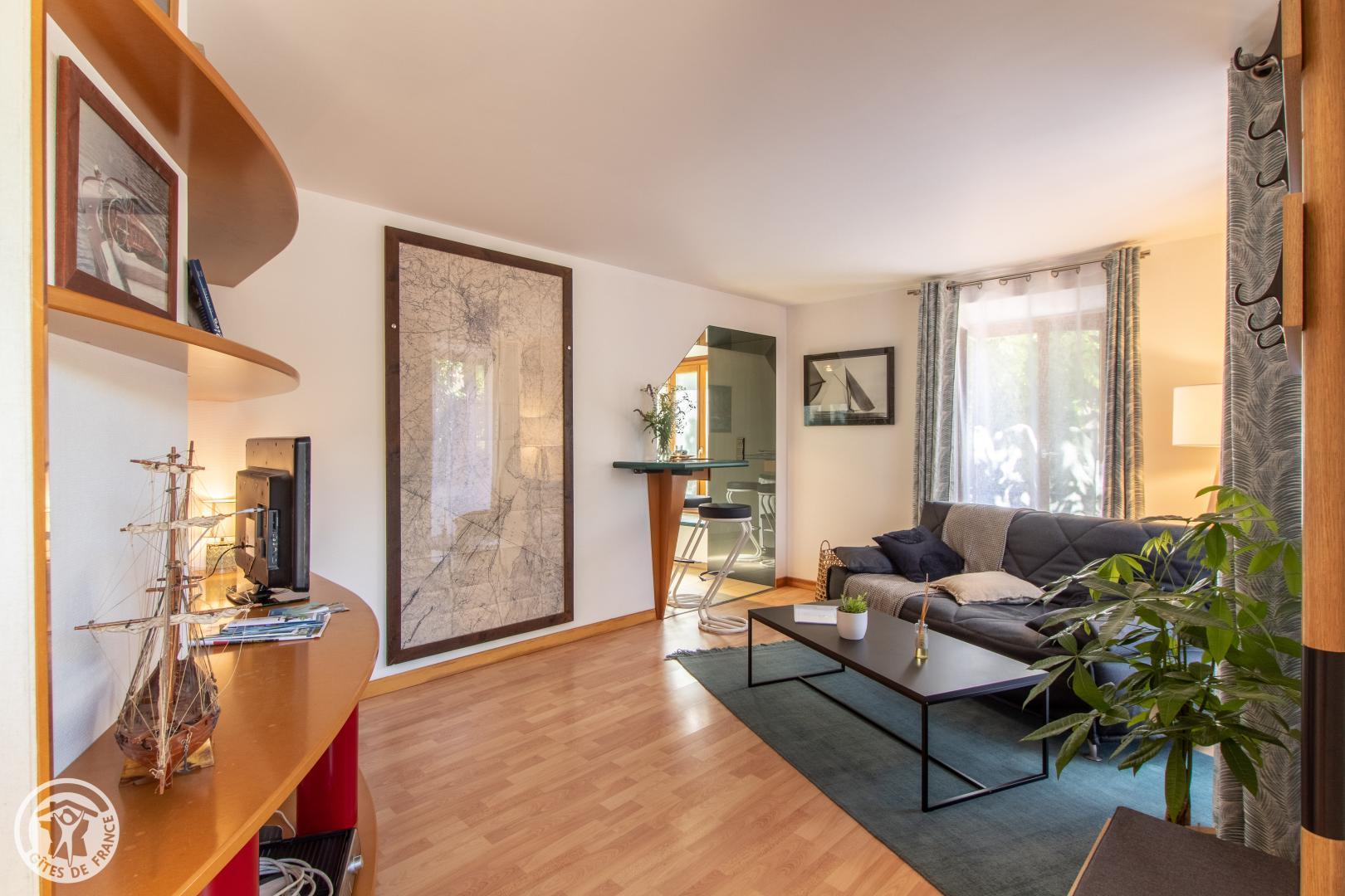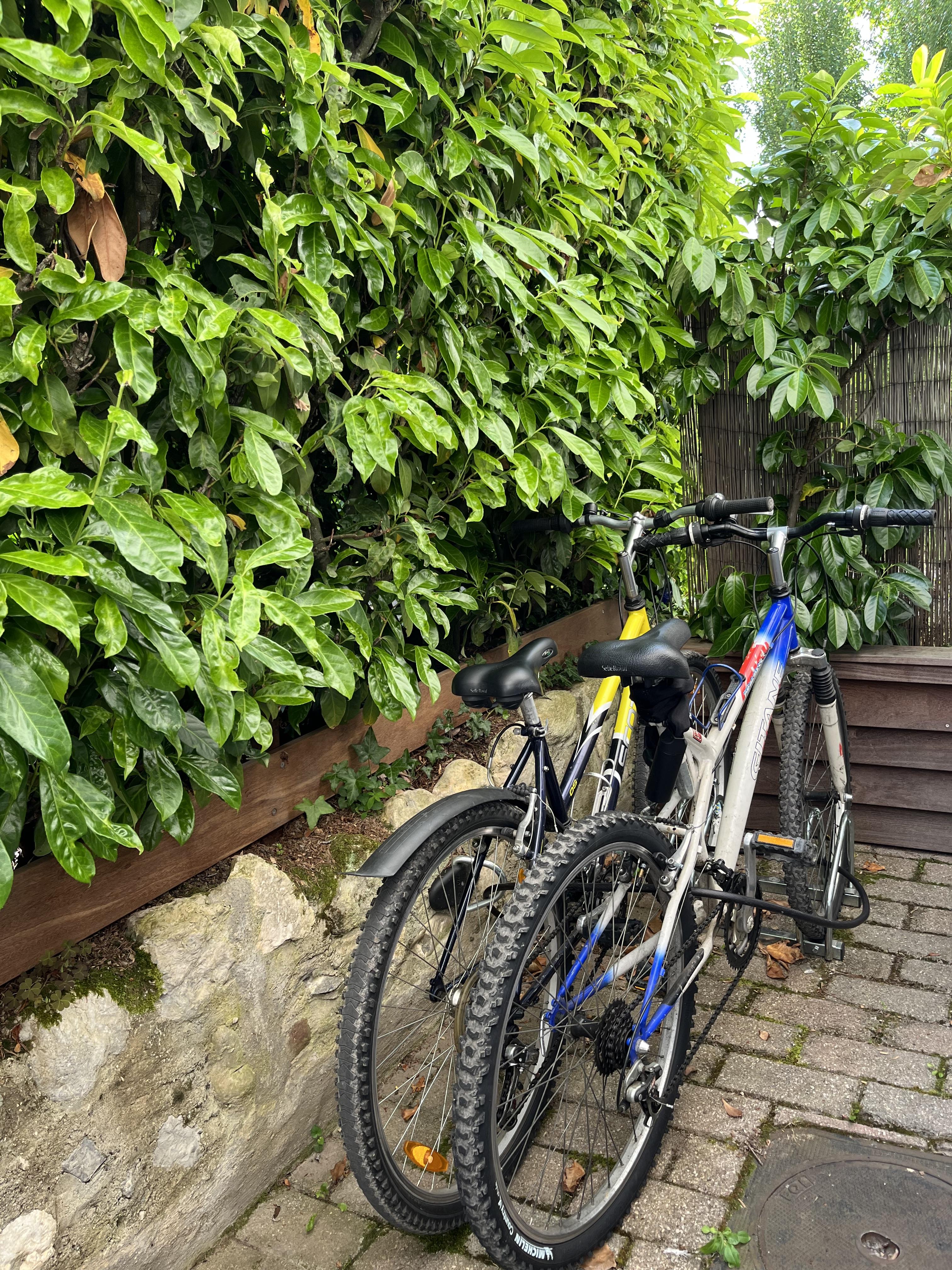 Vous y accèderez depuis le parking privatif (1 voiture) qui communique avec le jardin. Entrée sur séjour avec canapé et table basse, TV connectée, enceinte bluetooth. Cuisine ouverte avec table/tabourets hauts, lave linge séchant. Chambre avec lit 140*190cm, bureau et bibliothèque, placard penderie vitré. Salle d'eau dans la chambre avec vasque sur meuble, douche avec double-porte vitrée, radiateur sèche serviettes. WC indépendant. Terrasse avec mobilier fixe (table, tabouret, parasol) et petit salon de jardin. Isolation complète du parking de la copropriété par des haies végétales couvrantes. 2 Vélos avec cadenas mis à disposition.