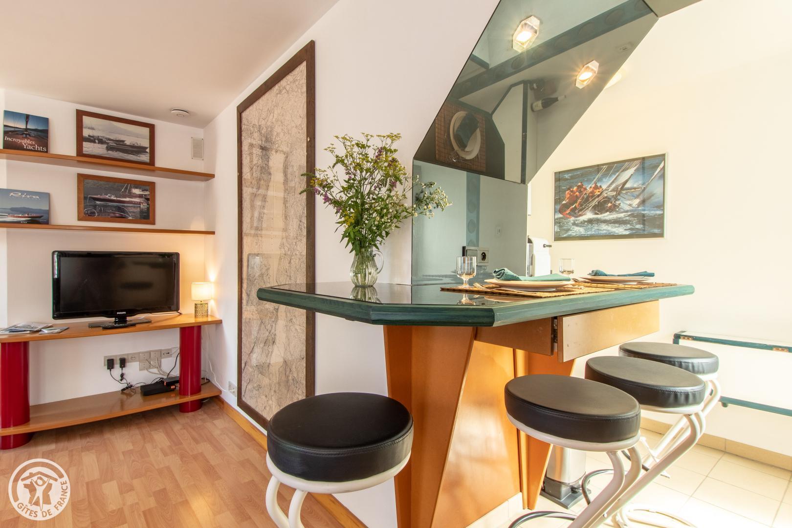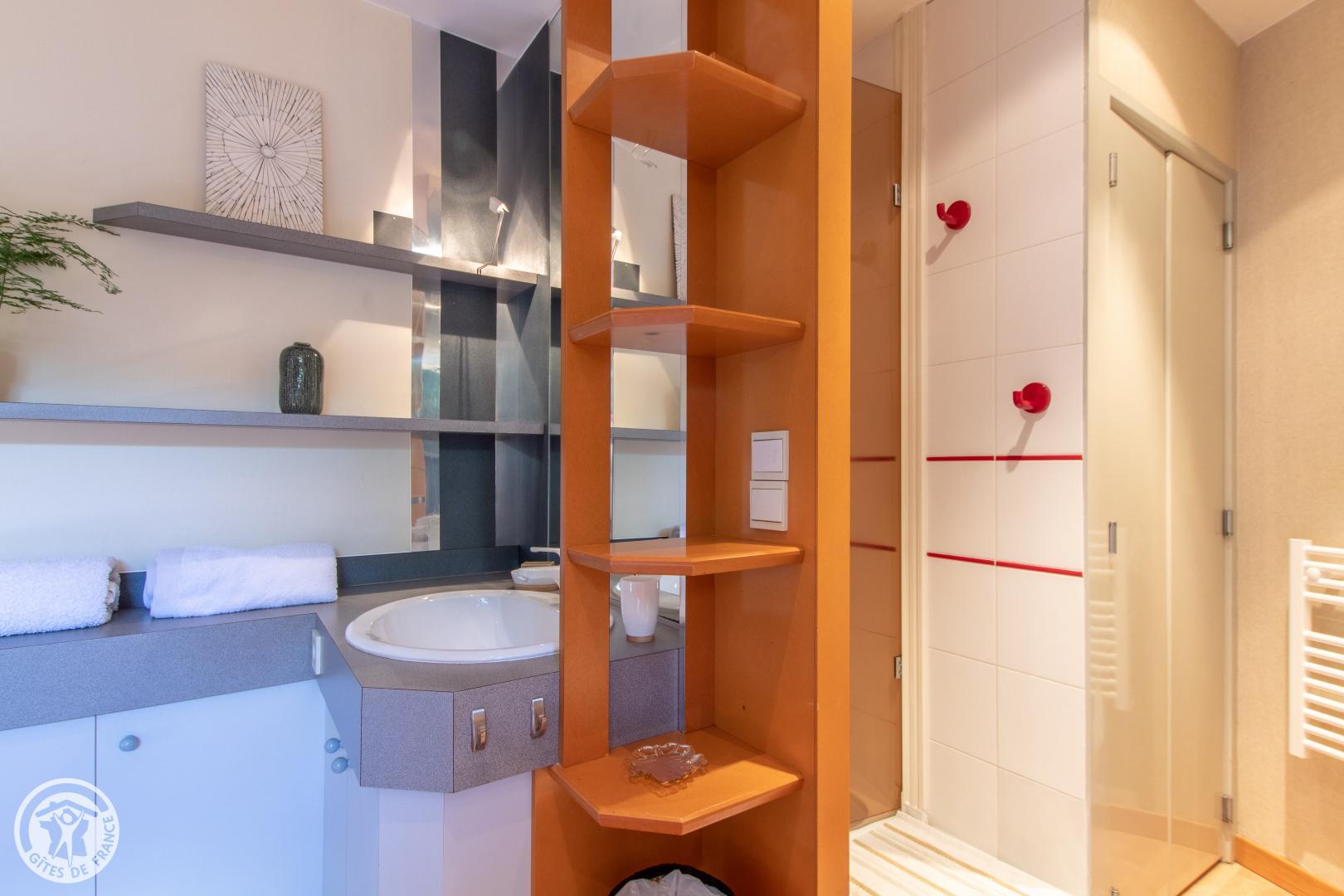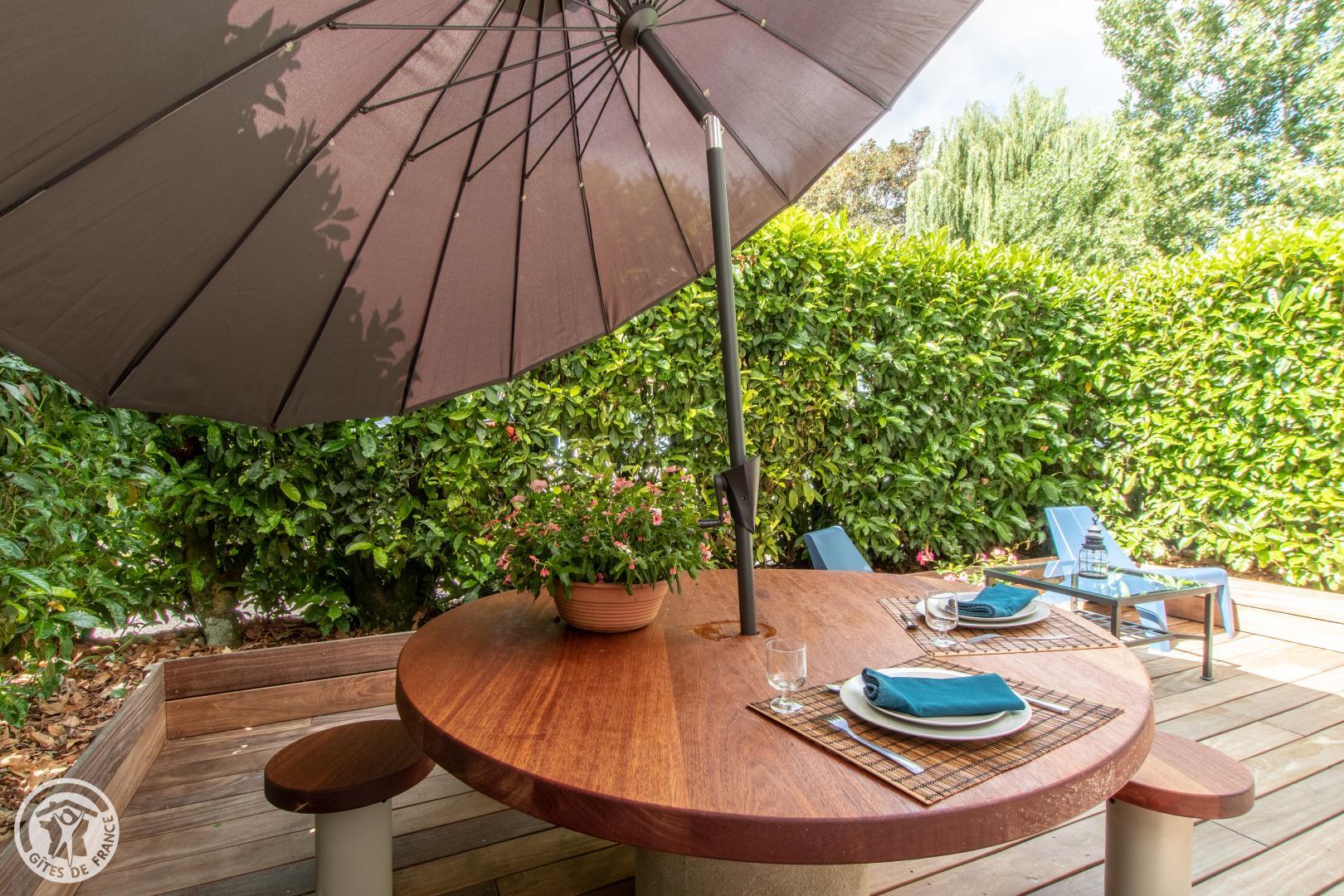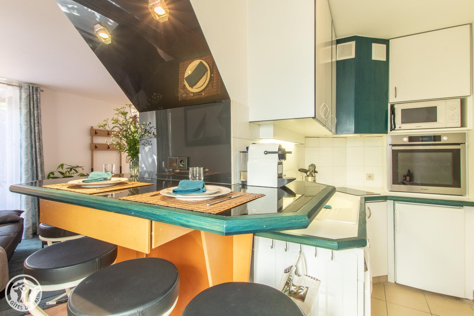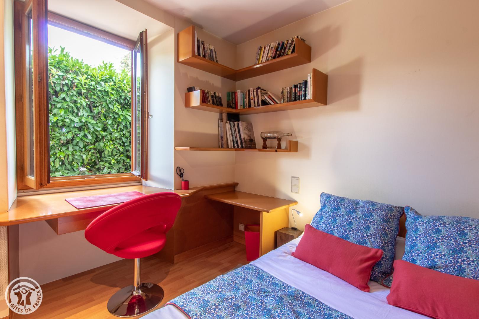 Vous y accèderez depuis le parking privatif (1 voiture) qui communique avec le jardin. Entrée sur séjour avec canapé et table basse, TV connectée, enceinte bluetooth. Cuisine ouverte avec table/tabourets hauts, lave linge séchant. Chambre avec lit 140*190cm, bureau et bibliothèque, placard penderie vitré. Salle d'eau dans la chambre avec vasque sur meuble, douche avec double-porte vitrée, radiateur sèche serviettes. WC indépendant. Terrasse avec mobilier fixe (table, tabouret, parasol) et petit salon de jardin. Isolation complète du parking de la copropriété par des haies végétales couvrantes. 2 Vélos avec cadenas mis à disposition.
