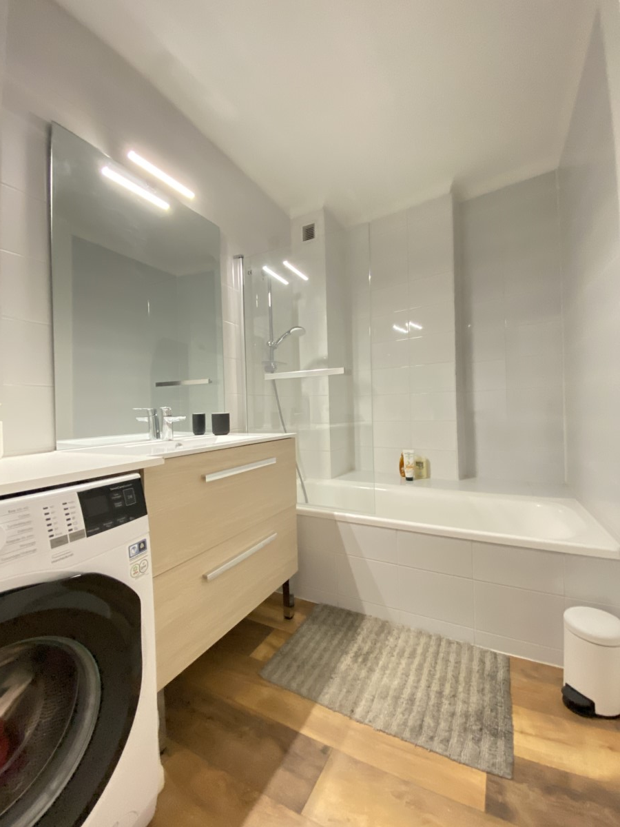 - Une salle de bain avec baignoire, double vasque, lave-linge.