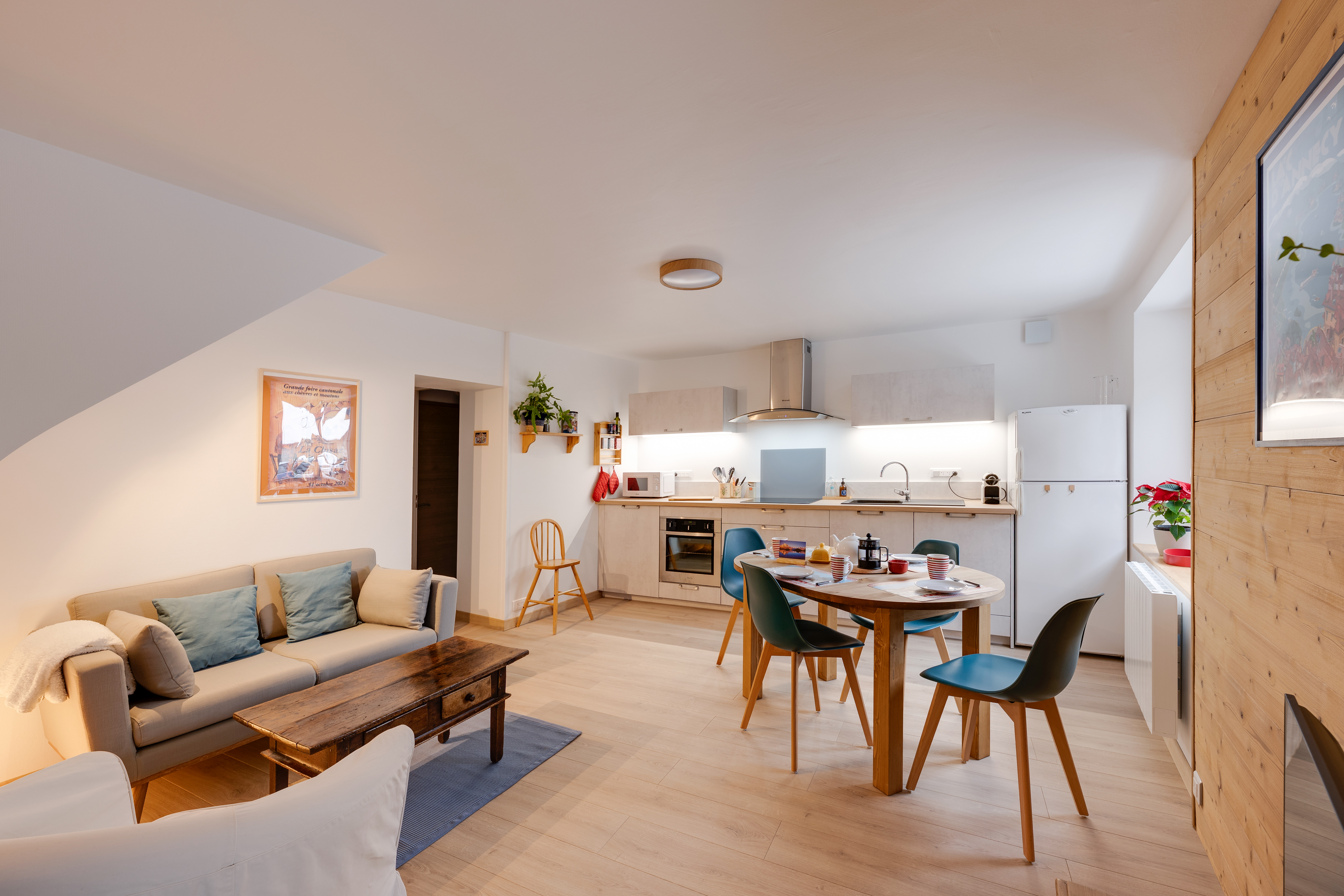 Le logement est en partie haute de la maison avec un séjour au premier étage comprenant une cuisine américaine toute équipée pour cuisiner dans de bonnes conditions (four, four micro-ondes, plaques induction, frigo-congélateur, mixeurs, appareil à raclettes et à fondus, etc), un coin repas et un coin salon. Les deux chambres au deuxième étage sont spacieuses. L'une comprend un lit double et un petit espace de travail, la seconde comprend deux lits simples et des espaces de rangement. Le linge de lit, de toilettes et de cuisine est fourni. Livres et jeux d'enfants sont à disposition. WC séparé et salle d'eau. En complément, vous accédez à une buanderie commune aux deux logements de la maison avec lave-linge et sèche-linge, ainsi qu'à un local sécurisé à vélos, skis et poussettes. Un petit espace vert non clos mais au calme avec deux transats vous est réservé.