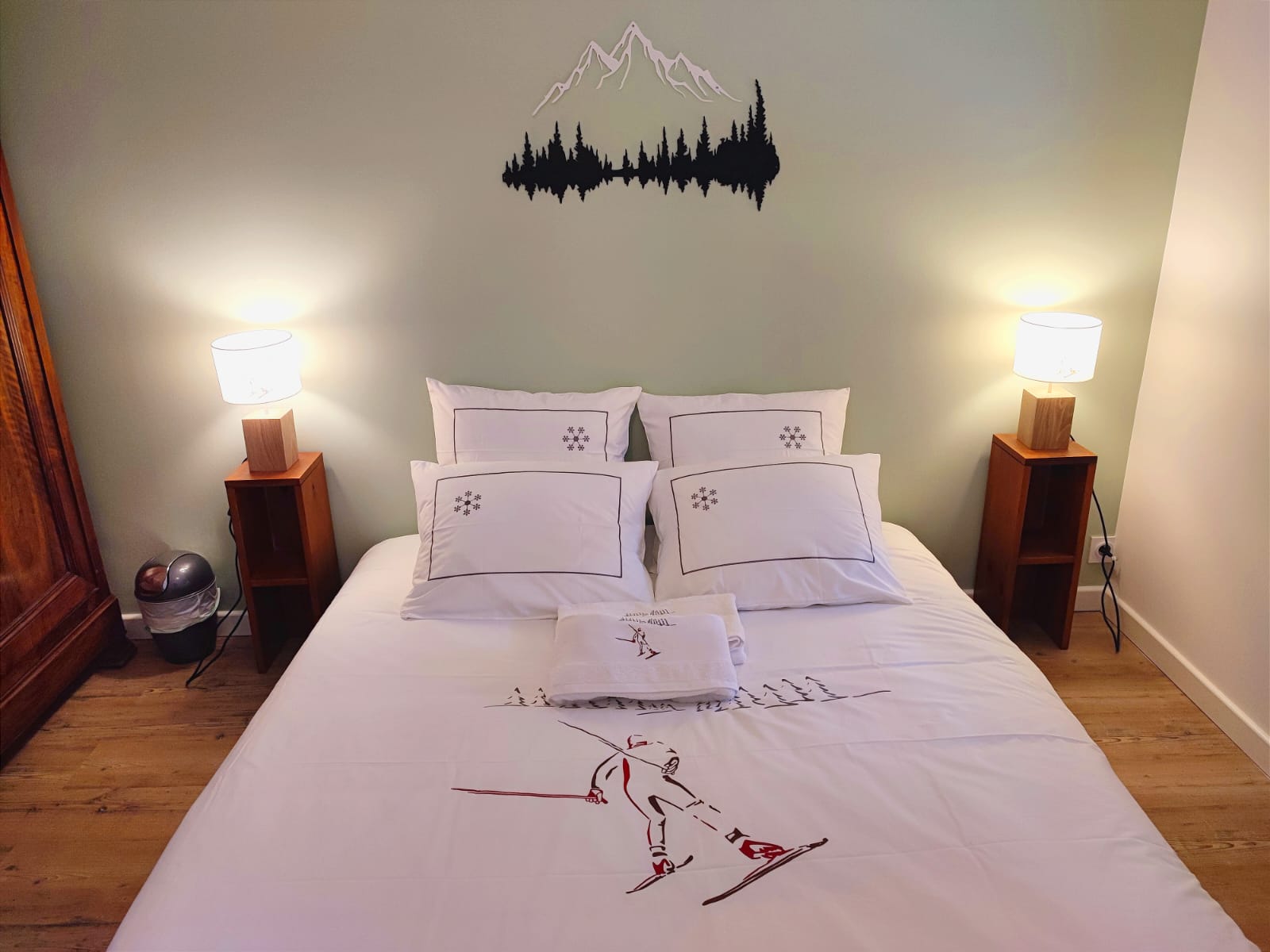 Les trois belles chambres offrent chacune leur propre ambiance et thématique de décoration, créant des espaces singuliers et personnalisés pour chaque occupant. Deux salles d'eau modernes et fonctionnelles complètent cet appartement, offrant toutes les commodités nécessaires pour un séjour relaxant en montagne.