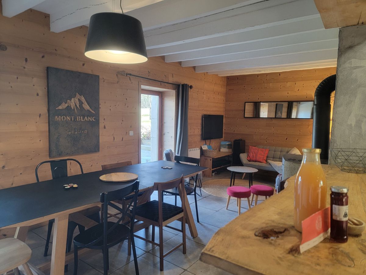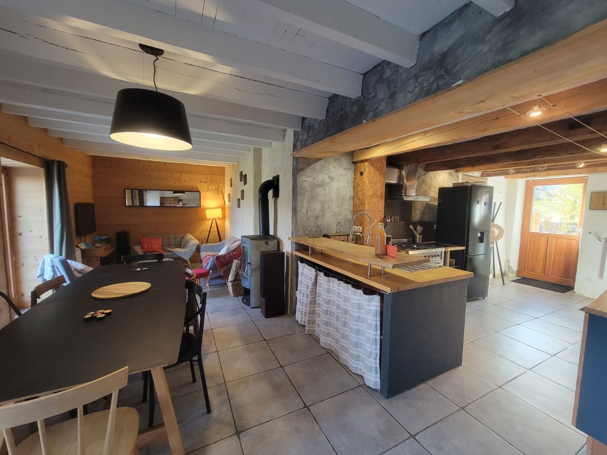 La cuisine est ouverte sur la salle à manger et le salon et la pièce de vie est cosy et chaleureuse. Elle donne sur la terrasse et le grand jardin.