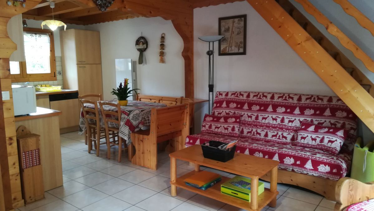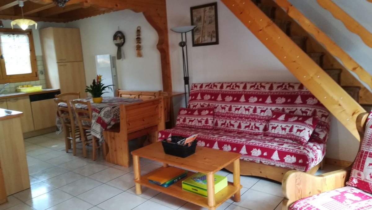 Chalet indépendant pour 5 personnes : une grande pièce de vie, 2 chambres, une salle d'eau, un WC, une superbe terrasse. Situé au 143 route de Creusaz à Creusaz sur le versant sud de Bernex, face à la station. >