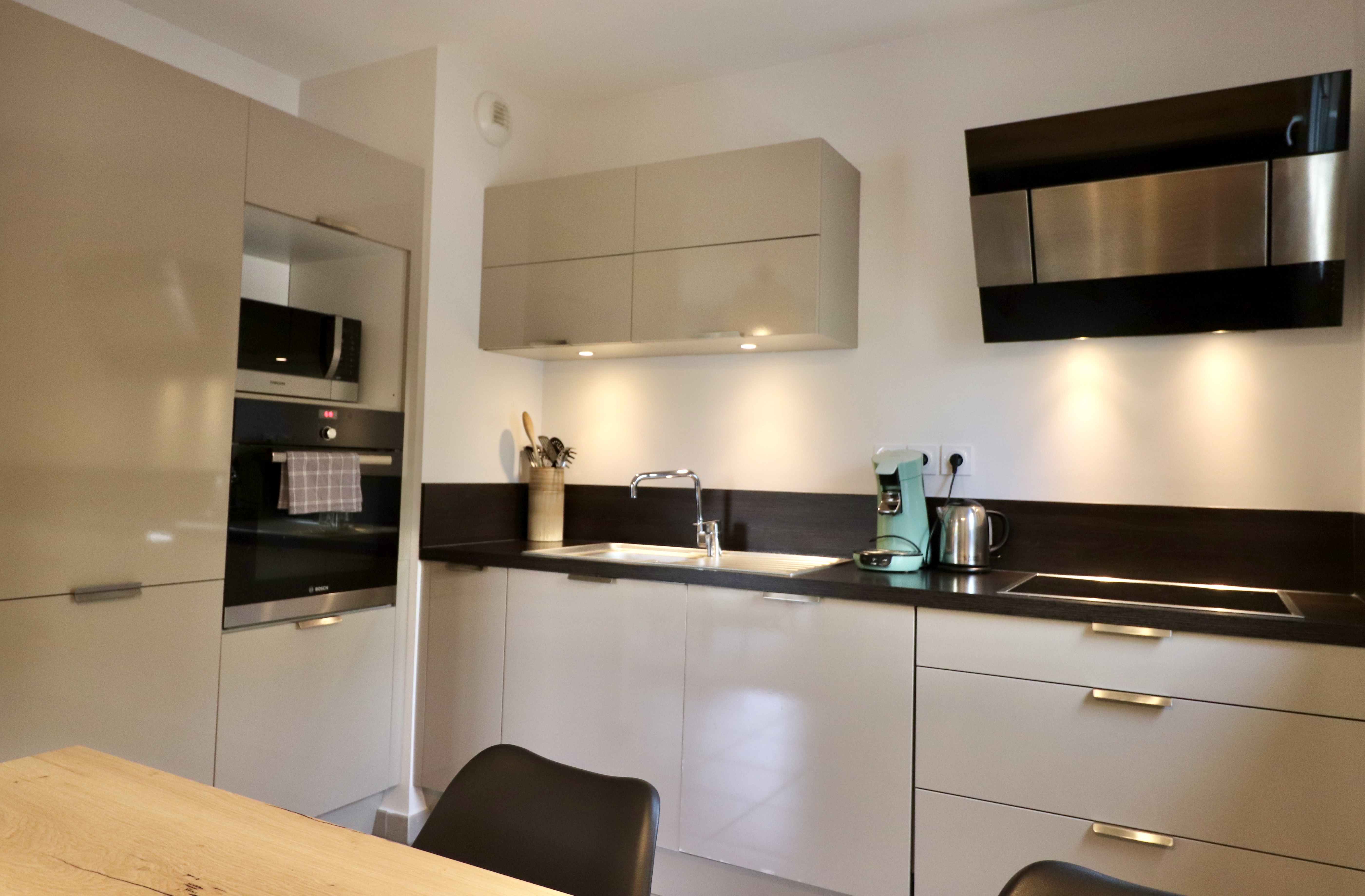 Très bel appartement (50m²) au 3è étage, prestations de qualité. Cuisine intégrée, séjour (Tv, canapé convertible rapido 140cm, poêle à bois décoratif), chambre intérieure (avec fenêtres intérieures, 1 lit 160x200), wc indépendant, salle d'eau.