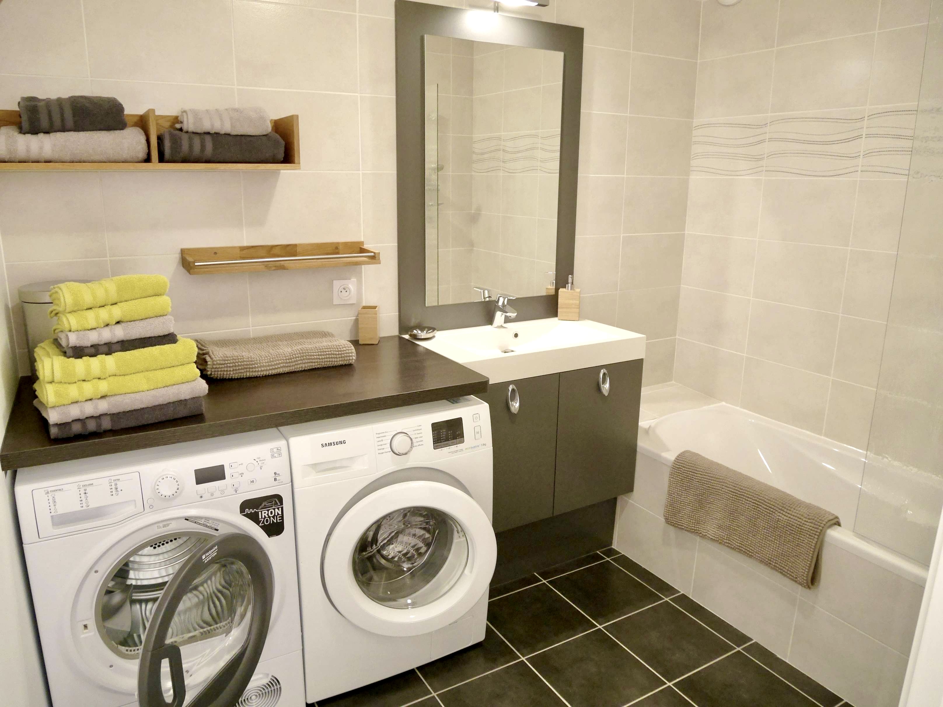 - Salle de bains : baignoire, vasque, lave-linge / sèche-linge.