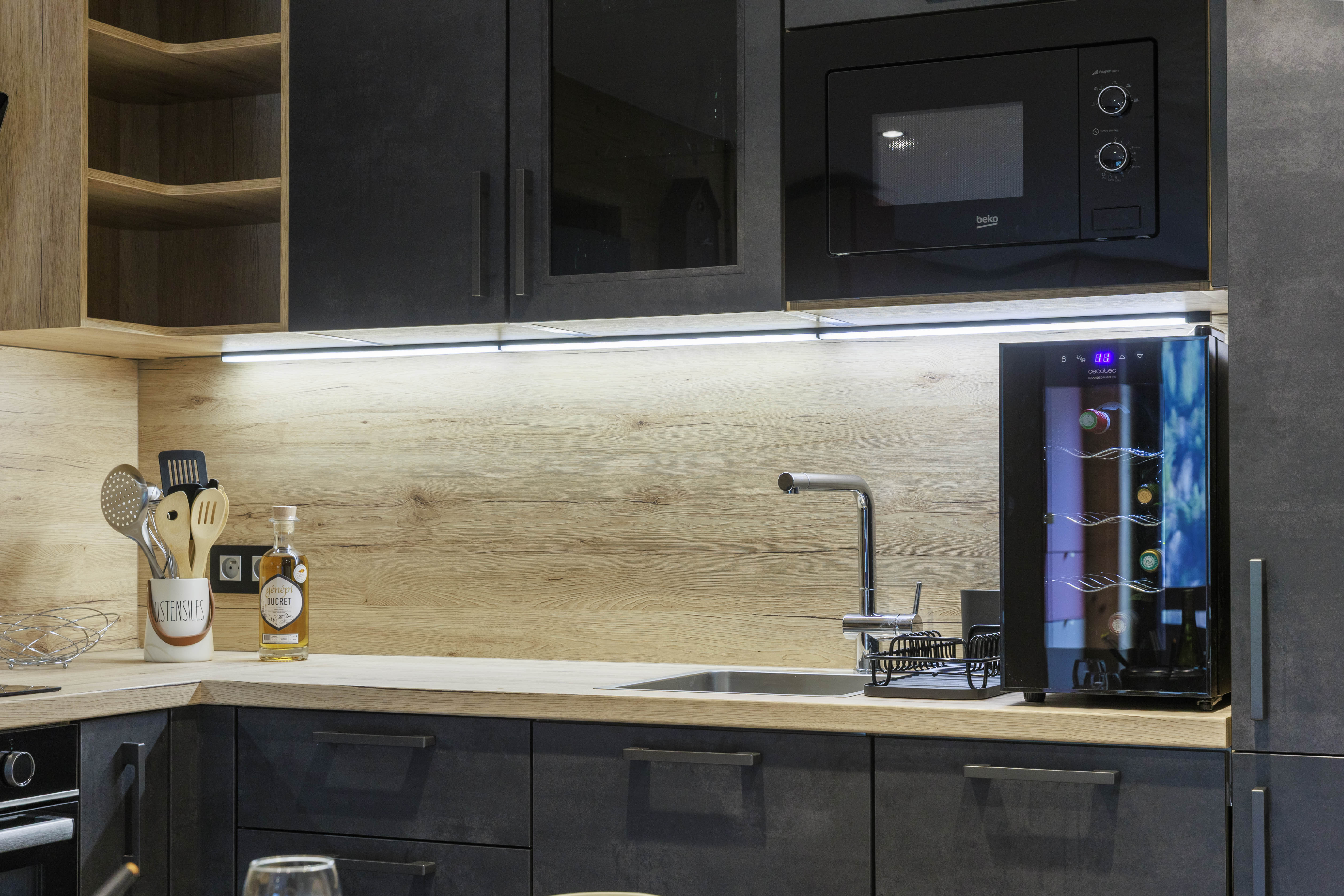 - Cuisine équipée : lave-vaisselle, four, micro-ondes, cave à vin 8 bouteilles, vaisselle.
