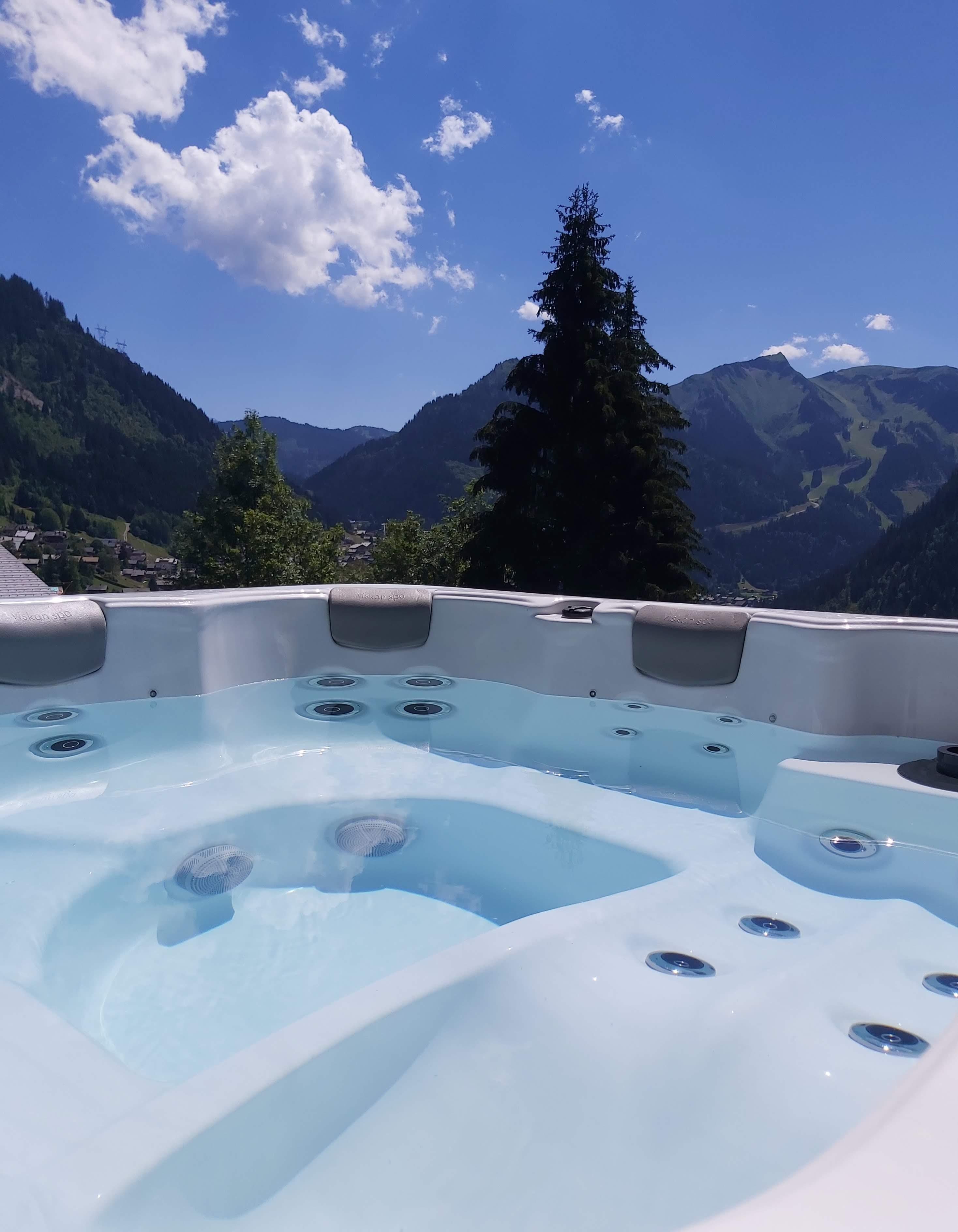 - Jacuzzi vue montagne Chalet Le Spencer Crédit photo : Chalets Bovard