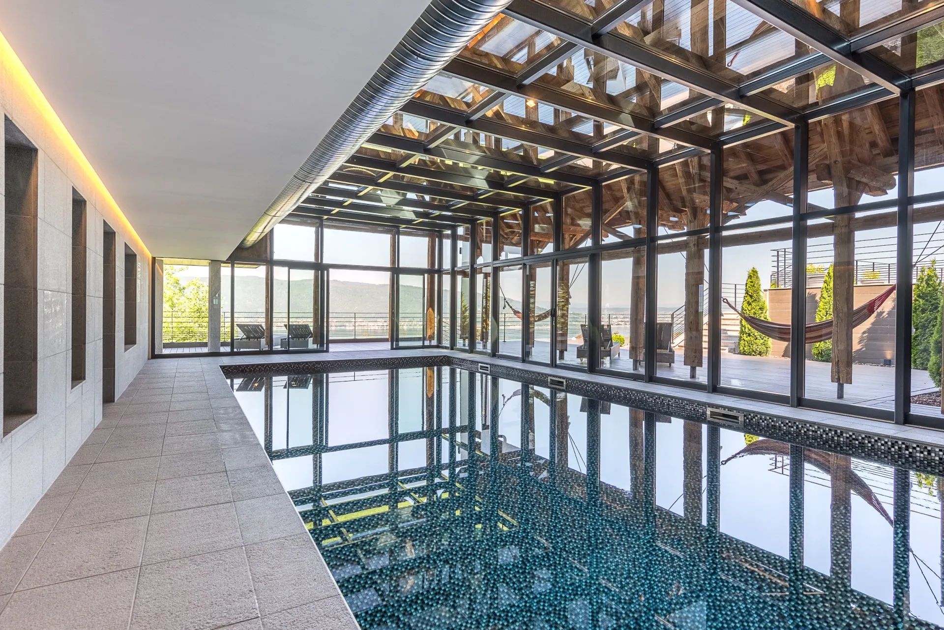 La villa dispose de plusieurs chambres confortables avec salles de bains, de vastes pièces à vivre baignées de lumière et de nombreuses terrasses aménagées permettant de profiter pleinement du panorama. L’espace bien-être constitue l’un des atouts majeurs de la propriété avec une piscine intérieure chauffée, un jacuzzi, un sauna et un hammam, offrant une expérience détente unique en toute saison.
