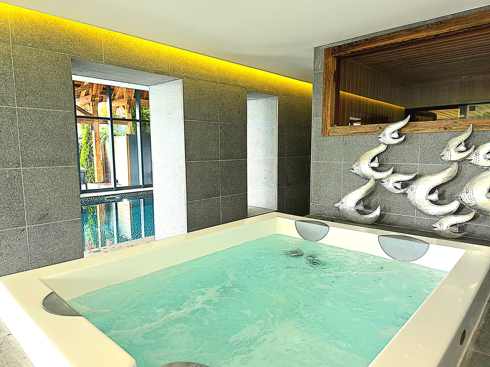 L’espace bien-être constitue l’un des atouts majeurs de la propriété avec une grande piscine intérieure chauffée, un jacuzzi, un sauna et un hammam, offrant une expérience détente unique en toute saison. La villa propose également une salle de sport, une salle de massage, une salle de cinéma 9 places, un bar, un billard ainsi que plusieurs espaces de réception pensés pour le confort et la convivialité.