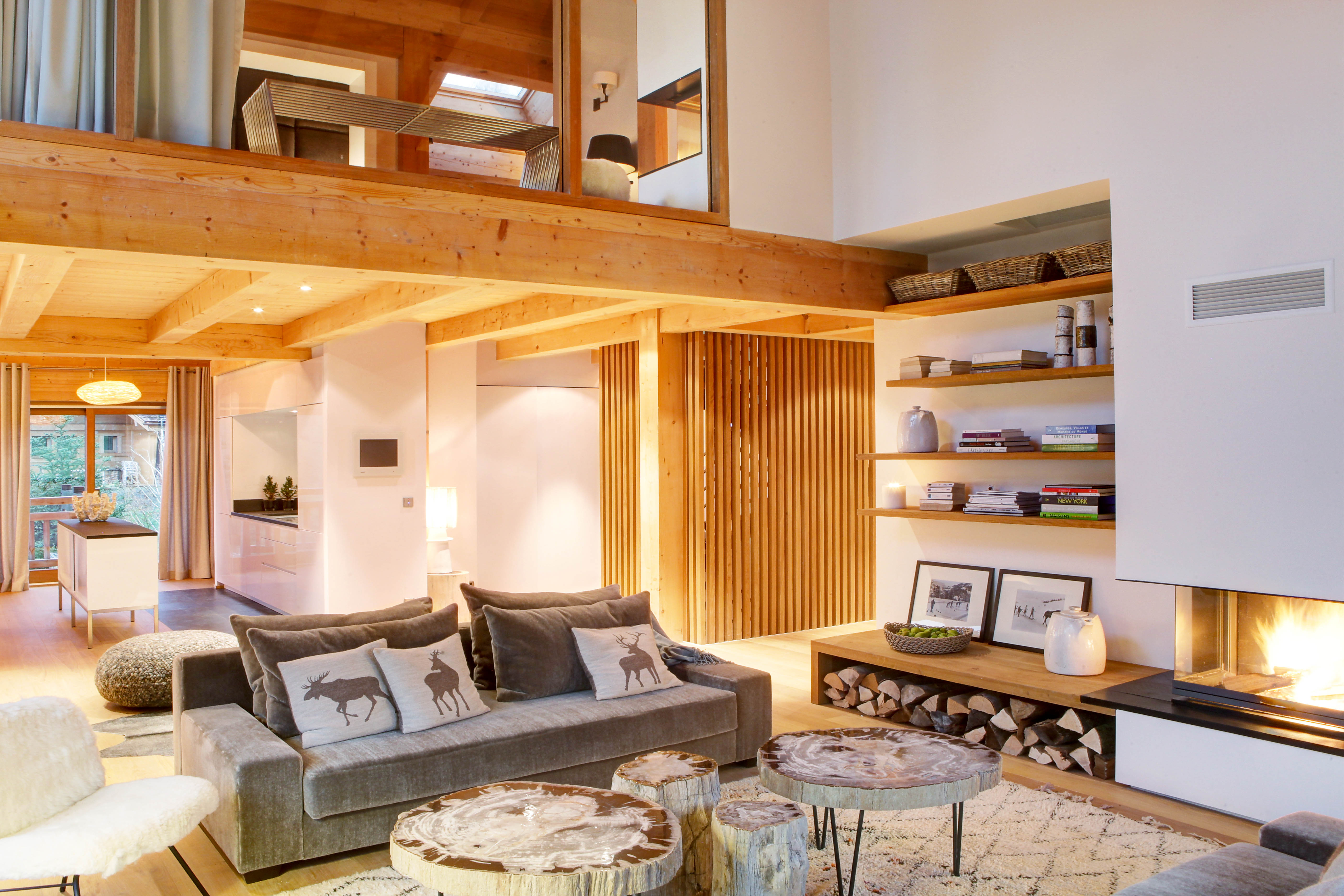 Le cœur du chalet regroupe un grand salon avec charpente apparente, une belle cheminée et une bibliothèque. La salle à manger adjacente, qui ouvre sur une grande terrasse, contribue à la convivialité des repas en famille ou entre amis.