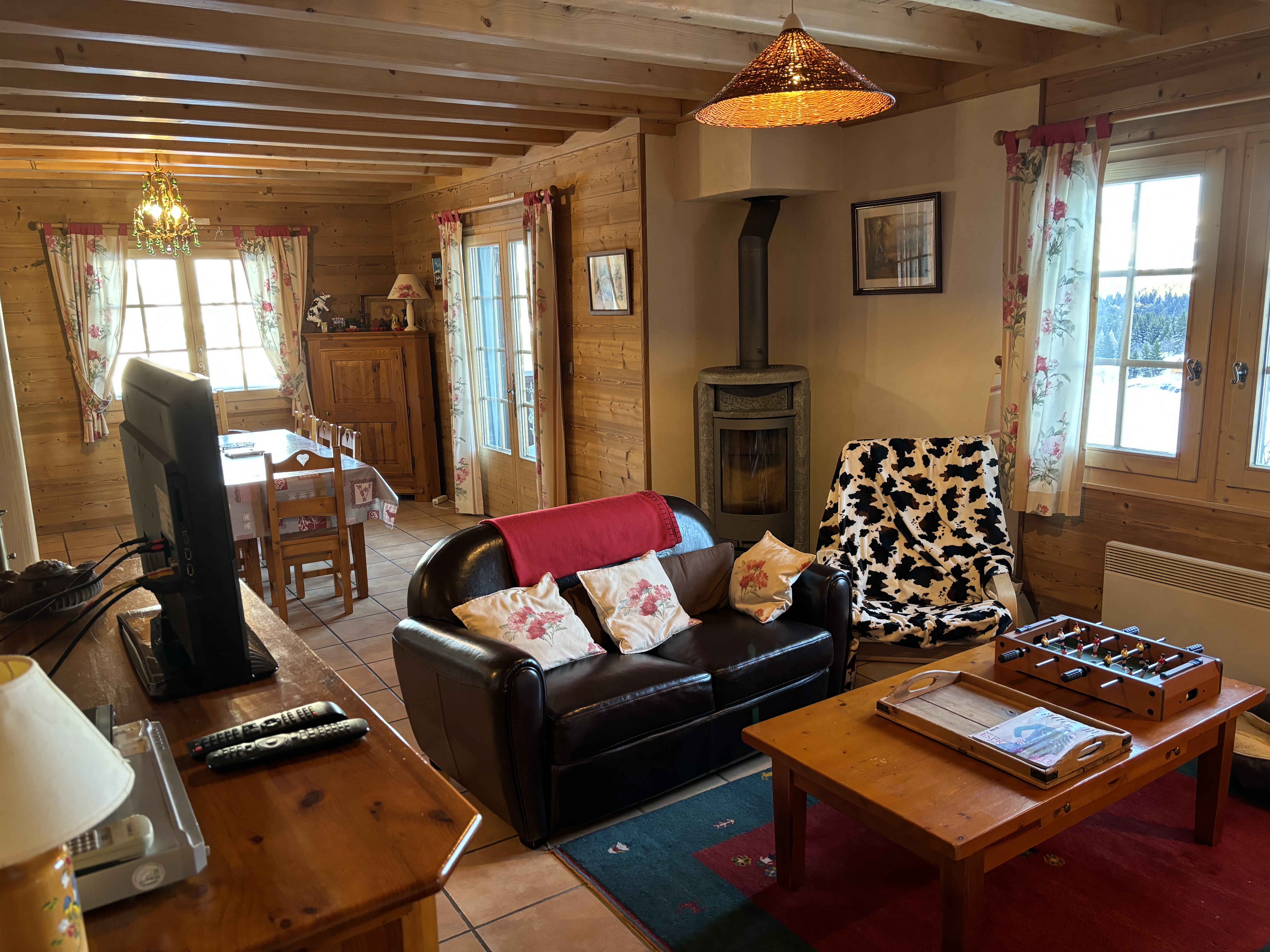 Espace détente avec canapé, fauteuils, poêle à bois (foyer apparent), tables basses, bahut, TV, DVD