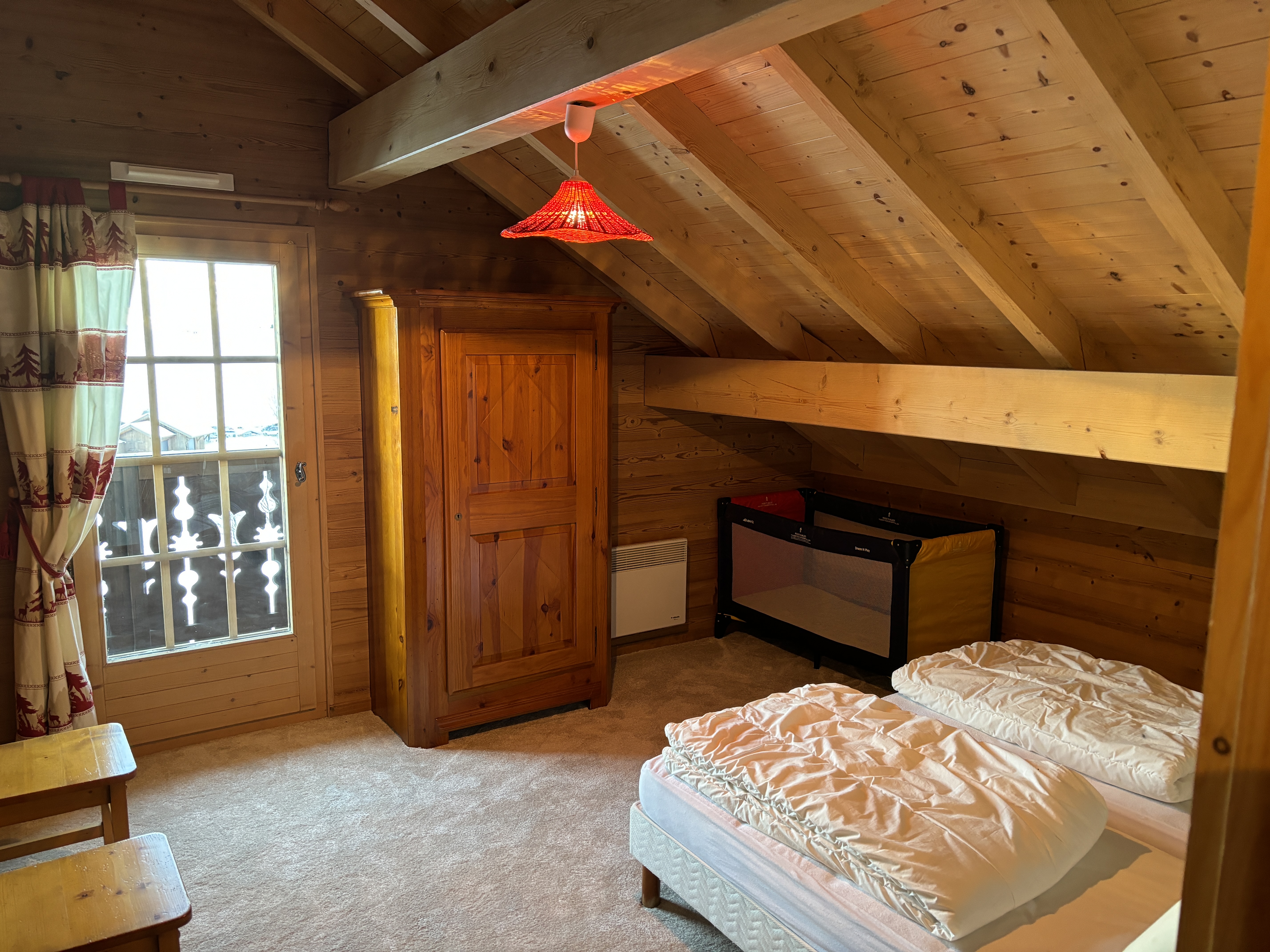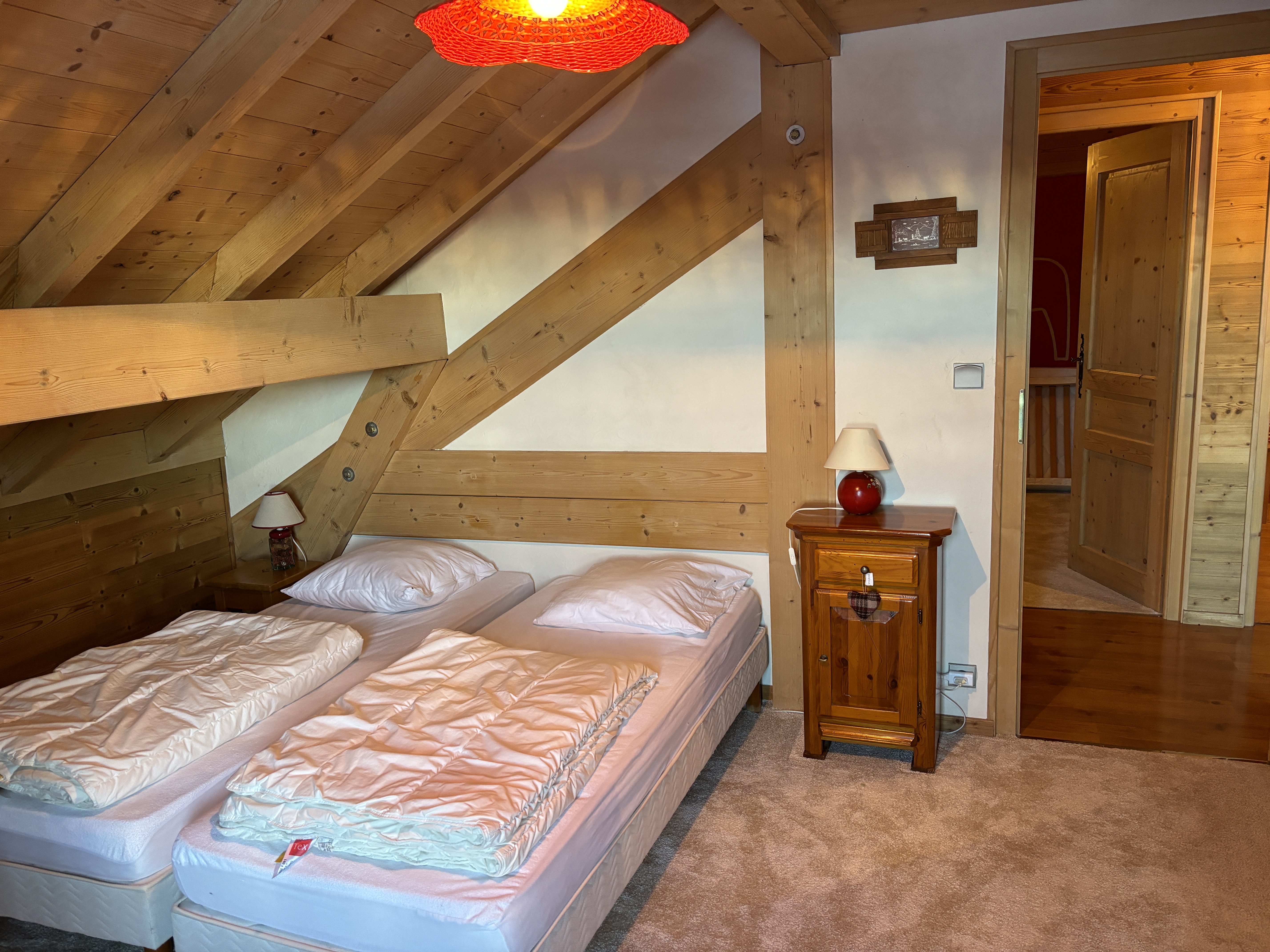 Chambre n°2 : 2 lits de 80 cm, armoire, chaises, chevets et lampes. Lit bébé. 10 m2 + mansarde. Balcon S-E