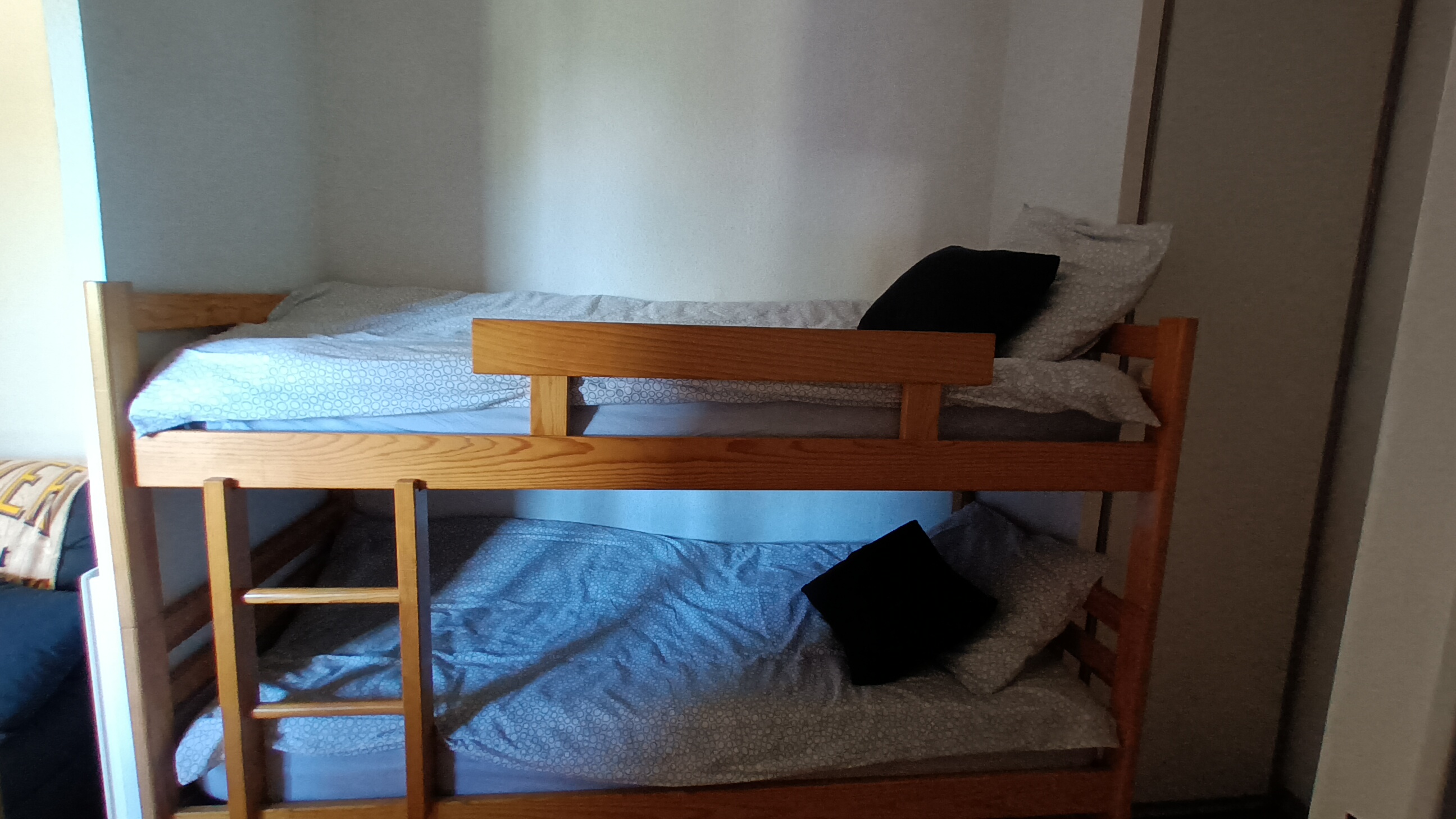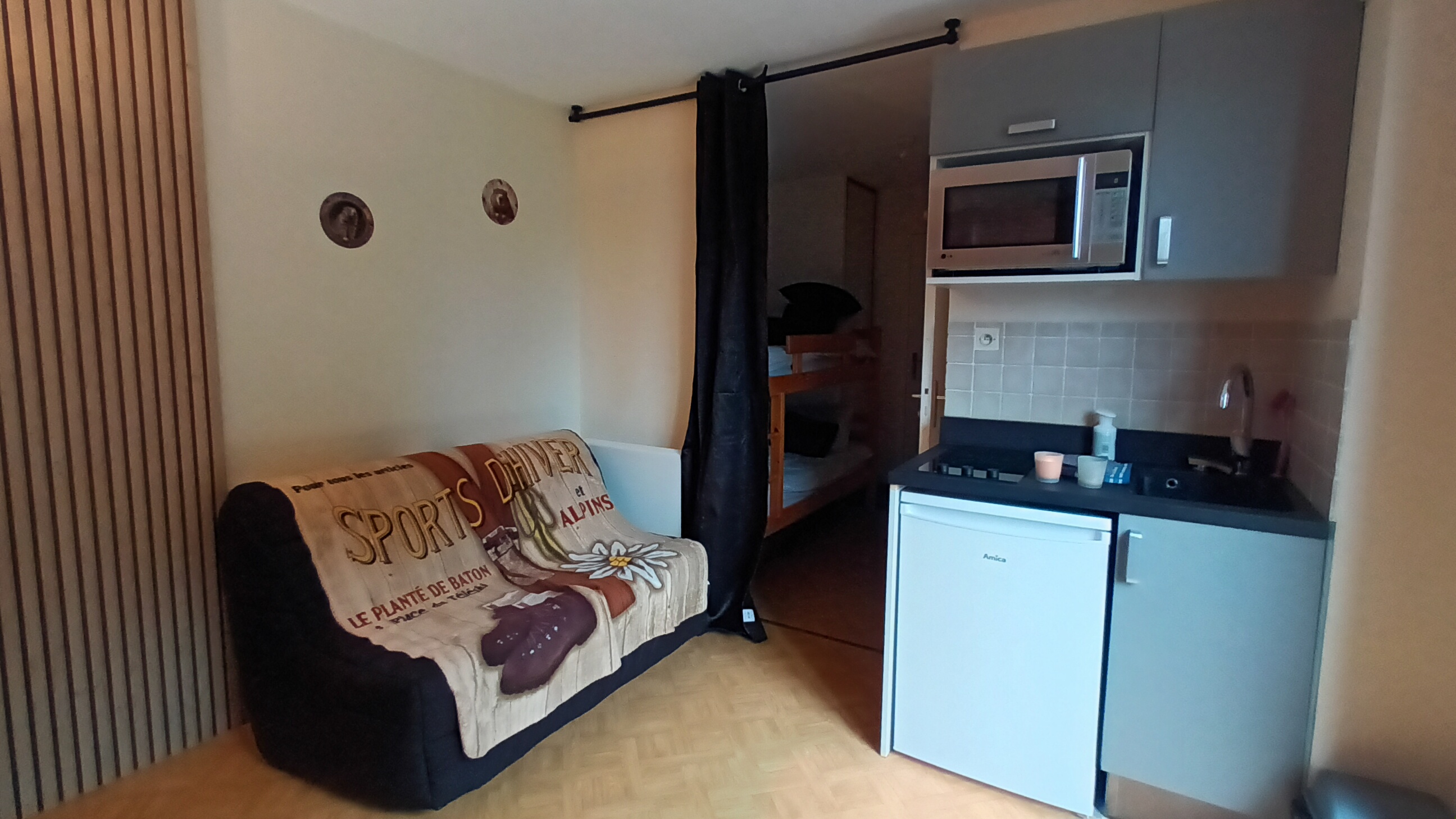 Joli studio 1er étage (18m²), 4 couchages dans résidence proche du télésiège. entrée avec 2 lits superposés, pièce à vivre avec kitchenette et BZ, salle de bains, wc, balcon vue sur la Dent d'Oche. >