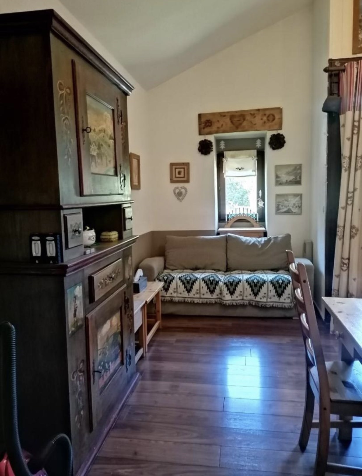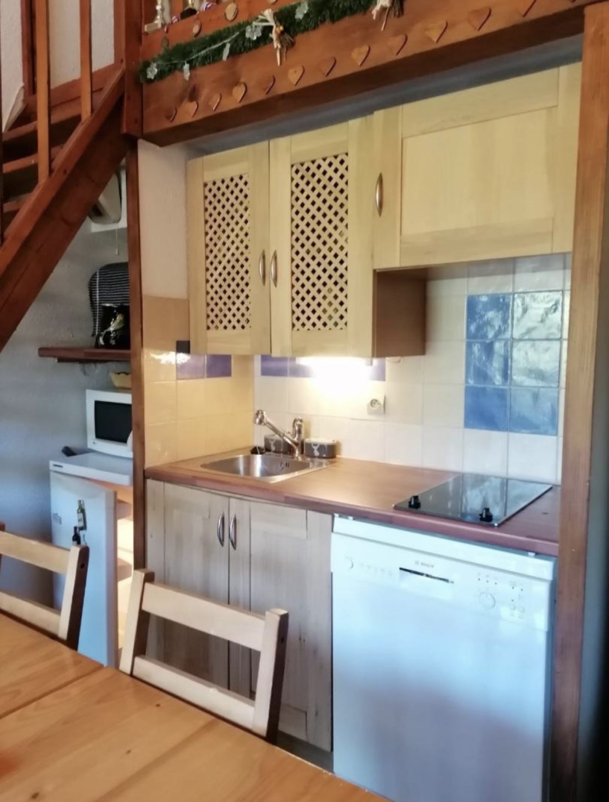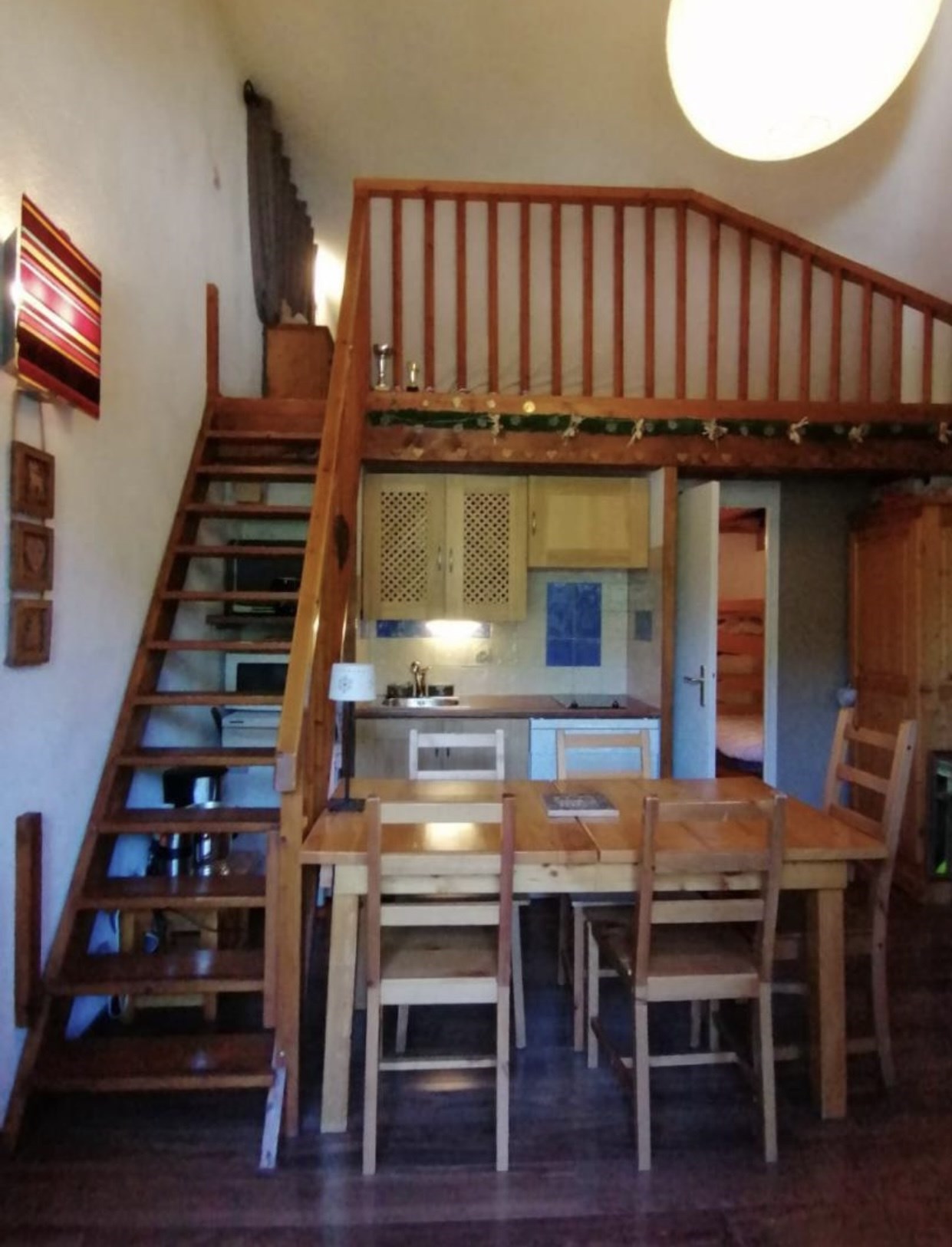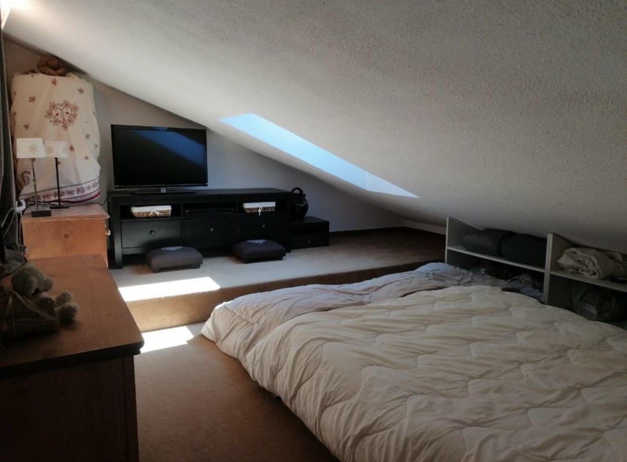 Appartement duplex comprenant à l'étage 2 chambres et 1 WC Pièce à vivre avec coin cuisine équipée( lave-vaisselle, micro-ondes, four) Canapé convertible 2 couchages, 1 TV. 1 salle de bains 1 WC 1 casier à skis