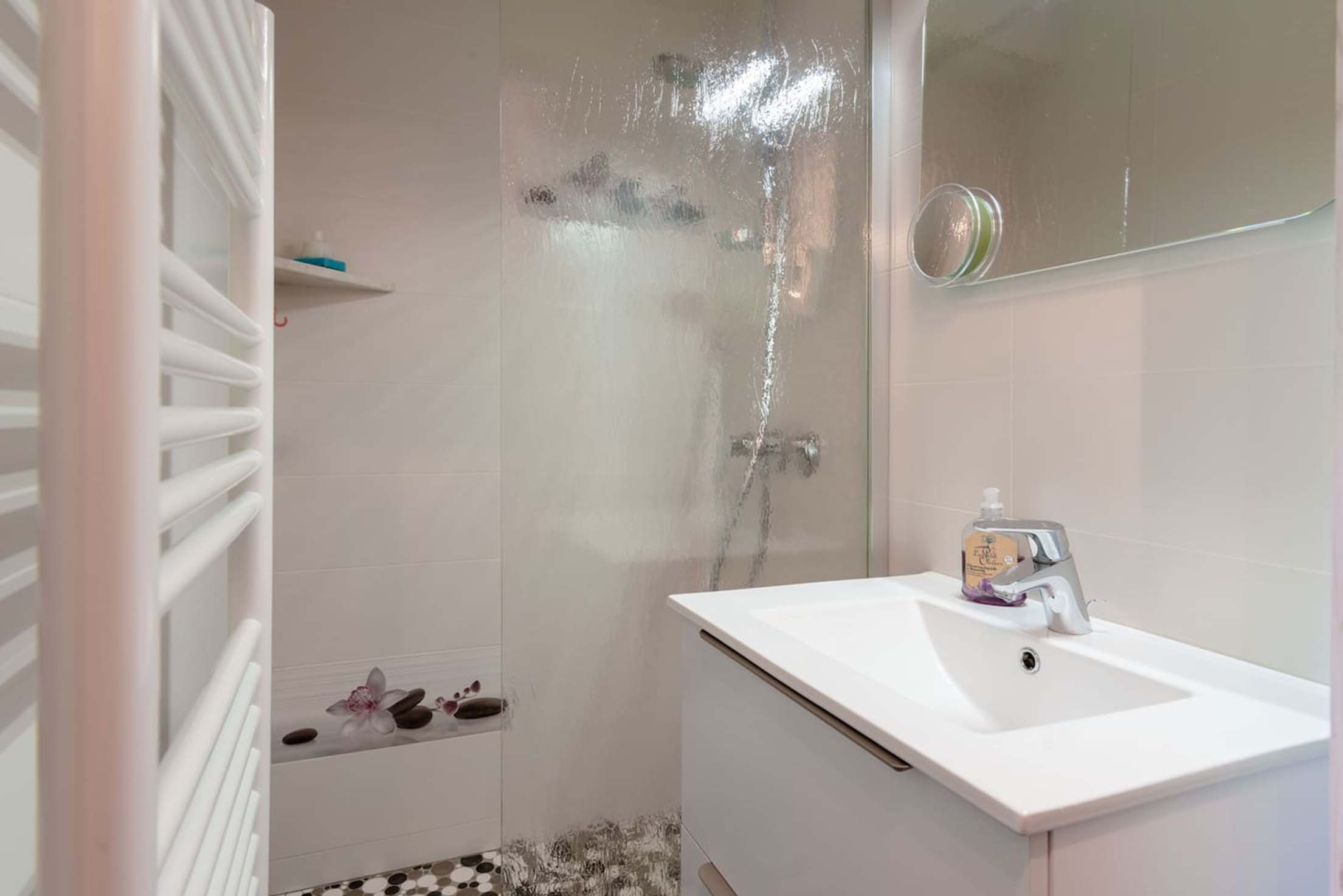1 petite salle de douche, radiateur sèche-serviettes, sèche-cheveux