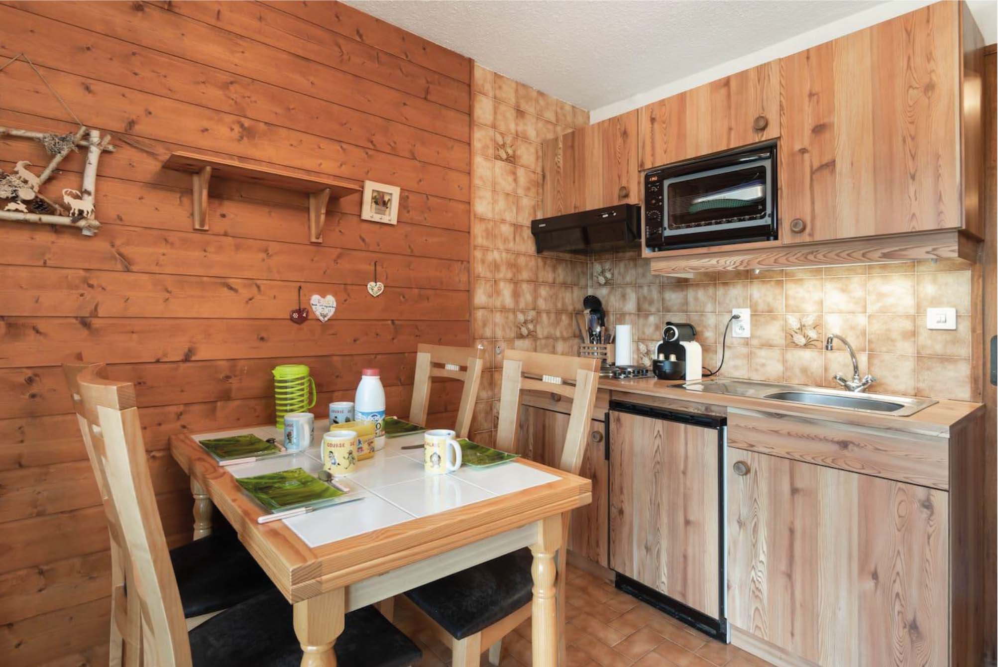 Joli petit chalet de 2 étages qui comprend une entrée avec rangements, une cuisine toute équipée ouverte sur le séjour avec un salon et son poêle à bois, le tout donnant accès à un balcon exposé plein sud.