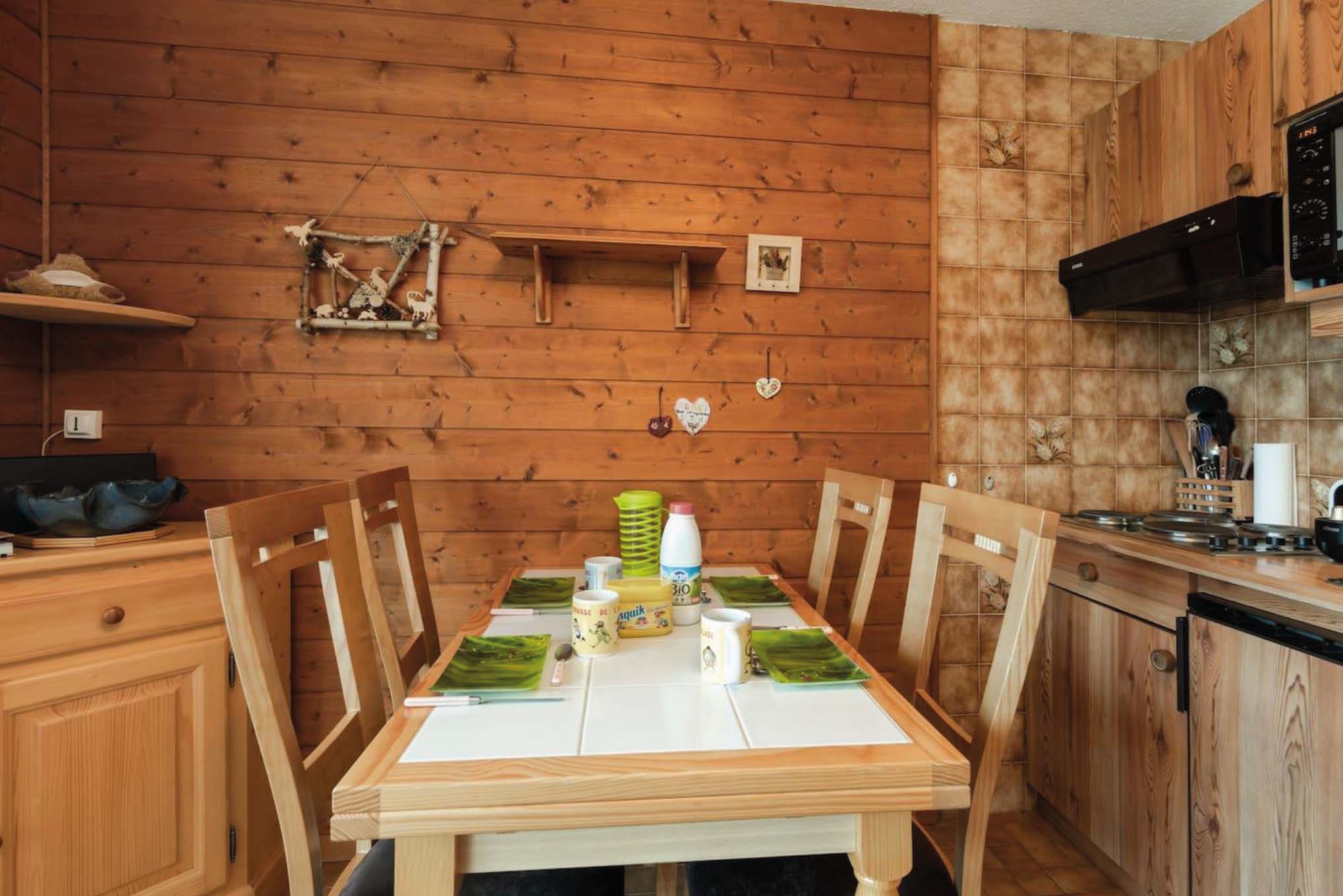 - Salle à manger et coin cuisine Table dressée et coin cuisine aménagé Crédit photo : Guémard