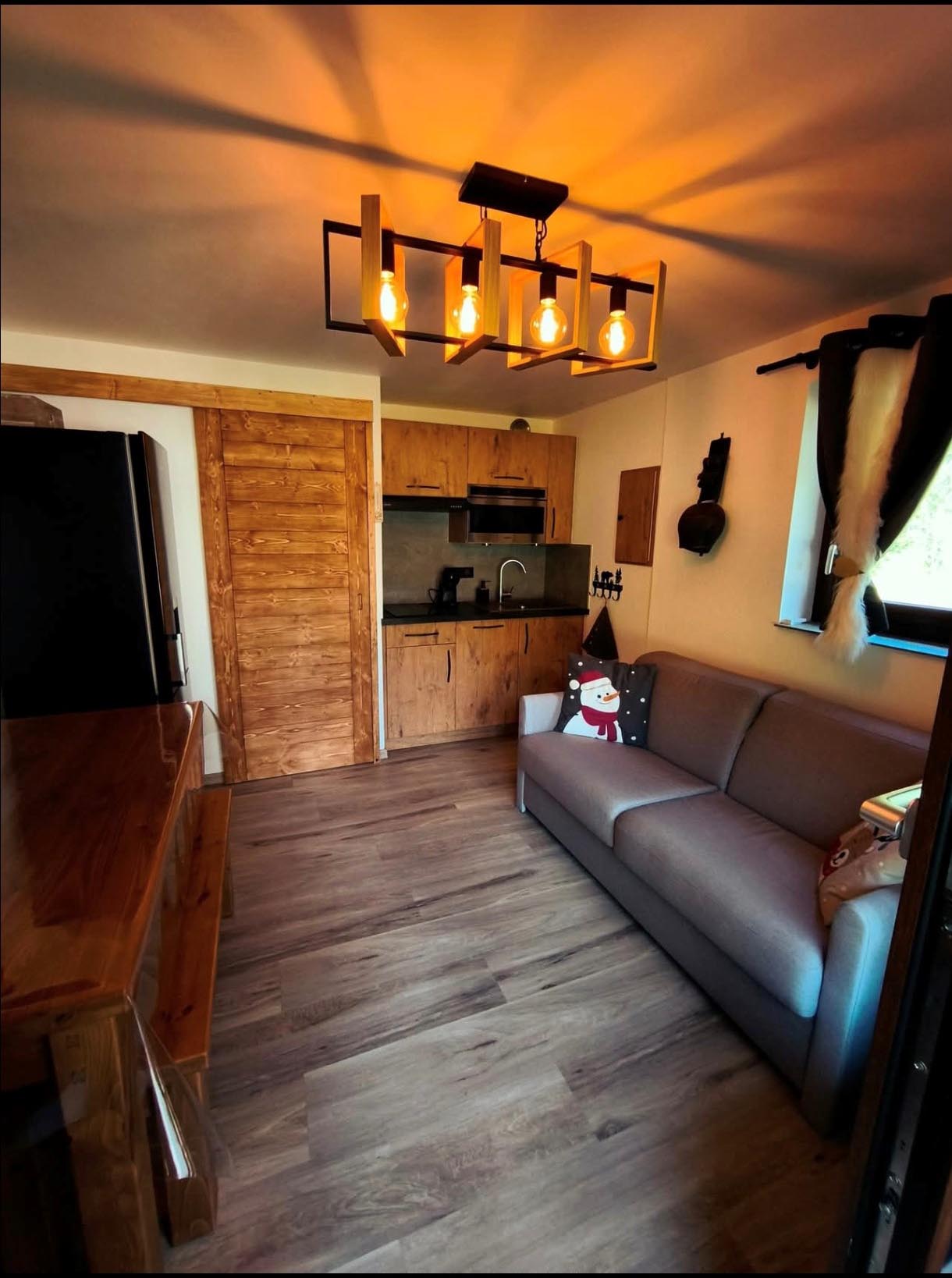 Joli petit chalet de 2 étages qui comprend une entrée avec rangements, une cuisine toute équipée ouverte sur le séjour avec un salon et son poêle à bois, le tout donnant accès à un balcon exposé plein sud.
