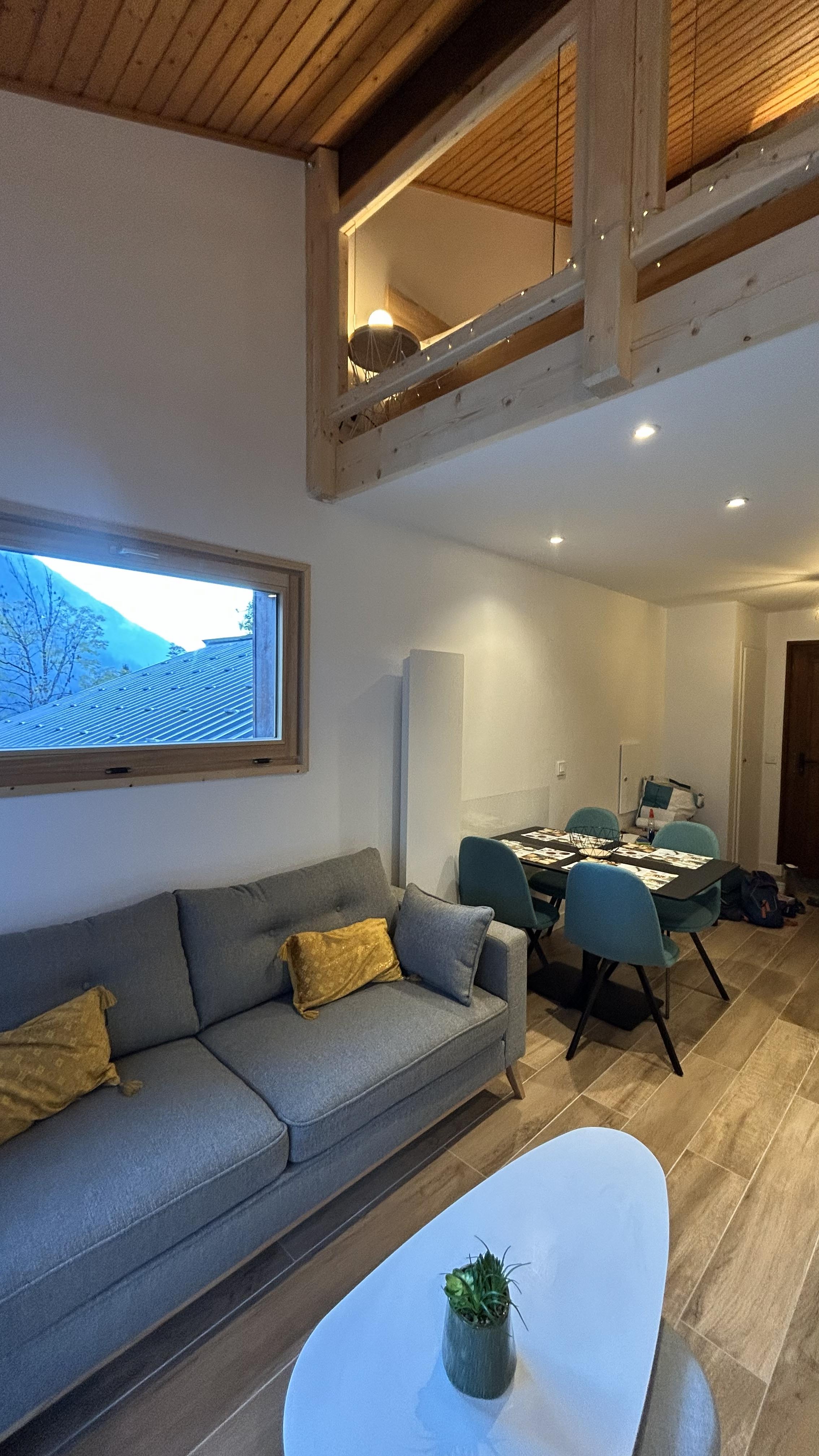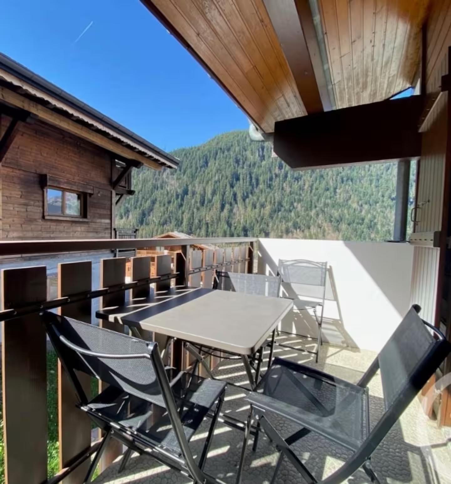 • Un salon lumineux avec balcon donnant sur les montagnes et la vallée (table, chaises et transats)