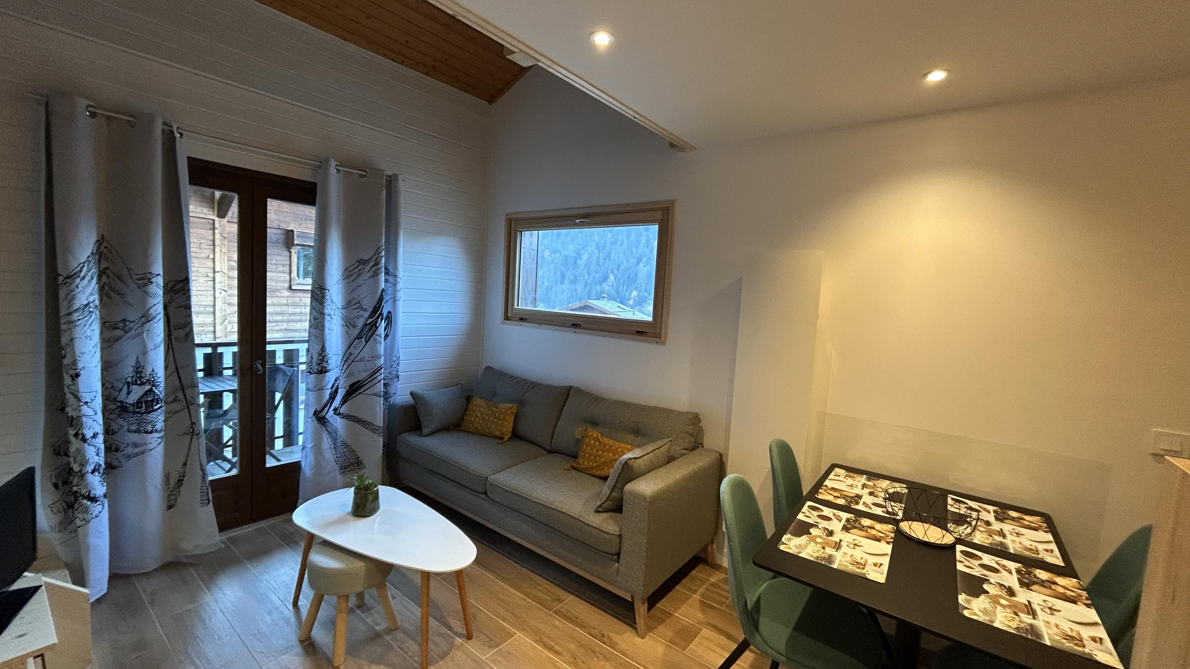 Très joli petit appartement en rez de jardin avec une terrasse exposée plein sud face au Mont de Grange.