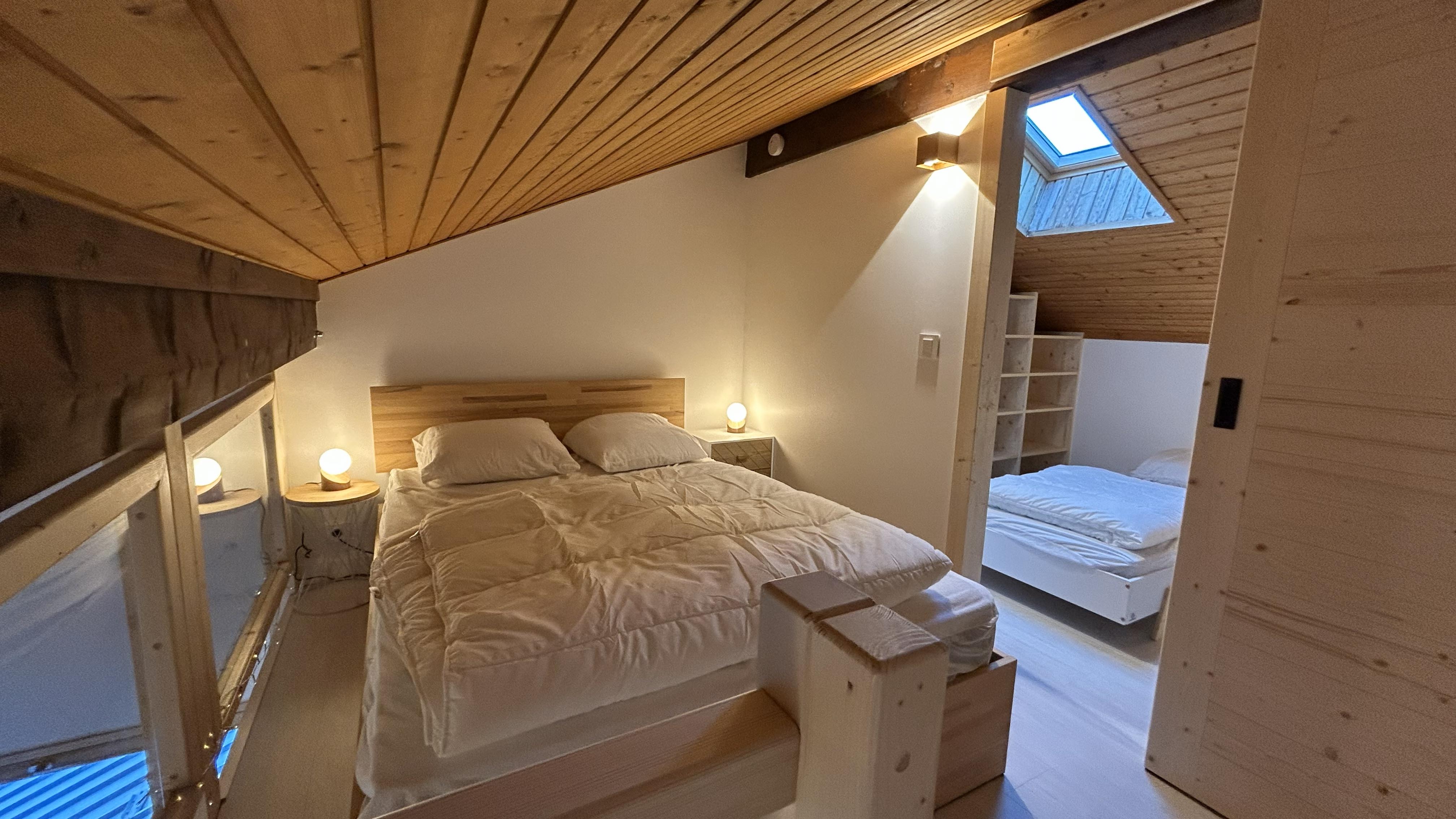 • Deux chambres confortables (1 lit double 140x200 en mezzanine + 2 lits simples 80x190 dans une chambre séparée à l'étage)