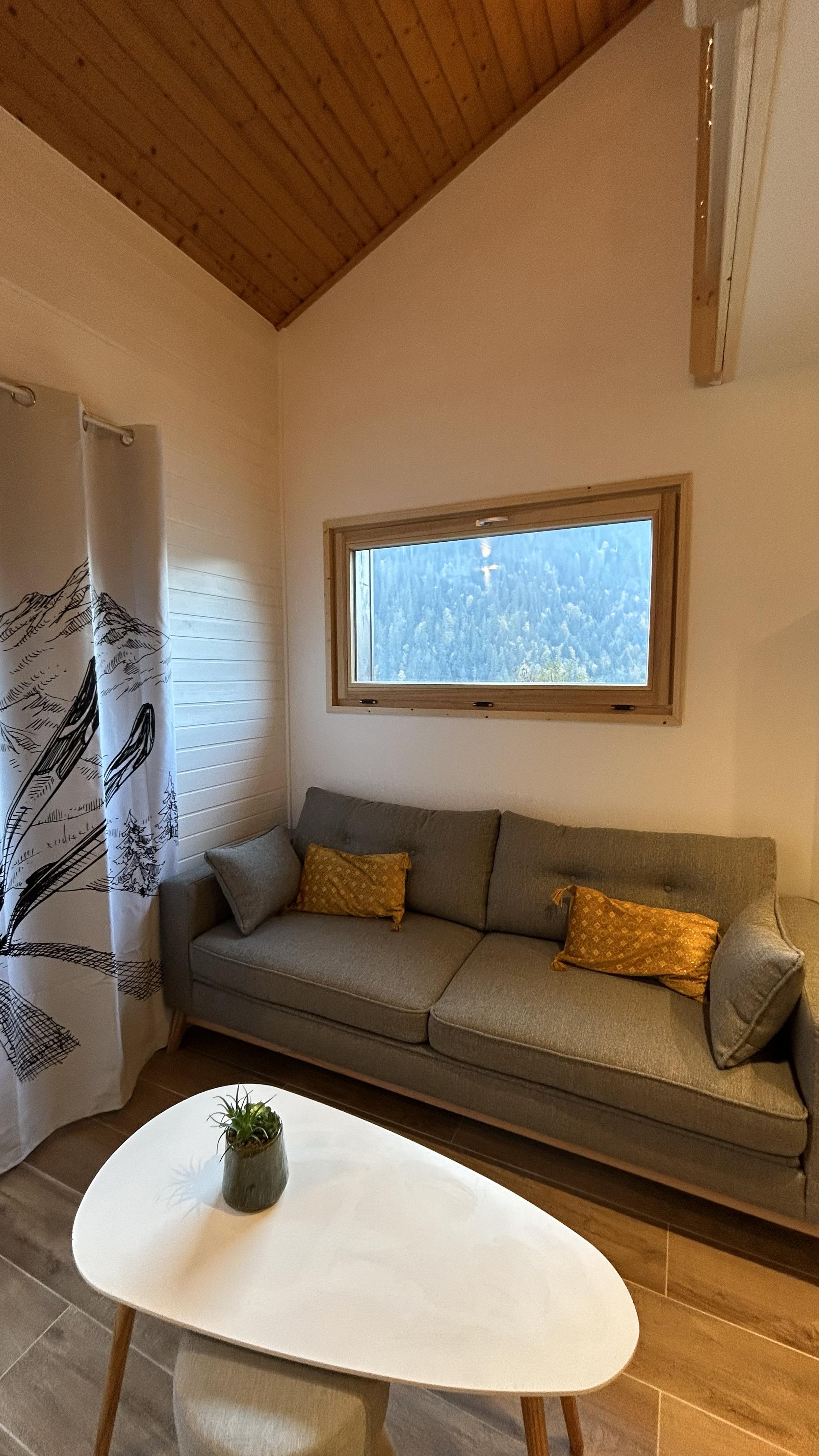 Joli petit chalet de 2 étages qui comprend une entrée avec rangements, une cuisine toute équipée ouverte sur le séjour avec un salon et son poêle à bois, le tout donnant accès à un balcon exposé plein sud.