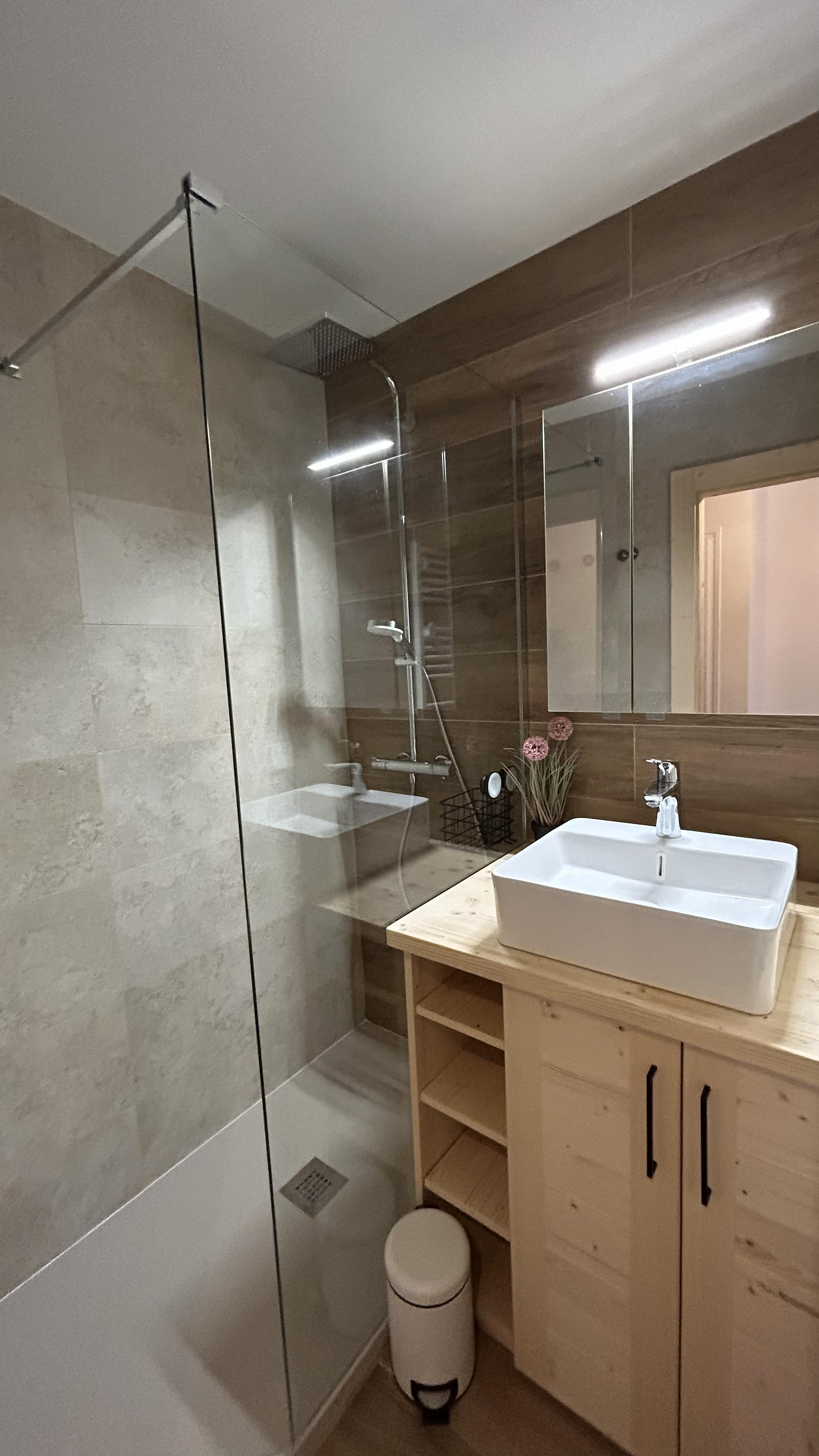• Une salle de bain moderne avec douche à l'italienne et lave-linge
