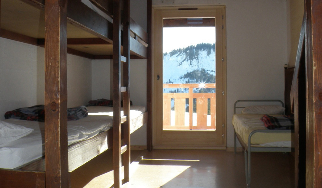 Les 6 chambres sont disposées de la même manière, avec deux douches, un WC, et 10 lits. Elles sont en mezzanines, avec 5 lits en bas et 5 lits en haut. Elles disposent toutes d’espaces de rangement et d’un accès à un balcon commun avec vue sur le Mont-Blanc.