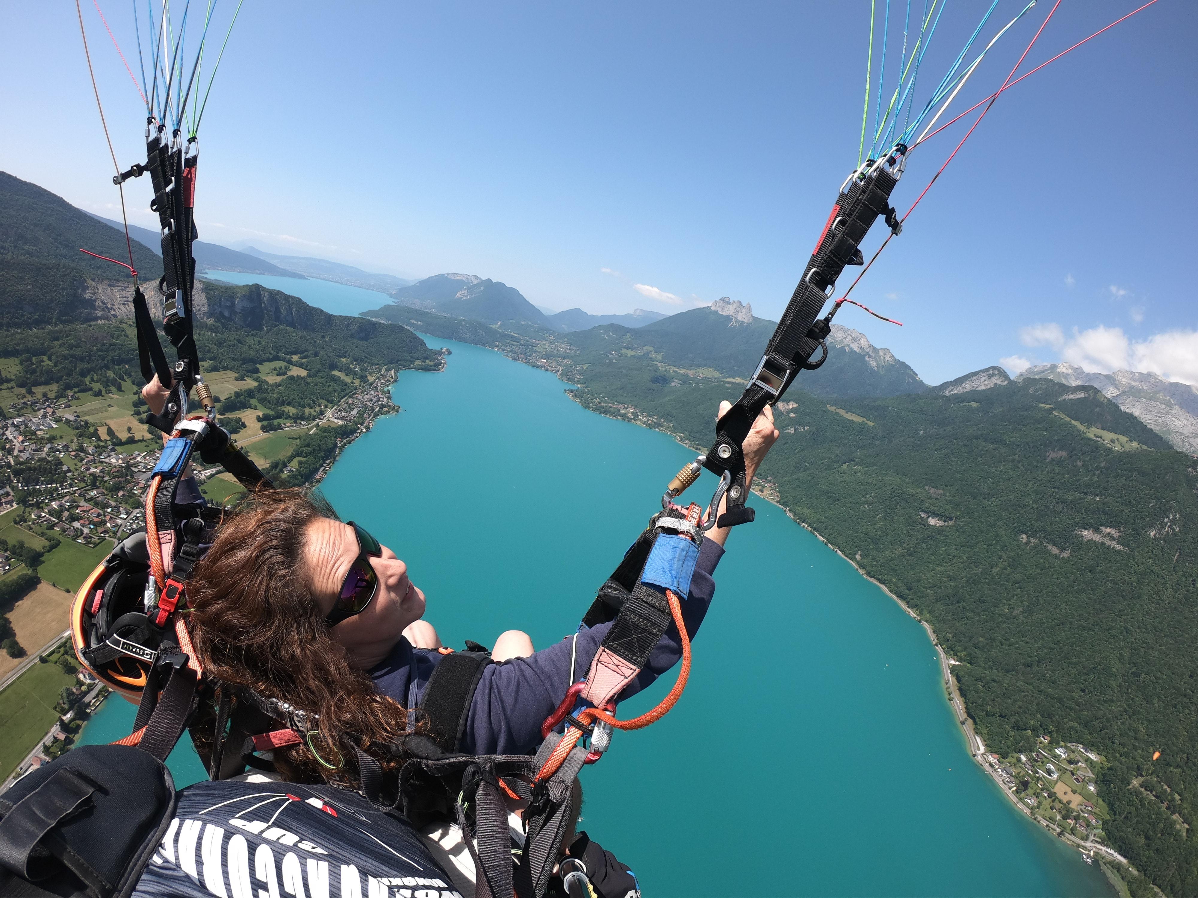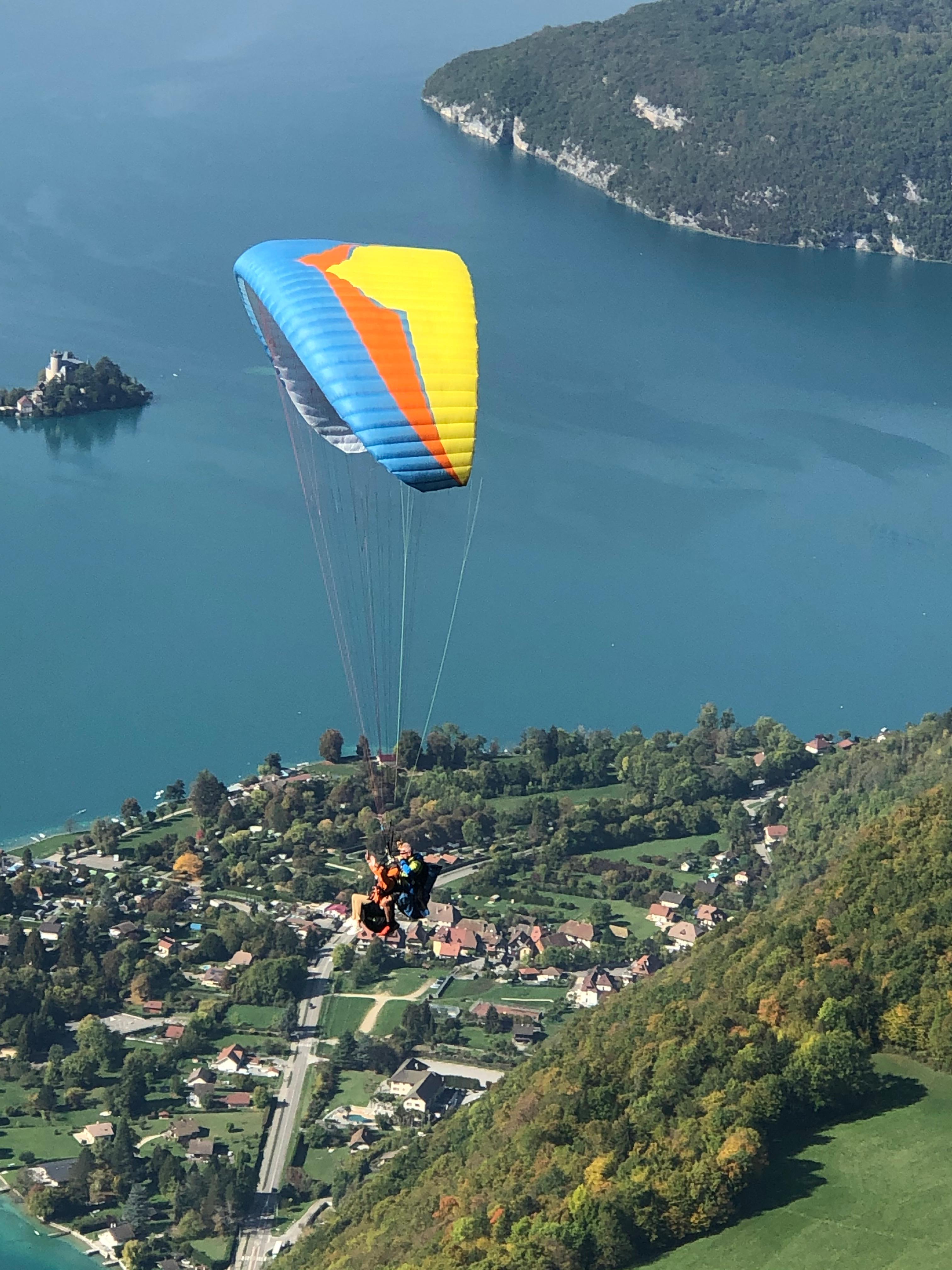 Premier contact avec l'air sur un vol de 800 mètres de dénivelé en conditions calmes où vous survolez le lac d'Annecy.