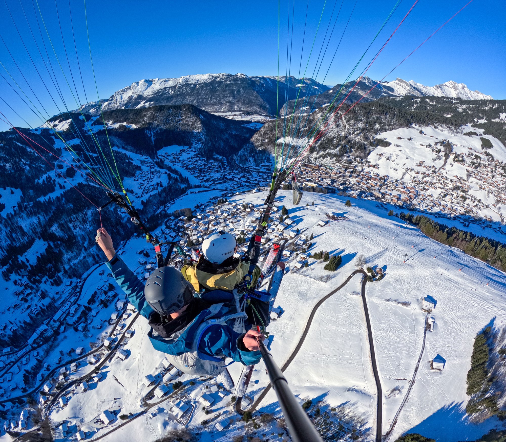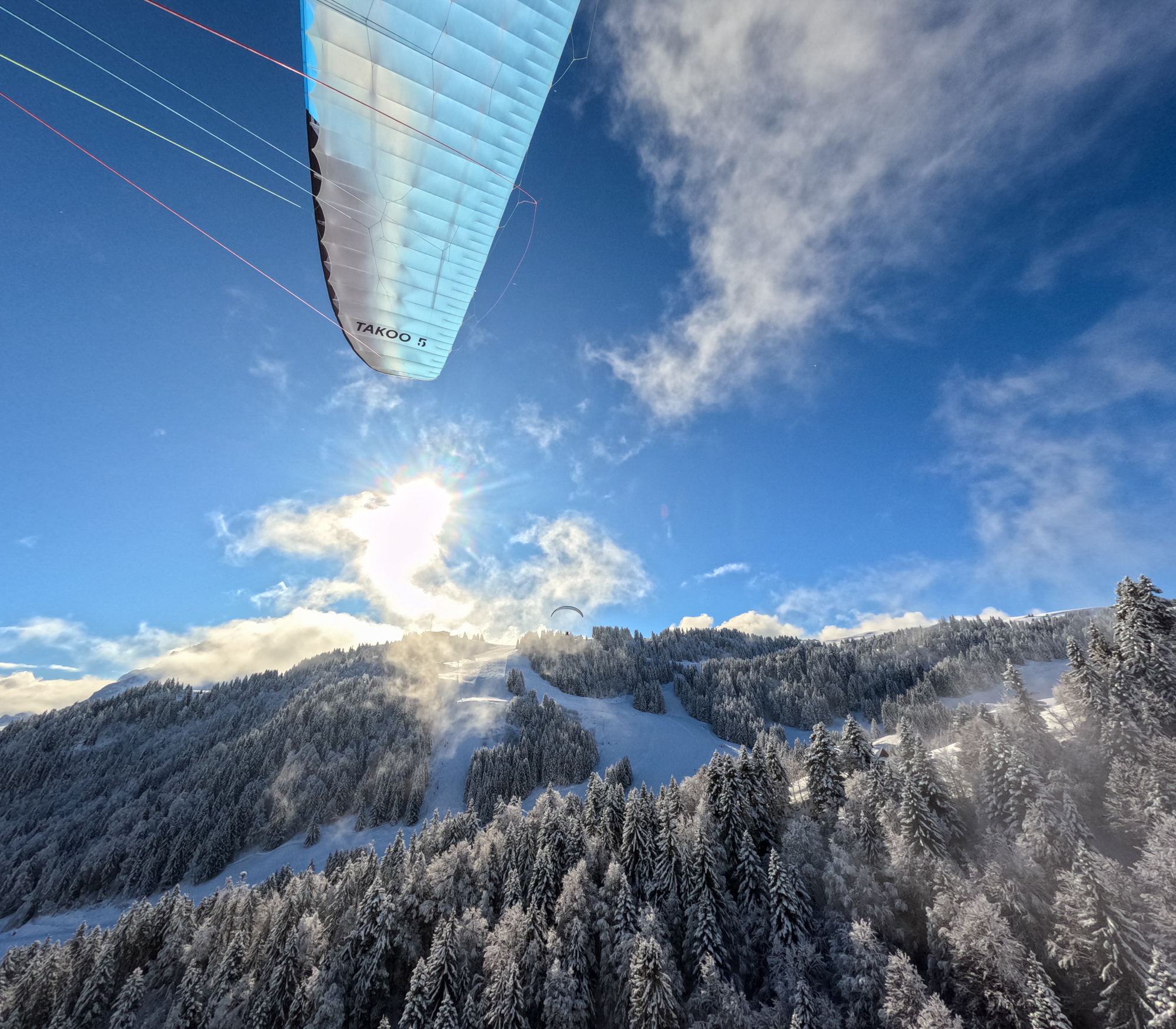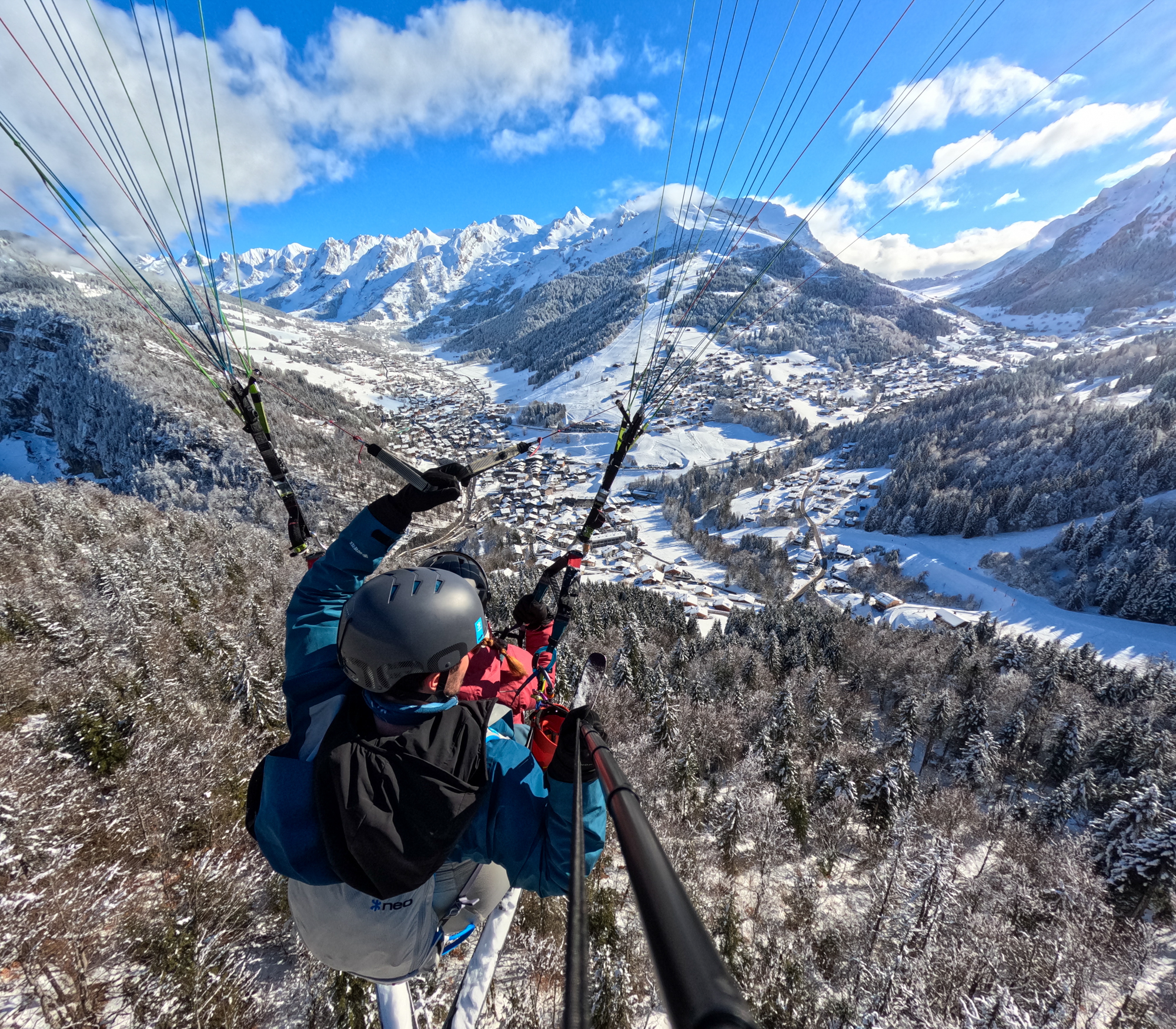 L'hiver au-dessus des pistes : L'un des plus beaux spots de Haute-Savoie ! Décollez à pied ou skis aux pieds depuis Beauregard, l'Aiguille ou le Crêt du Loup pour une sensation de liberté absolue et une vue imprenable sur le village et les Aravis.