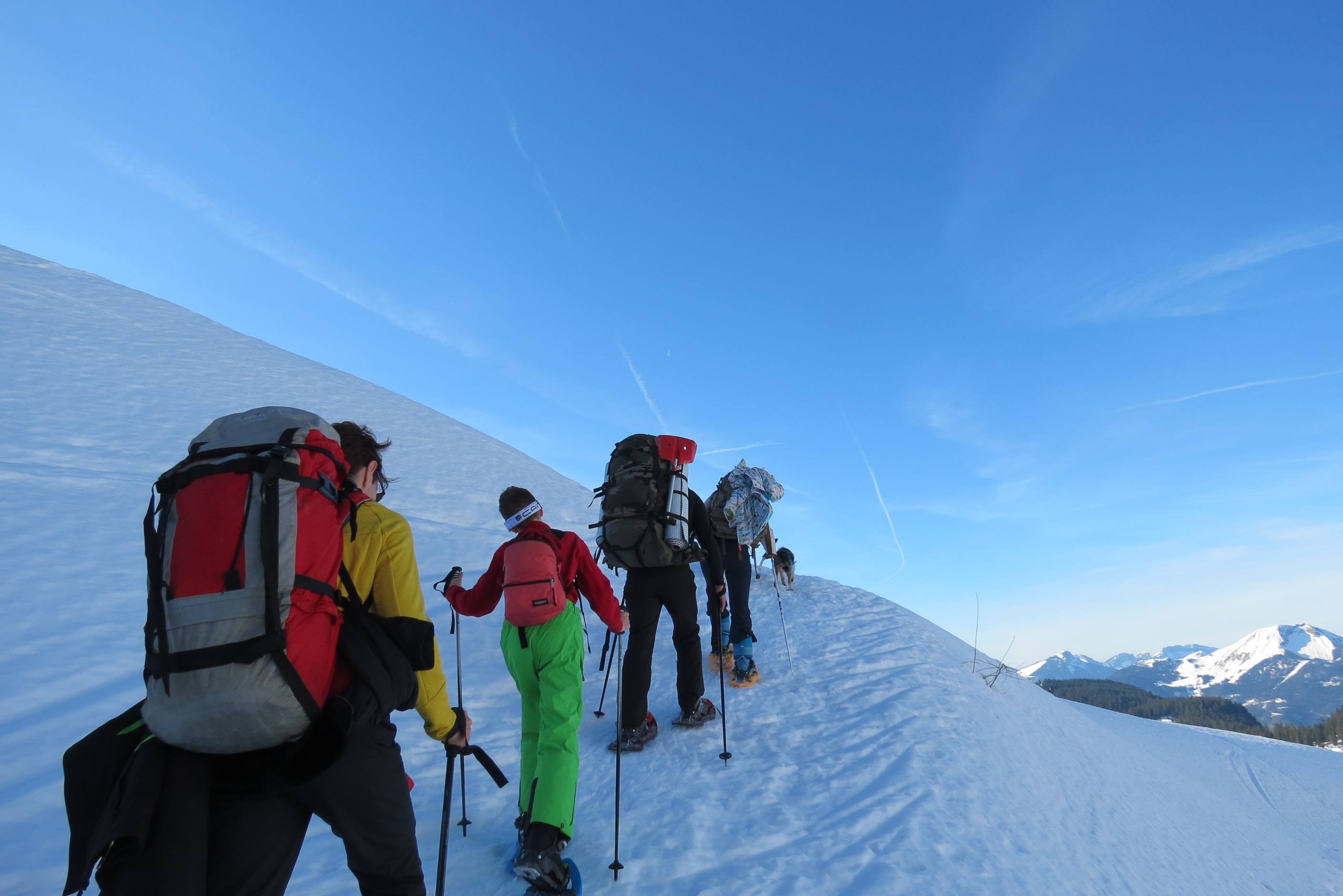 Dès l’aube, on reprend les raquettes pour atteindre un sommet et ainsi terminer cette “expé” !