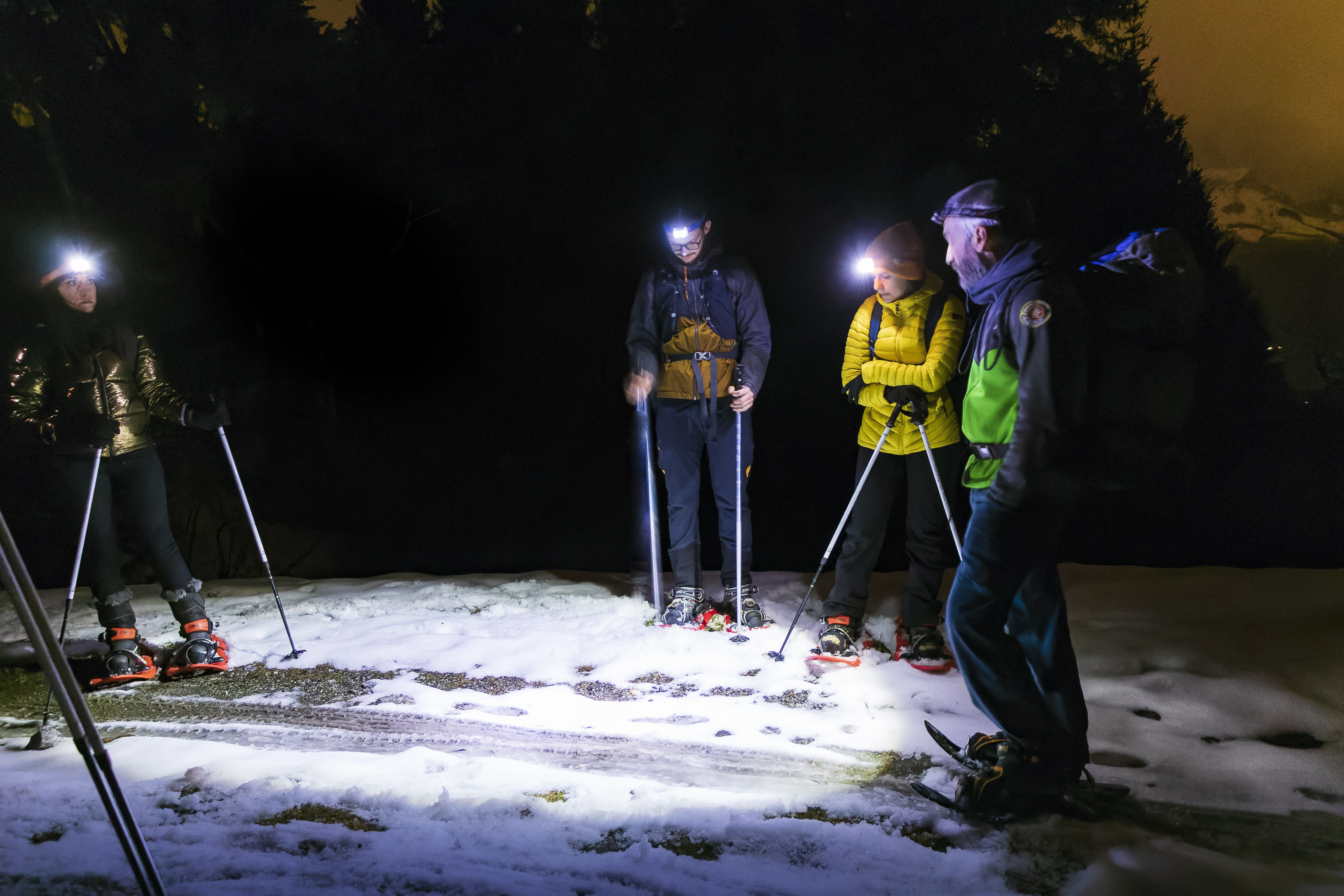 Départ pour une randonnée à la frontale à la tombée de la nuit.