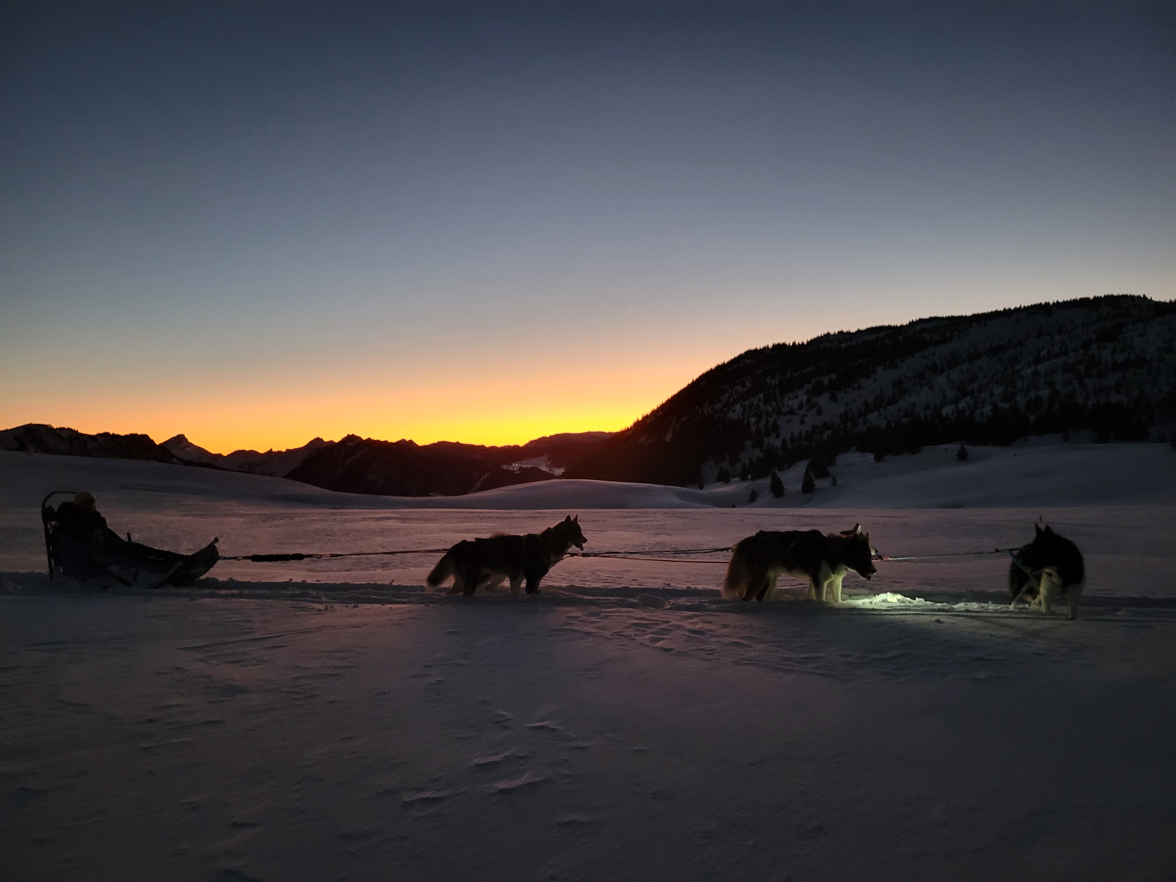 S’en suit une balade d’environ 1h15 de traineau avec une pause dans de magnifiques paysages sauvage et à l’́heure du coucher de soleil.