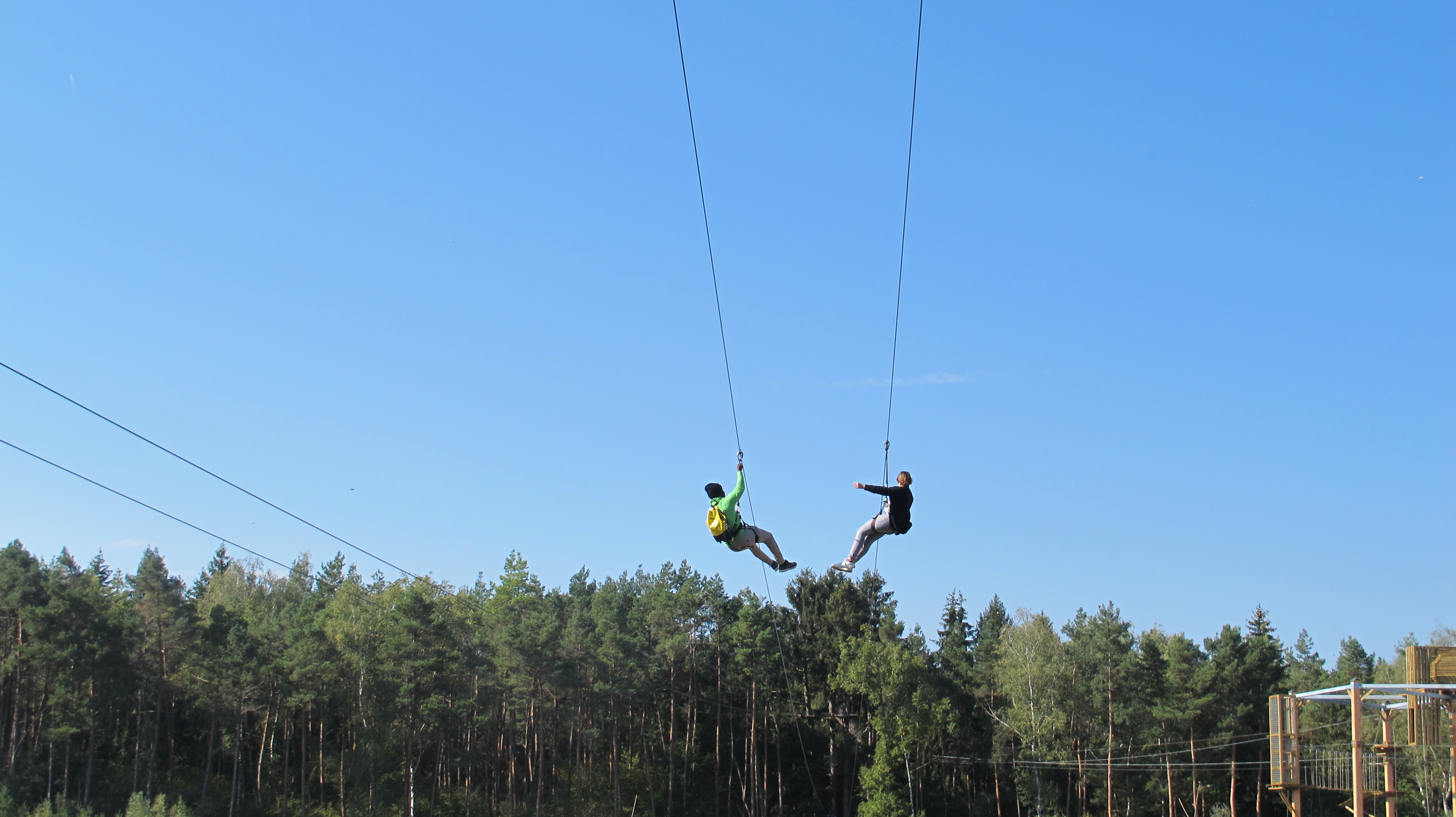Clou du spectacle : la double tyrolienne géante de 150m qui finalise le parcours.
