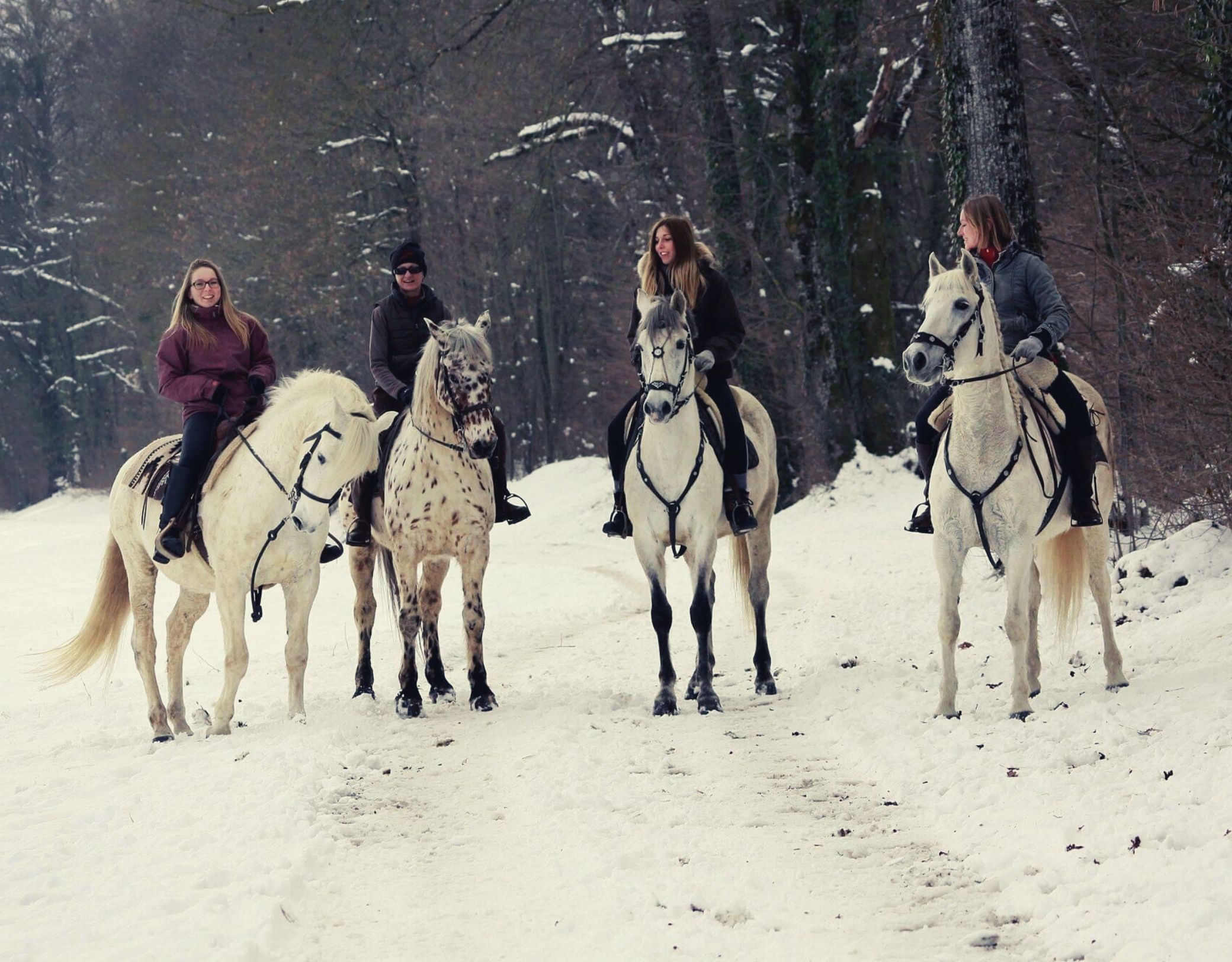 - Balade hivernale à cheval Écuries de Chevaline 4 cavalières sur 4 chevaux dans une forêt enneigée Crédit photo : Écuries de Chevaline