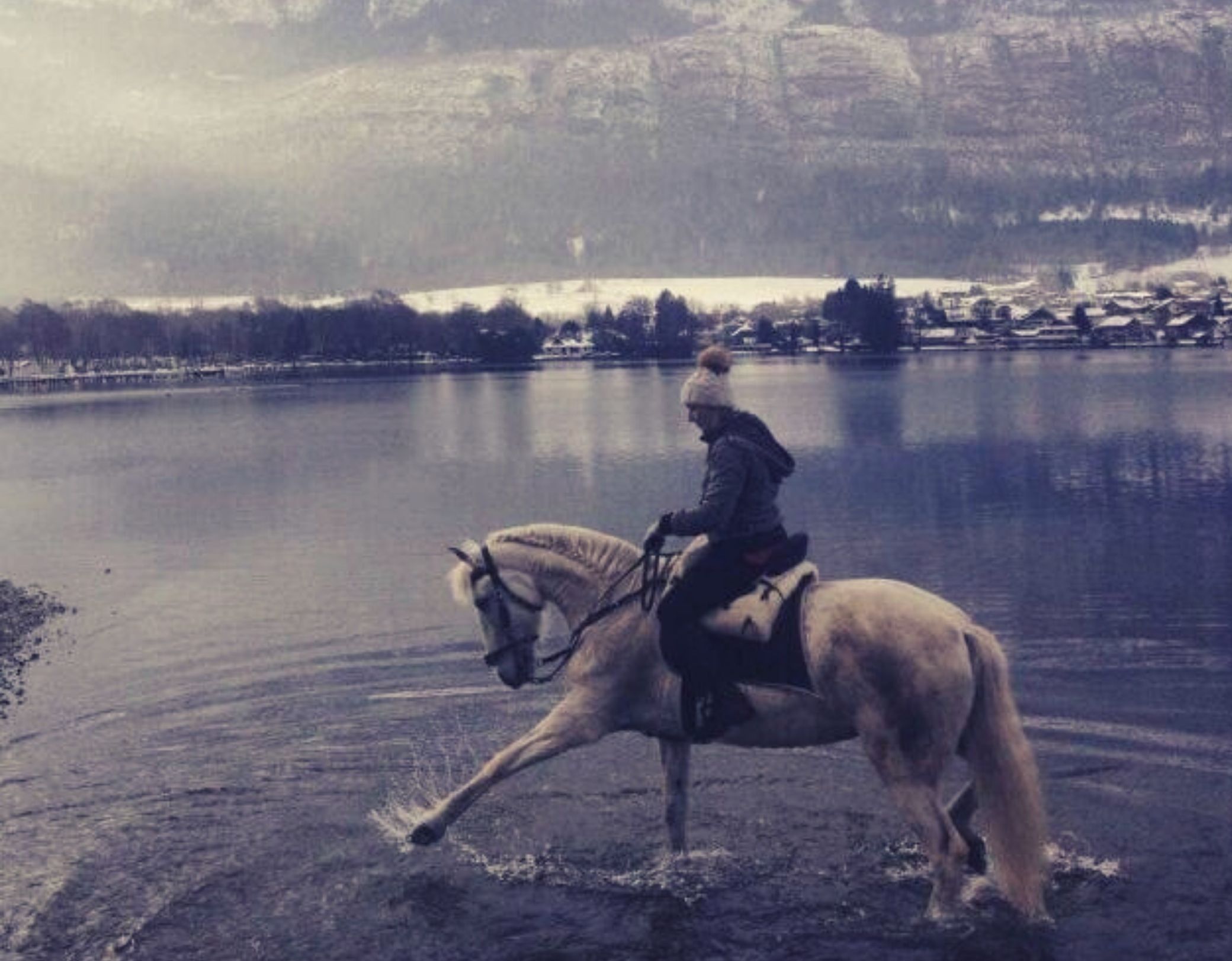 - Balade hivernale à cheval Écuries de Chevaline cavalier et cheval marchant dans l'eau en hiver Crédit photo : Écuries de Chevaline