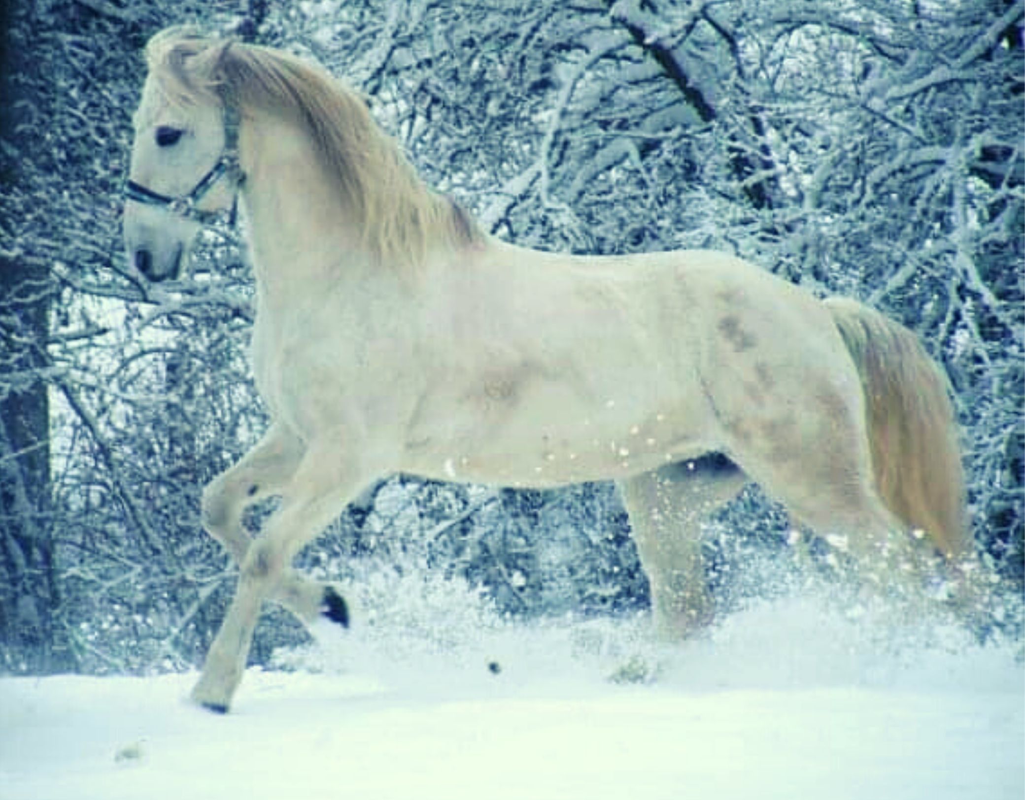 - Balade hivernale à cheval Écuries de Chevaline cheval blanc qui court dans la neige Crédit photo : Écuries de Chevaline