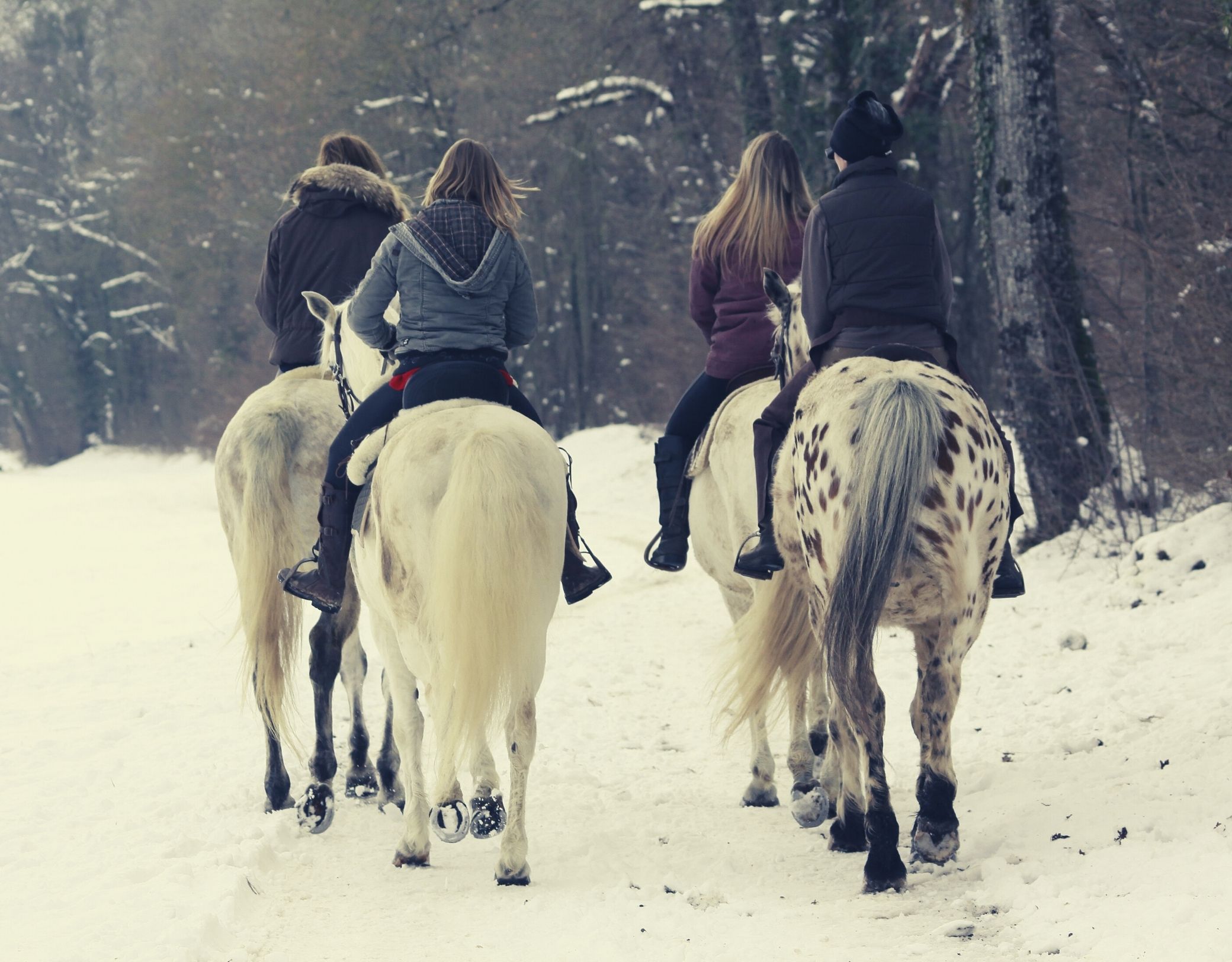 - Balade hivernale à cheval Écuries de Chevaline 4 cavalières sur 4 chevaux de dos dans une forêt enneigée Crédit photo : Écuries de Chevaline